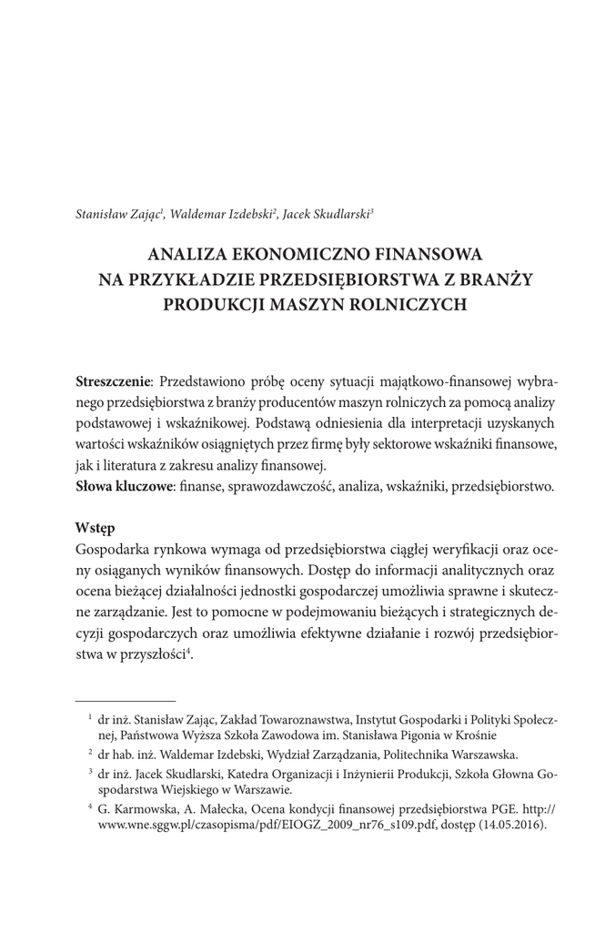 Stanisław Zając1, Waldemar Izdebski2, Jacek Skudlarski3 ANALIZA EKONOMICZNO FINANSOWA NA PRZYKŁADZIE PRZEDSIĘBIORSTWA Z BRANŻY PRODUKCJI MASZYN ROLNICZYCH Streszczenie: Przedstawiono próbę oceny sytuacji majątkowo-finansowej wybranego przedsiębiorstwa z branży producentów maszyn rolniczych za pomocą analizy podstawowej i wskaźnikowej. Podstawą odniesienia dla interpretacji uzyskanych wartości wskaźników osiągniętych przez firmę były sektorowe wskaźniki finansowe, jak i literatura z zakresu analizy finansowej. Słowa kluczowe: finanse, sprawozdawczość, analiza, wskaźniki, przedsiębiorstwo. Wstęp Gospodarka rynkowa wymaga od przedsiębiorstwa ciągłej weryfikacji oraz oceny osiąganych wyników finansowych. Dostęp do informacji analitycznych oraz ocena bieżącej działalności jednostki gospodarczej umożliwia sprawne i skuteczne zarządzanie. Jest to pomocne w podejmowaniu bieżących i strategicznych decyzji gospodarczych oraz umożliwia efektywne działanie i rozwój przedsiębiorstwa w przyszłości4. dr inż. Stanisław Zając, Zakład Towaroznawstwa, Instytut Gospodarki i Polityki Społecznej, Państwowa Wyższa Szkoła Zawodowa im. Stanisława Pigonia w Krośnie 2 dr hab. inż. Waldemar Izdebski, Wydział Zarządzania, Politechnika Warszawska. 3 dr inż. Jacek Skudlarski, Katedra Organizacji i Inżynierii Produkcji, Szkoła Głowna Gospodarstwa Wiejskiego w Warszawie. 4 G. Karmowska, A. Małecka, Ocena kondycji finansowej przedsiębiorstwa PGE. http:// www.wne.sggw.pl/czasopisma/pdf/EIOGZ_2009_nr76_s109.pdf, dostęp (14.05.2016). 1 386 Stanisław Zając, Waldemar Izdebski, Jacek Skudlarski Podejmowanie trafnych i szybkich decyzji gospodarczych wymaga stałego dopływu kompleksowych i rzetelnych informacji gospodarczych. Na ich podstawie podejmuje się zarówno decyzje strategiczne, a więc te, które określają podstawowe parametry układu gospodarczego, jak i decyzje taktyczne oraz operacyjne, dotyczące bieżącej działalności przedsiębiorstwa oraz likwidacji niepożądanych odchyleń od założonych wzorców. Informacje wykorzystywane w procesach decyzyjnych mogą mieć charakter syntetyczny i analityczny. Informacje syntetyczne są przetwarzane w oparciu o dostępne narzędzia rachunkowe i analityczne. Informacje analityczne służą wyjaśnianiu przyczyn zmian oraz skutków i czynników kształtujących wyniki ekonomiczne przedsiębiorstwa5. Analiza ekonomiczno-finansowa postrzegana jest jako najważniejsze narzędzie badawcze wykorzystywane do kontroli i oceny działalności przedsiębiorstwa pozwalające przedstawić sytuacje finansową firmy poprzez wielkości i wskaźniki ekonomiczne6. W artykule uwaga skupiona została na ocenie sytuacji majątkowo-finansowej wybranego przedsiębiorstwa z branży produkcji maszyn rolniczych w oparciu o dane zawarte w podstawowych sprawozdaniach finansowych, jakimi są bilans i rachunek zysków i strat. Zastosowaną metodą badań analitycznych informacji zawartych w sprawozdaniach była analiza wskaźnikowa, bazująca na wskaźnikach finansowych. Wybrano podstawowe wskaźnikami analizy finansowej. Szczegółowa analiza wymaga natomiast zbadania wielu pomocniczych wskaźników pozwalających na ocenę kondycji ekonomiczno-finansowej przedsiębiorstwa. Podstawą odniesienia dla wartości wskaźników osiągniętych przez badaną firmę były sektorowe wskaźniki finansowe7. Celem głównym artykułu było przedstawienie znaczenia roli sprawozdawczości finansowej oraz jej wpływu na ocenę wyników działalności przedsiębiorstwa. Celem pośrednim było przedstawienie terminologii związanej z analizą finansową, służącą do oceny sytuacji finansowej przedsiębiorstwa. R. Nesterowicz, Sprawozdawczość finansowa i jej rola w ocenie wyników działalności przedsiębiorstw, Wyd. Nierówności Społeczne a Wzrost Gospodarczy, nr 39 (3/2014), s. 320. 6 R. Kot, Sprawozdania finansowe jako źródło podstawowej informacji o działalności przedsiębiorstwa,http://www.wspia.eu/file/20352/13-KOT+RENATA.pdf. 7 Wskaźniki opracowywane są przez Komisję ds. Analizy Finansowej Rady Naukowej SKwP we współpracy z Wywiadownią Gospodarczą InfoCredit, która dysponuje i dostarcza bazę informacyjną. http://xn--rachunkowo-zhb12h.com.pl. 5 Analiza ekonomiczno finansowa na przykładzie przedsiębiorstwa… 387 Istota, znaczenie i zasady sporządzania sprawozdań finansowych Podstawowym źródłem informacji stanowiących podstawę podejmowania decyzji są sprawozdania finansowe. Są one sporządzane w układzie miesięcznym oraz rocznym. Dla okresu rocznego przedsiębiorstwa sporządzają bilans, rachunek zysków i strat oraz rachunek przepływów pieniężnych. Forma tych sprawozdań jest uregulowana prawnie. Bilans i rachunek zysków i strat stanowią podstawę do statystycznej i dynamicznej oceny stanu i wyników finansowych przedsiębiorstwa8. Artykuł 45 ust. 2 ustawy o rachunkowości mówi, że „sprawozdanie finansowe składa się z: 1. bilansu, 2. rachunku zysków i strat, 3. informacji dodatkowej, obejmującej wprowadzenie do sprawozdania finansowego oraz dodatkowe informacje i objaśnienia9. Bilans zawiera dane dotyczące zarówno majaku jednostki jak i źródeł jego finansowania. Umożliwia ocenę struktury aktywów i pasywów, zmianę ich dynamiki oraz informuje o zdolności zdolność przedsiębiorstwa do terminowego regulowania zobowiązań i stopnia suwerenności finansowej10. Bilans przedsiębiorstwa spełnia dwa zadania: jest dokumentem księgowym oraz sprawozdaniem finansowym11. Sporządzony jest on zazwyczaj w formie tabeli, której przykładem jest tabela 1. Bilans odpowiada na pytanie, czy w ciągu roku wzrosła wartość netto majątku (aktywa netto). Analiza płynności sporządzona na podstawie bilansu informuje, czy przedsiębiorstwo jest wystarczająco „płynne" – czy dysponuje odpowiednimi aktywami, które łatwo mogą być zamienione na środki pieniężne. Ponadto odpowiada na pyta