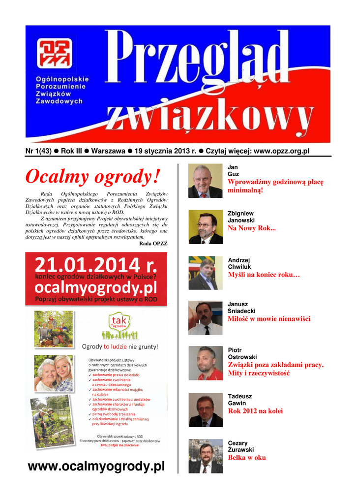 Nr 1(43) Rok III Warszawa 19 stycznia 2013 r. Czytaj więcej: www.opzz.org.pl Ocalmy ogrody! Rada Ogólnopolskiego Porozumienia Związków Zawodowych popiera działkowców z Rodzinnych Ogrodów Działkowych oraz organów statutowych Polskiego Związku Działkowców w walce o nową ustawę o ROD. Z uznaniem przyjmujemy Projekt obywatelskiej inicjatywy ustawodawczej. Przygotowanie regulacji odnoszących się do polskich ogrodów działkowych przez środowisko, którego one dotyczą jest w naszej opinii optymalnym rozwiązaniem. Rada OPZZ Jan Guz Wprowadźmy godzinową płacę minimalną! Zbigniew Janowski Na Nowy Rok... Andrzej Chwiluk Myśli na koniec roku… Janusz Śniadecki Miłość w mowie nienawiści Piotr Ostrowski Związki poza zakładami pracy. Mity i rzeczywistość Tadeusz Gawin Rok 2012 na kolei Cezary Żurawski www.ocalmyogrody.pl Belka w oku Jan Guz Zbigniew Janowski Wprowadźmy godzinową płacę minimalną! W ciągu ostatnich miesięcy pogarsza się sytuacja na rynku pracy. Rośnie bezrobocie, spadają realne wynagrodzenia i coraz większy odsetek pracowników zatrudnionych jest na umowy śmieciowe. OPZZ od wielu miesięcy przeciwstawia się negatywnym zjawiskom, niestety jednak rząd nie reaguje na nasze rady i ostrzeżenia. Mimo obietnic ograniczenia skali umów śmieciowych i wdrożenia pakietu antykryzysowego, Donald Tusk nie podjął żadnych działań na rzecz realizacji swoich deklaracji. Jeżeli rząd nie chce ograniczać skali umów cywilno-prawnych, to może niech przynajmniej postara się zminimalizować ich negatywne skutki. Obecnie pracownik zatrudniony na umowę o dzieło albo zlecenie nie ma żadnej gwarancji zatrudnienia, nie otrzymuje wynagrodzenia w czasie zwolnienia lekarskiego, nie ma prawa do urlopu, nie dotyczą go żadne regulacje płacowe. Dlatego proponuję wprowadzenie godzinowej płacy minimalnej. Wszak za każdą pracę należy się godna zapłata. Naszym zdaniem miesięczna płaca minimalna powinna stanowić co najmniej 50% płacy średniej. Obecnie przeciętne wynagrodzenie w Polsce wynosi 3510 zł brutto, a 50% tej kwoty to 1755 zł. Etatowy pracownik miesięcznie pracuje około 170 godzin. W związku z tym proponujemy, aby minimalna płaca godzinowa w naszym kraju wynosiła 10 zł brutto. W Irlandii, którą za przykład stawiał Pan Premier, jest to kwota ponad trzykrotnie wyższa. Dlatego liczymy, że tak pracodawcy, jak i strona rządowa wyjdą naprzeciw naszej inicjatywie. Przecież nikt nie powinien być zatrudniany na głodowych warunkach. Skala łamania praw pracowniczych jest już olbrzymia, nawet jeżeli pracownicy mają umowy etatowe. Pracownikom zatrudnionym na umowę o dzieło lub zlecenie szczególnie trudno dochodzić swoich praw. Dlatego chcemy tę sytuację zmienić i apelujemy do pracodawców i rządu o poparcie naszej inicjatywy. Przewodniczący OPZZ Jan Guz Czytajcie również blog Jana Guza: http://janguz.natemat.pl/ Na Nowy Rok... Rozpoczął się nowy rok. I jak zwykle zaczyna się od nadziei i obaw. Te pierwsze i drugie wiążą się zwykle z najbliższymi nam sprawami, z naszą rodziną, naszą pracą, często naszym zdrowiem. Te drugie dotyczą najczęściej spraw kraju, wydarzeń w Europie i na świecie. Rzadko wprost wiążemy jedne z drugimi. I nawet jeśli naprawdę zdajemy sobie sprawę z tego, że obydwie te sfery są wzajemnie powiązane to bronimy się przed tą wiedzą i emocjonalnie staramy się uczynić z naszego życia „wyspę” chronioną przed wpływem świata zewnętrznego, odporną na kryzys, biedę, globalne zagrożenia. To normalne i naturalne. Nie da się na co dzień żyć sprawami całego świata. Ale wszystko wskazuje na to, że w tym nowym roku to co „na zewnątrz” silniej niż dotychczas zapuka do naszych drzwi. Polska już nie jest „zieloną wyspą” w europejskim kryzysie. I nie będziemy już prymusem w unijnym wzroście gospodarczym. Co nie znaczy, że we własnym domu i we własnym kraju powinniśmy usiąść i poczekać na lepsze czasy, liczyć na to, że gdy poprawi się u innych to poprawi się też u nas. To jest czas życzeń na Nowy Rok dla nas, ale też dla naszych sektorów. I oczywiście możemy sobie życzyć, żeby w budownictwie wróciła dobra koniunktura z minionych lat, żeby było dużo dobrych miejsc pracy, żeby wszyscy wszystkim płacili w terminie, nie oszukiwali się w całym łańcuchu od inwestora (także państwowego) po najmniejszego podwykonawcę. Chcemy sobie życzyć, żeby firmy przemysłu wyrobów budowlanych mogły wykorzystać cały swój potencjał i miały gdzie sprzedać swą produkcję. Powinniśmy życzyć tego samego drzewiarzom i meblarzom uzależnionym w dużej mierze od popytu w innych krajach Europy. Ale przecież wiemy, że polskie budownictwo uzależnione jest od stanu całej gospodarki, od firm wielu sektorów, które ostatnio przestały inwestować. I zależne jest także od rządowych zamówień infrastrukturalnych, które pozostają wielką niewiadomą. Zależne jest też od dobrego prawa i programów społecznych w sferze mieszkaniowej. Polski rynek materiałów budowlanych zależny jest od tego samego. Cement, wapno, gips czy kruszywo nie będą się sprzedawać, jeśli nie będzie inwestycji. Przemysł drzewny i meblarski jest zależny w dużej mierze od popytu zagranicznego i powiązany z europejskimi sieciami produkcji i zbytu. Krajowy rynek będzie miał dla niego duże znaczenie, jeśli będą mieszkania, które można wyposażyć i ludzie, którzy będą mieli za co wyroby tego przemysłu kupić. Leśnikom możemy życzyć tego, aby nie było gorzej i żeby nikt znowu nie zaczął kombinować wokół struktury i własności Lasów Państwowych. O czym piszą związkowcy nr 1(43) 19 stycznia 2013 2 Czyli można dużo życzyć i nic nie można zrobić? Można, i to bardzo wiele. Czas więc na prawdziwe życzenia dla naszych branż i sektorów. Życzymy sobie, aby panie i panowie, których wynajęliśmy na kilka lat do pracy w
