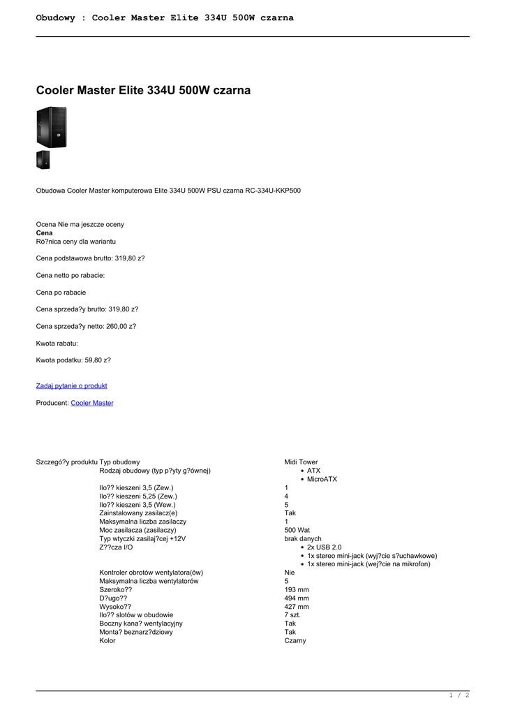 Obudowy : Cooler Master Elite 334U 500W czarna Cooler Master Elite 334U 500W czarna Obudowa Cooler Master komputerowa Elite 334U 500W PSU czarna RC-334U-KKP500 Ocena Nie ma jeszcze oceny Cena Ró?nica ceny dla wariantu Cena podstawowa brutto: 319,80 z? Cena netto po rabacie: Cena po rabacie Cena sprzeda?y brutto: 319,80 z? Cena sprzeda?y netto: 260,00 z? Kwota rabatu: Kwota podatku: 59,80 z? Zadaj pytanie o produkt Producent: Cooler Master Szczegó?y produktu Typ obudowy Rodzaj obudowy (typ p?yty g?ównej) Ilo?? kieszeni 3,5 (Zew.) Ilo?? kieszeni 5,25 (Zew.) Ilo?? kieszeni 3,5 (Wew.) Zainstalowany zasilacz(e) Maksymalna liczba zasilaczy Moc zasilacza (zasilaczy) Typ wtyczki zasilaj?cej +12V Z??cza I/O Kontroler obrotów wentylatora(ów) Maksymalna liczba wentylatorów Szeroko?? D?ugo?? Wysoko?? Ilo?? slotów w obudowie Boczny kana? wentylacyjny Monta? beznarz?dziowy Kolor Midi Tower ATX MicroATX 1 4 5 Tak 1 500 Wat brak danych 2x USB 2.0 1x stereo mini-jack (wyj?cie s?uchawkowe) 1x stereo mini-jack (wej?cie na mikrofon) Nie 5 193 mm 494 mm 427 mm 7 szt. Tak Tak Czarny 1 / 2 Obudowy : Cooler Master Elite 334U 500W czarna 2 / 2 Powered by TCPDF (www.tcpdf.org)
