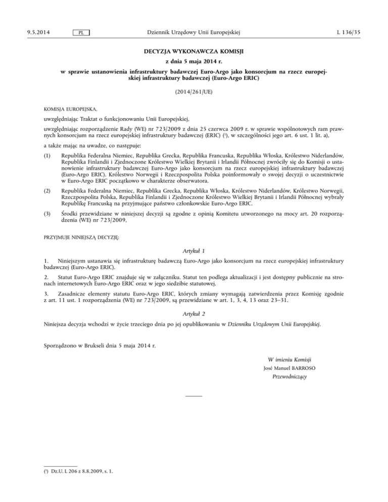 9.5.2014 PL Dziennik Urzędowy Unii Europejskiej L 136/35 DECYZJA WYKONAWCZA KOMISJI z dnia 5 maja 2014 r. w sprawie ustanowienia infrastruktury badawczej Euro-Argo jako konsorcjum na rzecz europej skiej infrastruktury badawczej (Euro-Argo ERIC) (2014/261/UE) KOMISJA EUROPEJSKA, uwzględniając Traktat o funkcjonowaniu Unii Europejskiej, uwzględniając rozporządzenie Rady (WE) nr 723/2009 z dnia 25 czerwca 2009 r. w sprawie wspólnotowych ram praw nych konsorcjum na rzecz europejskiej infrastruktury badawczej (ERIC) (1), w szczególności jego art. 6 ust. 1 lit. a), a także mając na uwadze, co następuje: (1) Republika Federalna Niemiec, Republika Grecka, Republika Francuska, Republika Włoska, Królestwo Niderlandów, Republika Finlandii i Zjednoczone Królestwo Wielkiej Brytanii i Irlandii Północnej zwróciły się do Komisji o usta nowienie infrastruktury badawczej Euro-Argo jako konsorcjum na rzecz europejskiej infrastruktury badawczej (Euro-Argo ERIC). Królestwo Norwegii i Rzeczpospolita Polska poinformowały o swojej decyzji o uczestnictwie w Euro-Argo ERIC początkowo w charakterze obserwatora. (2) Republika Federalna Niemiec, Republika Grecka, Republika Włoska, Królestwo Niderlandów, Królestwo Norwegii, Rzeczpospolita Polska, Republika Finlandii i Zjednoczone Królestwo Wielkiej Brytanii i Irlandii Północnej wybrały Republikę Francuską na przyjmujące państwo członkowskie Euro-Argo ERIC. (3) Środki przewidziane w niniejszej decyzji są zgodne z opinią Komitetu utworzonego na mocy art. 20 rozporzą dzenia (WE) nr 723/2009, PRZYJMUJE NINIEJSZĄ DECYZJĘ: Artykuł 1 1. Niniejszym ustanawia się infrastrukturę badawczą Euro-Argo jako konsorcjum na rzecz europejskiej infrastruktury badawczej (Euro-Argo ERIC). 2. Statut Euro-Argo ERIC znajduje się w załączniku. Statut ten podlega aktualizacji i jest dostępny publicznie na stro nach internetowych Euro-Argo ERIC oraz w jego siedzibie statutowej. 3. Zasadnicze elementy statutu Euro-Argo ERIC, których zmiany wymagają zatwierdzenia przez Komisję zgodnie z art. 11 ust. 1 rozporządzenia (WE) nr 723/2009, są przewidziane w art. 1, 3, 4, 13 oraz 23–31. Artykuł 2 Niniejsza decyzja wchodzi w życie trzeciego dnia po jej opublikowaniu w Dzienniku Urzędowym Unii Europejskiej. Sporządzono w Brukseli dnia 5 maja 2014 r. W imieniu Komisji José Manuel BARROSO Przewodniczący (1) Dz.U. L 206 z 8.8.2009, s. 1. L 136/36 PL Dziennik Urzędowy Unii Europejskiej 9.5.2014 ZAŁĄCZNIK STATUT EURO-ARGO ERIC Republika Federalna Niemiec, Republika Grecka, Republika Francuska, Republika Włoska, Królestwo Niderlandów, Republika Finlandii, Zjednoczone Królestwo Wielkiej Brytanii i Irlandii Północnej, zwane dalej indywidualnie „członkiem założycielem”, a wspólnie „członkami założycielami”, oraz: Królestwo Norwegii, Rzeczpospolita Polska, zwane dalej indywidualnie „obserwatorem założycielem”, a wspólnie „obserwatorami założycielami”, ZWAŻYWSZY, że zmiana klimatu należy do najpoważniejszych problemów naszego wieku, zrozumienie i przewidywanie zmian zachodzących zarówno w atmosferze, jak i oceanie jest niezbędne do wyznaczenia kierunków działań międzyna rodowych i optymalizacji rządowych strategii politycznych w zakresie zmiany klimatu, a tego rodzaju zrozumienie wymaga gromadzenia zestawów najwyższej jakości danych z całego świata, ZWAŻYWSZY, że wymagane obserwacje oceanu in situ, które muszą być prowadzone nieprzerwanie przez długi czas, są poza zasięgiem pojedynczych zespołów badawczych i państw, w celu sprostania temu wyzwaniu opracowano Globalny System Obserwacji Oceanów — międzynarodowy program Argo, który jest pierwszą w historii oceanografii globalną siecią obserwacji oceanu in situ, stanowiącą istotne uzupełnienie systemów satelitarnych, ZWAŻYWSZY, że w przypadku tak dużego przedsięwzięcia sukces można osiągnąć wyłącznie przy bardzo wysokim stopniu współpracy międzynarodowej, Euro-Argo opracuje i umocni europejski komponent tej globalnej sieci. Szcze gólne interesy europejskie również wymagają intensywniejszego pobierania próbek w morzach niektórych regionów. Ogólnie infrastruktura Euro-Argo powinna składać się z około 800 sond profilujących działających w danym momencie. Utrzymanie takiego systemu sond wymaga, aby Europa rozmieszczała około 250 sond rocznie, ZWAŻYWSZY, że infrastruktura badawcza Euro-Argo zwiększy europejską doskonałość i wiedzę fachową w zakresie badań klimatu oraz ustanowi wysoki poziom współpracy między partnerami europejskimi we wszystkich aspektach realizacji: operacjach na morzu, monitorowaniu systemu sond i jego zmianach, postępu technologicznego i naukowego, poprawie dostępu do danych na potrzeby badań i usług morskich europejskiego programu monitorowania Ziemi/Coper nicus, koordynacji wkładu europejskiego w międzynarodowe zarządzanie programem Argo, PRAGNĄC, aby istniejące ustalenia dotyczące współpracy zostały przeniesione do organu z osobowością prawną oddziel nego od jego członków w celu zwiększenia współpracy, umożliwienia Euro-Argo zawierania umów we własnym imieniu, w tym na zakup sond i innego mienia, towarów lub usług, oraz uzupełnienia i wzmocnienia sprawowania rządów usta nowionych przez międzynarodowy program Argo, WNOSZĄC do Komisji Europejskiej o ustanowienie infrastruktury Euro-Argo jako konsorcjum na rzecz europejskiej infrastruktury badawczej (Euro-Argo ERIC), 9.5.2014 PL Dziennik Urzędowy Unii Europejskiej L 136/37 UZGADNIAJĄ, CO NASTĘPUJE: ROZDZIAŁ 1 POSTANOWIENIA OGÓLNE Artykuł 1 Nazwa i siedziba 1. Nazwą konsorcjum jest Euro-Argo ERIC, zarejestrowane jako konsorcjum na rzecz europejskiej infrastruktury badawczej, dalej zwane „Euro-Argo ERIC”. 2. Siedzibą statutową Euro-Argo ERIC jest Plouzané we Francji („siedziba statutowa”). 3. Co najmniej raz na pięć lat Rada rozważa, czy siedziba statutowa pozostaje we Fra