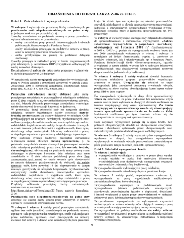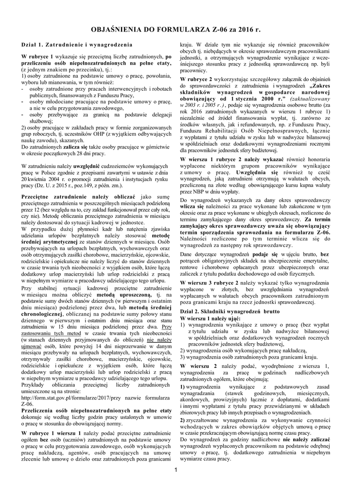 OBJAŚNIENIA DO FORMULARZA Z-06 za 2016 r. kraju. W dziale tym nie wykazuje się również pracowników obcych tj. niebędących w okresie sprawozdawczym pracownikami jednostki, a otrzymujących wynagrodzenie wynikające z wcześniejszego stosunku pracy z jednostką sprawozdawczą np. byli pracownicy. Dział 1. Zat rudnienie i wynagrod ze nia W rubryce 1 wykazuje się przeciętną liczbę zatrudnionych, po przeliczeniu osób niepełnozatrudnionych na pełne etaty, (z jednym znakiem po przecinku), tj.: 1) osoby zatrudnione na podstawie umowy o pracę, powołania, wyboru lub mianowania, w tym również: - osoby zatrudnione przy pracach interwencyjnych i robotach publicznych, finansowanych z Funduszu Pracy, - osoby młodociane pracujące na podstawie umowy o pracę, a nie w celu przygotowania zawodowego, - osoby przebywające za granicą na podstawie delegacji służbowej; 2) osoby pracujące w zakładach pracy w formie zorganizowanych grup roboczych, tj. uczestników OHP (z wyjątkiem odbywających naukę zawodu), skazanych. Do zatrudnionych zalicza się także osoby pracujące w górnictwie w okresie początkowych 28 dni pracy. W rubryce 2 wykorzystując szczegółowy załącznik do objaśnień do sprawozdawczości z zatrudnienia i wynagrodzeń „Zakres składników wynagrodzeń w gospodarce narodowej obowiązujący od 1 stycznia 2000 r.” (zaktualizowany w 2003 r. i 2005 r . ) , podaje się wynagrodzenia osobowe brutto (za rok 2016 zatrudnionych wykazanych w wierszu 1 rubryce 1) niezależnie od źródeł finansowania wypłat, tj. zarówno ze środków własnych, jak i refundowanych, np. z Funduszu Pracy, Funduszu Rehabilitacji Osób Niepełnosprawnych, łącznie z wypłatami z tytułu udziału w zysku lub w nadwyżce bilansowej w spółdzielniach oraz dodatkowymi wynagrodzeniami rocznymi dla pracowników jednostek sfery budżetowej. W wierszu 1 rubryce 2 należy wykazać również honoraria wypłacone niektórym grupom pracowników wynikające z umowy o pracę. Uwzględnia się również tę cześć wynagrodzeń, jaką zatrudnieni otrzymują w walutach obcych, przeliczoną na złote według obowiązującego kursu kupna waluty przez NBP w dniu wypłaty. W zatrudnieniu należy uwzględnić cudzoziemców wykonujących pracę w Polsce zgodnie z przepisami zawartymi w ustawie z dnia 20 kwietnia 2004 r. o promocji zatrudnienia i instytucjach rynku pracy (Dz. U. z 2015 r., poz.149, z późn. zm.). Przeciętne zatrudnienie należy obliczać jako sumę przeciętnego zatrudnienia w poszczególnych miesiącach podzieloną przez 12 (bez względu na to, czy zakład funkcjonował przez cały rok, czy nie). Metodę obliczania przeciętnego zatrudnienia w miesiącu należy dostosować do sytuacji kadrowej w jednostce. W przypadku dużej płynności kadr lub natężenia zjawiska udzielania urlopów bezpłatnych należy stosować metodę średniej arytmetycznej ze stanów dziennych w miesiącu. Osób przebywających na urlopach bezpłatnych, wychowawczych oraz osób otrzymujących zasiłki chorobowe, macierzyńskie, ojcowskie, rodzicielskie i opiekuńcze nie należy liczyć do stanów dziennych w czasie trwania tych nieobecności z wyjątkiem osób, które łączą dodatkowy urlop macierzyński lub urlop rodzicielski z pracą w niepełnym wymiarze u pracodawcy udzielającego tego urlopu. Przy stabilnej sytuacji kadrowej przeciętne zatrudnienie w miesiącu można obliczyć metodą uproszczoną, tj. na podstawie sumy dwóch stanów dziennych (w pierwszym i ostatnim dniu miesiąca) podzielonej przez dwa, lub metodą średniej chronologicznej, obliczanej na podstawie sumy połowy stanu dziennego w pierwszym i ostatnim dniu miesiąca oraz stanu zatrudnienia w 15 dniu miesiąca podzielonej przez dwa. Przy zastosowaniu tych metod w czasie trwania tych nieobecności (w stanach dziennych przyjmowanych do obliczeń) nie należy ujmować osób, które powyżej 14 dni nieprzerwanie w danym miesiącu przebywały na urlopach bezpłatnych, wychowawczych, otrzymywały zasiłki chorobowe, macierzyńskie, ojcowskie, rodzicielskie i opiekuńcze z wyjątkiem osób, które łączą dodatkowy urlop macierzyński lub urlop rodzicielski z pracą w niepełnym wymiarze u pracodawcy udzielającego tego urlopu. Przykłady obliczania przeciętnej liczby zatrudnionych umieszczone są na stronie: http://form.stat.gov.pl/formularze/2017/przy nazwie formularza Z-06. Przeliczenia osób niepełnozatrudnionych na pełne etaty dokonuje się według liczby godzin pracy ustalonych w umowie o pracę w stosunku do obowiązującej normy. Do wynagrodzeń wykazanych za dany okres sprawozdawczy wlicza się należności za prace wykonane lub zakończone w tym okresie oraz za prace wykonane w ubiegłych okresach, rozliczone do terminu zamykającego dany okres sprawozdawczy. Za termin zamykający okres sprawozdawczy uważa się obowiązujący termin sporządzenia sprawozdania na formularzu Z-06. Należności rozliczone po tym terminie wlicza się do wynagrodzeń za następny rok sprawozdawczy. Dane dotyczące wynagrodzeń podaje się w ujęciu brutto, bez potrąceń obligatoryjnych składek na ubezpieczenie emerytalne, rentowe i chorobowe opłacanych przez ubezpieczonych oraz zaliczek z tytułu podatku dochodowego od osób fizycznych. W wierszu 3 rubryce 2 należy wykazać tylko wynagrodzenia wypłacone w złotych, bez uwzględniania wynagrodzeń wypłacanych w walutach obcych pracownikom zatrudnionym poza granicami kraju na rzecz jednostki sprawozdawczej. Dział 2. Składniki wynagrodzeń brutto W wierszu 1 należy ująć: 1) wynagrodzenia wynikające z umowy o pracę (bez wypłat z tytułu udziału w zysku lub nadwyżce bilansowej w spółdzielniach oraz dodatkowych wynagrodzeń rocznych pracowników jednostek sfery budżetowej, 2) wynagrodzenia osób wykonujących pracę nakładczą, 3) wynagrodzenia osób zatrudnionych poza granicami kraju. W wierszu 2 należy podać, wyodrębnione z wiersza 1, wynagrodzenia za pracę w godzinach nadliczbowych z