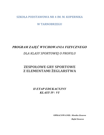 SZKOŁA PODSTAWOWA NR 4 IM. M. KOPERNIKA W TARNOBRZEGU PROGRAM ZAJĘĆ WYCHOWANIA FIZYCZNEGO DLA KLASY SPORTOWEJ O PROFILU ZESPOŁOWE GRY SPORTOWE Z ELEMENTAMI ŻEGLARSTWA II ETAP EDUKACYJNY KLASY IV- VI OPRACOWANIE: Monika Zasuwa Rafał Zasuwa Szkoła Podstawowa nr 4 im. Mikołaja Kopernika w Tarnobrzegu „Program wychowania fizycznego dla klasy sportowej o profilu zespołowe gry sportowe z elementami żeglarstwa”. Autorzy: mgr Rafał Zasuwa - nauczyciel dyplomowany wychowania fizycznego, absolwent Uniwersytetu Rzeszowskiego w Rzeszowie, 11 lat pracy w zawodzie. mgr Monika Zasuwa – nauczyciel mianowany wychowania fizycznego, ubiegająca się o stopień nauczyciela dyplomowanego, absolwentka Uniwersytetu Rzeszowskiego w Rzeszowie, 9 lat pracy w zawodzie. Cele dydaktyczne 1. Kształtowanie i doskonalenie harmonijnego rozwoju fizycznego uczniów. 2. Rozwijanie poczucia odpowiedzialności za zdrowie własne i innych. 3. Wyrobienie u uczniów potrzeby stałego, samodzielnego działania na rzecz własnego zdrowia i sprawności fizycznej, a w przyszłości dla swojej rodziny. 4. Przygotowanie uczniów do czynnego wypoczynku celem zachowania ich zdrowia psychicznego i fizycznego. 5. Osiągnięcie odpowiedniego (na miarę możliwości ucznia) poziomu sprawności motorycznej i nabycie przez ucznia umiejętności jej podtrzymywania. 6. Osiągnięcie poziomu sprawności technicznej i taktycznej w wybranych dyscyplinach sportowych. 7. Kontrola indywidualnej sprawności fizycznej uczniów w cyklu trzyletnim (testy sprawności fizycznej). 8. Zapobieganie powstawaniu wad postawy oraz ich korygowanie ze szczególnym uwzględnieniem własnych potrzeb. 9. Nabycie umiejętności udzielania pierwszej pomocy. 10. Przepisy bezpieczeństwa na lekcjach wychowania fizycznego, podczas wycieczek szkolnych, rajdów rowerowych i przy uprawianiu turystyki kwalifikowanej. 11. Kształtowanie postaw proekologicznych. 12. Nabycie umiejętności konstruktywnych sposobów radzenia sobie ze stresem i zmniejszania podatności na pojawianie się zaburzeń typu depresyjnego i agresji. 13. Rozwijanie umiejętności społecznych ucznia. 14. Wzmacnianie wiary we własne możliwości i kształtowanie pozytywnej samooceny. 15. Kształtowanie zdrowej i wolnej od nałogów osobowości oraz rozwijanie jej cech takich jak: silna wola, cierpliwość, dokładność, systematyczność, wytrzymałość oraz zwiększanie zdolności do podejmowania odważnych decyzji. Informacja o uczestnikach programu Prezentowany program skierowany jest do dziewcząt i chłopców szkoły podstawowej uczęszczających do klasy sportowej ze zwiększoną ilością godzin z wychowania fizycznego. Obejmuje on trzyletni proces kształcenia. Klasa, w której realizowany jest program znajduje się obecnie na drugim etapie kształcenia. Są to uczniowie o różnym poziomie sprawności fizycznej. Ich zainteresowania są zgodne z wybranym kierunkiem kształcenia, stąd wynika duże zaangażowanie uczniów na lekcjach wychowania fizycznego. Informacje o sposobie realizacji programu, o procedurach osiągania celów Tygodniowy wymiar godzin wychowania fizycznego w każdym roku nauczania wynosi dziesięć jednostek lekcyjnych. Zajęcia realizowane są w systemie: 2+6+1+1 (2h – podstawa programowa, 6h – zajęcia z zespołowych gier sportowych, 1h – zajęcia z nauki i doskonalenia pływania, 1h – zajęcia z żeglarstwa). Program obejmuje trzyletni proces kształcenia. W ramach zespołowych gier sportowych realizowane są treści nauczania z zakresu: ▪ minikoszykówki, ▪ minipiłki nożnej, ▪ minipiłki siatkowej, ▪ miniunihokeja. Głównym założeniem tego programu jest stworzenie uczniom warunków do realizowania się w szeroko pojętej kulturze fizycznej. Celem zajęć oprócz zdobycia umiejętności ruchowych w poszczególnych dyscyplinach sportu jest znajomość prozdrowotnych i kulturowych aspektów kultury fizycznej oraz właściwe ich wykorzystanie. Uczniowie mają uczestniczyć nie tylko w wychowaniu fizycznym, ale w całej kulturze fizycznej, co przyniesie efekty w formie integracji klasy, rozbudzeniu potrzeb ruchowych i w nabyciu nawyku aktywnego wypoczynku na całe życie. Zajęcia z gier zespołowych odbywają się w blokach dwugodzinnych, co umożliwia prowadzenie ich w formie treningu sportowego. Dwie godziny tygodniowo przeznaczone są na realizację podstawy programowej z wychowania fizycznego dla klas IV – VI. Zajęcia z zespołowych gier sportowych oraz z podstawy programowej odbywają się w sali gimnastycznej szkoły oraz w hali sportowej MOSiR w Tarnobrzegu. Jedna godzina tygodniowo przeznaczona jest na naukę i doskonalenie pływania, która prowadzona jest na pływalni MOSiR w Tarnobrzegu. Godzina tygodniowo z żeglarstwa jest podzielona w następujący sposób: w okresie wrzesień-październik i maj-czerwiec odbywają się zajęcia praktyczne na Jeziorze Tarnobrzeskim, w pozostałych miesiącach roku szkolnego zajęcia odbywają się w systemie klasowo – lekcyjnym (teoretyczne). Liczba godzin przeznaczonych na realizację zadań z poszczególnych działów, na każdym etapie kształcenia jest stała. Nie ma podziału w klasie na grupy ze względu na płeć. Treści nauczania i wychowania Szczegółowe treści kształcenia Osiągnięcia ucznia Minikoszykówka Poruszanie się po boisku ze zmianą tempa i Zna i potrafi wykonać kierunku (zatrzymanie na jedno i na dwa poszczególne elementy techniki tempa, obroty gry w koszykówkę. w przód i w tył, zwody), Zna zasady i przepisy gry w mini Podania i chwyty piłki (oburącz sprzed koszykówkę. piersi, oburącz kozłem, jednorącz, oburącz znad głowy, jednorącz kozłem), Systematycznie poprawia swoją technikę koszykarską. Kozłowanie piłki prawą i lewą ręką (wysokie i niskie, ze zmianą tempa i Potrafi ocenić stopień kierunku), wytrenowania organizmu. Obroty z piłką (półobrót i w tył, obrót w przód i w tył), w przód Potrafi współdziałać i współprac