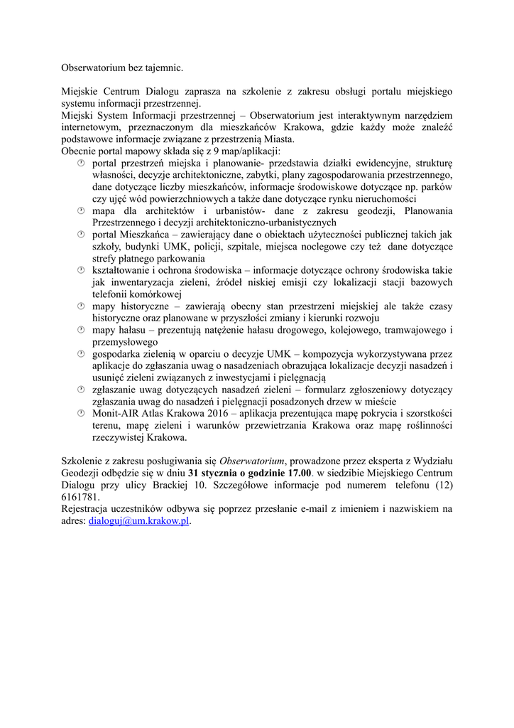 Obserwatorium bez tajemnic. Miejskie Centrum Dialogu zaprasza na szkolenie z zakresu obsługi portalu miejskiego systemu informacji przestrzennej. Miejski System Informacji przestrzennej – Obserwatorium jest interaktywnym narzędziem internetowym, przeznaczonym dla mieszkańców Krakowa, gdzie każdy może znaleźć podstawowe informacje związane z przestrzenią Miasta. Obecnie portal mapowy składa się z 9 map/aplikacji: portal przestrzeń miejska i planowanie- przedstawia działki ewidencyjne, strukturę własności, decyzje architektoniczne, zabytki, plany zagospodarowania przestrzennego, dane dotyczące liczby mieszkańców, informacje środowiskowe dotyczące np. parków czy ujęć wód powierzchniowych a także dane dotyczące rynku nieruchomości mapa dla architektów i urbanistów- dane z zakresu geodezji, Planowania Przestrzennego i decyzji architektoniczno-urbanistycznych portal Mieszkańca – zawierający dane o obiektach użyteczności publicznej takich jak szkoły, budynki UMK, policji, szpitale, miejsca noclegowe czy też dane dotyczące strefy płatnego parkowania kształtowanie i ochrona środowiska – informacje dotyczące ochrony środowiska takie jak inwentaryzacja zieleni, źródeł niskiej emisji czy lokalizacji stacji bazowych telefonii komórkowej mapy historyczne – zawierają obecny stan przestrzeni miejskiej ale także czasy historyczne oraz planowane w przyszłości zmiany i kierunki rozwoju mapy hałasu – prezentują natężenie hałasu drogowego, kolejowego, tramwajowego i przemysłowego gospodarka zielenią w oparciu o decyzje UMK – kompozycja wykorzystywana przez aplikacje do zgłaszania uwag o nasadzeniach obrazująca lokalizacje decyzji nasadzeń i usunięć zieleni związanych z inwestycjami i pielęgnacją zgłaszanie uwag dotyczących nasadzeń zieleni – formularz zgłoszeniowy dotyczący zgłaszania uwag do nasadzeń i pielęgnacji posadzonych drzew w mieście Monit-AIR Atlas Krakowa 2016 – aplikacja prezentująca mapę pokrycia i szorstkości terenu, mapę zieleni i warunków przewietrzania Krakowa oraz mapę roślinności rzeczywistej Krakowa. Szkolenie z zakresu posługiwania się Obserwatorium, prowadzone przez eksperta z Wydziału Geodezji odbędzie się w dniu 31 stycznia o godzinie 17.00. w siedzibie Miejskiego Centrum Dialogu przy ulicy Brackiej 10. Szczegółowe informacje pod numerem telefonu (12) 6161781. Rejestracja uczestników odbywa się poprzez przesłanie e-mail z imieniem i nazwiskiem na adres: [email protected].