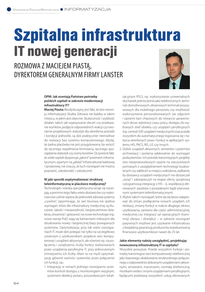 OGÓLNOPOLSKI PRZEGLĄD MEDYCZNY 3/2016 INFORMATYZACJA Szpitalna infrastruktura IT nowej generacji ROZMOWA Z MACIEJEM PIASTĄ, DYREKTOREM GENERALNYM FIRMY LANSTER OPM: Jak oceniają Państwo potrzeby polskich szpitali w zakresie modernizacji infrastruktury IT? Maciej Piasta: Bezdyskusyjny jest fakt, że bez rozwo ju informatyzacji Służba Zdrowia nie byłaby w takim miejscu, w jakim jest obecnie. Skuteczność i szybkość działań, takich jak wypisywanie zleceń czy przekaza nie wyników, podjęcie odpowiednich reakcji czy two rzenie projektowych statystyk dla określenia potrzeb i kondycji jednostki, są dziś praktycznie niemożliwe do realizacji bez systemu komputerowego. Myślę, że żadna placówka nie jest przygotowana, by wrócić do ręcznego wypełniania formularzy, ręcznego spo rządzania statystyk czy oceny kosztów. Oczywiście fakt, że wiele szpitali dysponuje „jakimś” systemem informa tycznym, opartym na „jakiejś” infrastrukturze kablowej i sprzętowej, nie znaczy, że tych rozwiązań nie można poprawić, udoskonalić i uskutecznić. W jaki sposób zoptymalizować strukturę teleinformatyczną w placówce medycznej? Technologie i wiedza specjalistyczna wciąż się rozwi jają, a pomimo tego faktu wielu dostawców czy wyko nawców usilnie wpiera do jednostek zdrowia systemy „cywilne”, zapominając, że sieć biurowa nie spełnia wymagań, które dla infrastruktury medycznej są klu czowe. Jakość i niezawodność, bezpieczeństwo dzia łania, otwartość i gotowość na nowe technologie (np. nowe wersje PoE) stają się kamieniami milowymi dla zbudowania nowej i bezpiecznej bazy powiązanych systemów. Optymalizacja, przy tak wielu rozwiąza niach IT, może dziś polegać nie tylko na szczegółowo ustalonym z użytkownikiem projekcie sieci kompu terowej i urządzeń aktywnych, ale również np. na po łączeniu i zwiększeniu liczby funkcji realizowanych przez urządzenia peryferyjne IT, przy jednoczesnym zmniejszeniu ich liczby. Mam tu na myśli optymali zację głównie wartości systemów przez połączenie ich funkcji, np.: 1.Integrację w ramach jednego rozwiązania syste mów kontroli dostępu z monitoringiem wizyjnym, systemem detekcji pożaru, przywoławczym lokali 54 zacyjnym RTLS, np. wykorzystanie uniwersalnych słuchawek jednocześnie jako telefonicznych, termi nali domofonowych, ekranowych terminali przyzy wowych dla mobilnego personelu czy możliwość wykorzystania personalizowanych (ze zdjęciem i opisem) kart chipowych do otwarcia uprawnio nych drzwi, rejestracji czasu pracy, dostępu do wy branych stref obiektu czy urządzeń peryferyjnych (np. centrali SSP, urządzeń medycznych) oraz przede wszystkim do automatycznego logowania się i na bycia określonych praw i funkcji w aplikacjach sys temu HIS, PACS, RIS, LIS czy innych. 2.Dobór urządzeń aktywnych, serwerów i systemów archiwizacji i zasilania adekwatnie do wymagań podsystemów i ich potrzeb transmisyjnych, projekty sieci bezprzewodowych oparte na rzeczywistych pomiarach z uwzględnieniem technologii budow lanych czy zakłóceń w miejscu wdrożenia, zadbanie, by dostawcy urządzeń medycznych nie dostarczali „wysp” i zabezpieczyli na etapie oferty sprzętową i programową integrację z HIS – tj. współpracę ofe rowanych zasobów z posiadanymi bądź planowa nymi systemami teleinformatycznymi. 3.Wybór takich rozwiązań, które da się łatwo adapto wać do zmian, podłączenia nowych urządzeń, ich relokacji, zmiany funkcji w trakcie długiego okresu użytkowania, zarówno dla części administracyjnej, medycznej czy integracji sal operacyjnych (trans misji obrazu i dźwięku) – w zakresie rozwiązań pasywnych możliwe jest uzyskanie infrastruktury z bezpłatną gwarancją producenta reasekurowaną finansowo użytkownikowi nawet do 25 lat. Jakie elementy należy uwzględnić, projektując nowoczesną infrastrukturę IT w szpitalu? Wszystkie powyższe. Przede wszystkim funkcje i po trzeby transmisyjne sieci komputerowej i telefonicznej jako bazowego okablowania strukturalnego połączo nego z odpowiednio dobranymi urządzeniami aktyw nymi, serwerami, macierzami, centralą telefoniczną, mostkami wideo i innymi urządzeniami peryferyjnymi, będącymi podstawą wszystkich usług oferowanych INFORMATYZACJA i realizowanych zarówno lokalnie, jak i w chmurze, dla telemedycyny, telekardiologii, telekonferencji, wideo konsultacji i innych usług oraz e-usług. Poza tym – sys temy bezpieczeństwa – detekcji pożaru (SSP), kontroli dostępu, monitoringu CCTV, przywoławczy/przyzy wowy, lokalizacji zasobów. Zintegrowane rozwiązania tworzą jednolity, komunikacyjny system, zabezpiecza jący jednostkę zdrowia. Wszystkie te rozwiązania należy ustalić szczegółowo z użytkownikiem, określając nie tylko liczbę i miejsca instalacji, ale również komunika cję, zachowania personelu i wszystko, co spowoduje, że projektowany system stanie się naturalnym, domyśl nym i pomocnym, niewidzialnym wręcz rozwiązaniem, a nie podstawą do konieczności przeprowadzenia na stępnych, ratunkowych już inwestycji. Jakie rozwiązania dla placówek medycznych proponuje firma LANSTER? Z biegiem lat, co miło mi stwierdzić, poziom naszej atencji i naszego zaangażowania oraz zrozumienie i akceptacja ze strony użytkowników rosną. Dlatego, ustalając dziś nowe projekty czy zakresy technolo gii i funkcji, coraz szybciej znajdujemy wspólny język z przedstawicielami placówek medycznych, nawet gdy – co jest niestety wciąż dość częste – służby tech niczne odsunięte są od definiowania potrzeb i kształ towania wymagań dla rozwiązań, które po realizacji projektu mają przejść w ich zasoby. Oczywiście, nie OGÓLNOPOLSKI PRZEGLĄD MEDYCZNY 3/2016 bez znaczenia jest fakt wspólnych sukcesów i realizacji z placówkami medycznymi, z którymi rozpoczęliśmy współpracę nierzadko ponad 15 lat temu i z który mi współpracujemy do dziś. Jesteśmy im wdzięcz