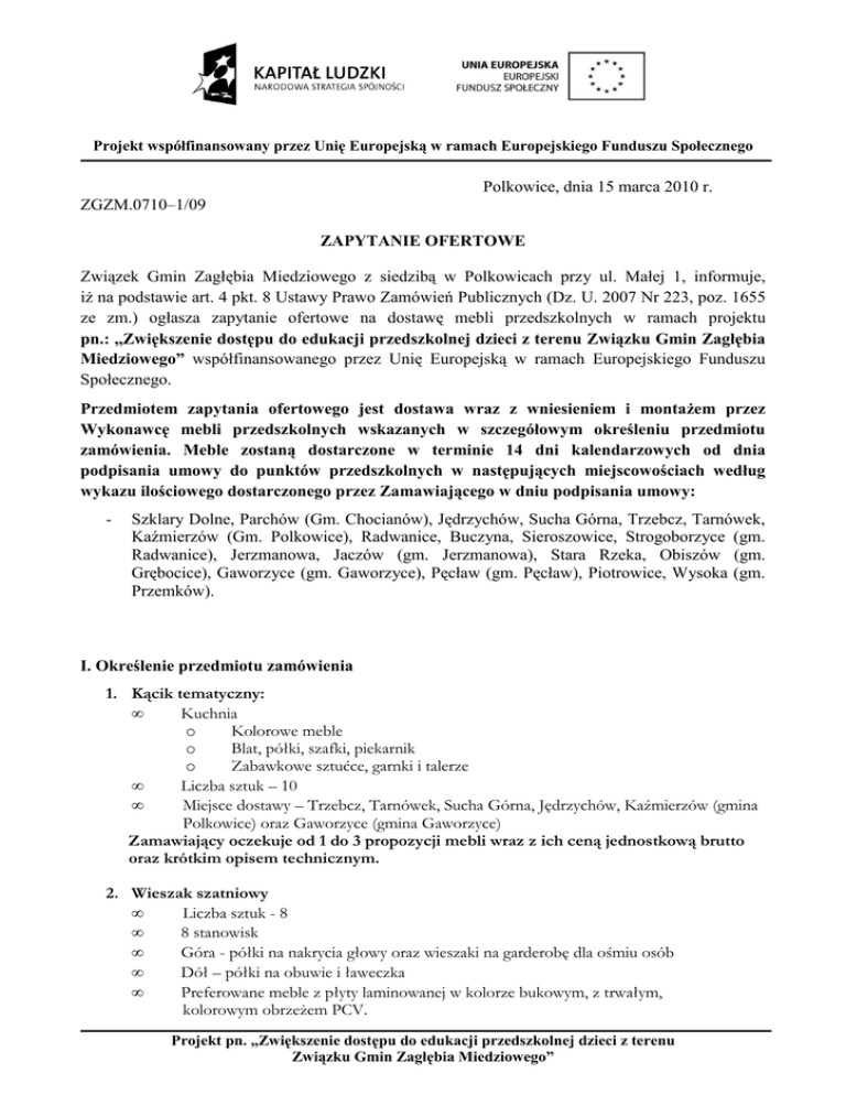 Projekt współfinansowany przez Unię Europejską w ramach Europejskiego Funduszu Społecznego Polkowice, dnia 15 marca 2010 r. ZGZM.0710–1/09 ZAPYTANIE OFERTOWE Związek Gmin Zagłębia Miedziowego z siedzibą w Polkowicach przy ul. Małej 1, informuje, iŜ na podstawie art. 4 pkt. 8 Ustawy Prawo Zamówień Publicznych (Dz. U. 2007 Nr 223, poz. 1655 ze zm.) ogłasza zapytanie ofertowe na dostawę mebli przedszkolnych w ramach projektu pn.: ,,Zwiększenie dostępu do edukacji przedszkolnej dzieci z terenu Związku Gmin Zagłębia Miedziowego” współfinansowanego przez Unię Europejską w ramach Europejskiego Funduszu Społecznego. Przedmiotem zapytania ofertowego jest dostawa wraz z wniesieniem i montaŜem przez Wykonawcę mebli przedszkolnych wskazanych w szczegółowym określeniu przedmiotu zamówienia. Meble zostaną dostarczone w terminie 14 dni kalendarzowych od dnia podpisania umowy do punktów przedszkolnych w następujących miejscowościach według wykazu ilościowego dostarczonego przez Zamawiającego w dniu podpisania umowy: - Szklary Dolne, Parchów (Gm. Chocianów), Jędrzychów, Sucha Górna, Trzebcz, Tarnówek, Kaźmierzów (Gm. Polkowice), Radwanice, Buczyna, Sieroszowice, Strogoborzyce (gm. Radwanice), Jerzmanowa, Jaczów (gm. Jerzmanowa), Stara Rzeka, Obiszów (gm. Grębocice), Gaworzyce (gm. Gaworzyce), Pęcław (gm. Pęcław), Piotrowice, Wysoka (gm. Przemków). I. Określenie przedmiotu zamówienia 1. Kącik tematyczny: • Kuchnia o Kolorowe meble o Blat, półki, szafki, piekarnik o Zabawkowe sztućce, garnki i talerze • Liczba sztuk – 10 • Miejsce dostawy – Trzebcz, Tarnówek, Sucha Górna, Jędrzychów, Kaźmierzów (gmina Polkowice) oraz Gaworzyce (gmina Gaworzyce) Zamawiający oczekuje od 1 do 3 propozycji mebli wraz z ich ceną jednostkową brutto oraz krótkim opisem technicznym. 2. Wieszak szatniowy • Liczba sztuk - 8 • 8 stanowisk • Góra - półki na nakrycia głowy oraz wieszaki na garderobę dla ośmiu osób • Dół – półki na obuwie i ławeczka • Preferowane meble z płyty laminowanej w kolorze bukowym, z trwałym, kolorowym obrzeŜem PCV. Projekt pn. „Zwiększenie dostępu do edukacji przedszkolnej dzieci z terenu Związku Gmin Zagłębia Miedziowego” Projekt współfinansowany przez Unię Europejską w ramach Europejskiego Funduszu Społecznego Zamawiający oczekuje od 1 do 3 propozycji mebli wraz z ich ceną jednostkową brutto oraz krótkim opisem technicznym. 3. Regał • Liczba sztuk - 1 • Płyta laminowana w kolorze bukowym, z trwałym, kolorowym obrzeŜem PCV; drzwiczki szafek w róŜnych kolorach: czerwony, zielony, niebieski, Ŝółty. • Dwie pary drzwi (na górze i na dole) oraz jedna półka odkryta – • Wymiary: 840 x 400 x 2000 mm (+/- 10 mm) Wszystkie meble muszą posiadać potwierdzenie jakości i bezpieczeństwa wyrobów certyfikatem wydanym przez instytucję akredytowaną w Polskim Centrum Akredytacji. II. Kryterium wyboru oferty : • Cena brutto oraz właściwości techniczne mebli (m.in. funkcjonalność, wykonanie, właściwości techniczne) • Zamawiający podpisze umowę z jednym wykonawcą, którego oferta będzie najkorzystniejsza. III. Termin dostawy ustala się na 14 dni kalendarzowych od dnia podpisania umowy. Zamawiający zastrzega sobie prawo do uniewaŜnienia zamówienia bez podania przyczyny przed podpisaniem umowy. IV. Termin nadsyłania ofert wyznacza się na dzień 19 marca 2010 r. godz. 12:00 (decyduje data wpływu). V. Oferty naleŜy składać drogą elektroniczną na adres [email protected] w temacie wiadomości wpisując „Oferta na meble przedszkolne”. VI. Dodatkowych informacji udziela Koordynator Główny – Pan Paweł Rudkowski pod numerem telefonu: 0-507-960-126 Projekt pn. „Zwiększenie dostępu do edukacji przedszkolnej dzieci z terenu Związku Gmin Zagłębia Miedziowego”