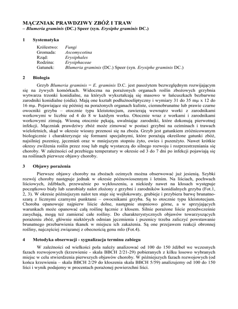 MĄCZNIAK PRAWDZIWY ZBÓŻ I TRAW – Blumeria graminis (DC.) Speer (syn. Erysiphe graminis DC.) 1 Systematyka Królestwo: Gromada: Rząd: Rodzina: Gatunek: 2 Fungi Ascomycotina Erysiphales Erysiphaceae Blumeria graminis (DC.) Speer (syn. Erysiphe graminis DC.) Biologia Grzyb Blumeria graminis = E. graminis D.C. jest pasożytem bezwzględnym rozwijającym się na żywych komórkach. Widoczna na porażonych organach roślin zbożowych grzybnia wytwarza trzonki konidialne, na których wykształcają się masowo w łańcuszkach bezbarwne zarodniki konidialne (oidia). Mają one kształt podłużnoeliptyczny i wymiary 31 do 35 mµ x 12 do 16 mµ. Pojawiające się później na porażonych organach kuliste, ciemnobrunatne lub prawie czarne owocniki grzyba – otocznie typu kleistotecjum, zawierają wewnątrz worki z zarodnikami workowymi w liczbie od 4 do 8 w każdym worku. Otocznie wraz z workami i zarodnikami workowymi zimują. Wiosną otocznie pękają, uwalniając zarodniki, które dokonują pierwotnej infekcji. Mączniak prawdziwy zbóż może zimować w postaci grzybni na oziminach i trawach wieloletnich, skąd w okresie wiosny przenosi się na zboża. Grzyb jest gatunkiem zróżnicowanym biologicznie i charakteryzuje się formami specjalnymi, które porażają określone gatunki zbóż, najsilniej pszenicę, jęczmień oraz w mniejszym stopniu żyto, owies i pszenżyto. Nawet krótkie okresy zwilżenia roślin przez rosę lub mgłę wystarczą do silnego rozwoju i rozprzestrzeniania się choroby. W zależności od przebiegu temperatury w okresie od 3 do 7 dni po infekcji pojawiają się na roślinach pierwsze objawy choroby. 3 Objawy porażenia Pierwsze objawy choroby na zbożach ozimych można obserwować już jesienią. Szybki rozwój choroby następuje jednak w okresie późnowiosennym i letnim. Na liściach, pochwach liściowych, źdźbłach, przeważnie po wykłoszeniu, a niekiedy nawet na kłosach występuje początkowo biały lub szarobiały nalot złożony z grzybni i zarodników konidialnych grzyba (Fot.1, 2, 3). W okresie późniejszym nalot ten staje się wojłokowaty, grubieje i przybiera barwę brunatnoszarą z licznymi czarnymi punktami – owocnikami grzyba. Są to otocznie typu kleistotecjum. Choroba opanowuje najpierw liście dolne, następnie stopniowo górne, a w sprzyjających warunkach może opanować całą roślinę łącznie z kłosem. Silnie porażone liście przedwcześnie zasychają, mogą też zamierać całe rośliny. Do charakterystycznych objawów towarzyszących porażeniu zbóż, głównie niektórych odmian jęczmienia i pszenicy trzeba zaliczyć powstawanie brunatnego przebarwienia tkanek w miejscu ich zakażenia. Są one przejawem reakcji obronnej rośliny, najczęściej związanej z obecnością genu mlo (Fot.4). 4 Metodyka obserwacji - sygnalizacja terminu zabiegu W zależności od wielkości pola należy analizować od 100 do 150 źdźbeł we wczesnych fazach rozwojowych (krzewienie - skala BBCH 2/21-29) pobieranych z kilku losowo wybranych miejsc w celu stwierdzenia pierwszych objawów choroby. W późniejszych fazach rozwojowych (od końca krzewienia – skala BBCH 2/29 do kłoszenia skala BBCH 5/59) analizujemy od 100 do 150 liści i wynik podajemy w procentach porażonej powierzchni liści. 5 Progi ekonomicznej szkodliwości oraz terminy zabiegów ochrony roślin Orientacyjne progi szkodliwości i terminy zwalczania mączniaka prawdziwego zbóż. 5.1 Na pszenicy ozimej w intensywnej uprawie: – – – 5.2 Na jęczmieniu: – – 5.3 w okresie strzelania w źdźbło (faza rozwojowa w skali BBCH 3/30) lub na początku kłoszenia, (faza rozwojowa w skali BBCH 5/51), gdy objawy wystąpią na liściu podflagowym, a odsetek porażonych źdźbeł wynosi ponad 20%. Na pszenżycie: – 5.5 ozimym - jesienią, jeżeli na dolnych liściach roślin pojawiają się objawy choroby (faza rozwojowa w skali BBCH 2/21-29) jarym i ozimym od fazy krzewienia (faza rozwojowa w skali BBCH 2/20) do fazy kłoszenia (faza rozwojowa w skali BBCH 5/51), gdy objawy chorobowe pojawią się już na górnych liściach, a liczba porażonych źdźbeł wynosi co najmniej 10%. Na życie: – 5.4 w fazie początków krzewienia do końca krzewienia, gdy na 50–70 % roślin pojawiają się pierwsze objawy choroby (faza rozwojowa w skali BBCH 2/21-29), w fazie strzelania w źdźbło (faza rozwojowa w skali BBCH 3/30-39), gdy przynajmniej 10% źdźbeł wykazuje pierwsze objawy porażenia w fazie kłoszenia (faza rozwojowa w skali BBCH 5/51-59), gdy pierwsze objawy chorobowe występują już na liściu flagowym, podflagowym lub kłosie. w razie obecności choroby postępować jak wyżej dla pszenicy. Na owsie: – – pod koniec krzewienia (faza rozwojowa w skali BBCH 2/29), gdy na 15-20% źdźbeł występują wyraźne objawy porażenia. w okresie strzelania w źdźbło (faza rozwojowa w skali BBCH 3/30) do fazy ukazywania się wiech, (faza rozwojowa w skali BBCH 4/49), gdy choroba zaczyna opanowywać trzeci liść przechodząc na liść podflagowy. Zwalczanie mączniaka prawdziwego, występującego w stosunkowo dużym nasileniu już we wczesnych fazach rozwojowych roślin ma decydujący wpływ na plon ziarna i dlatego nie należy opóźniać zabiegów. 6 Ocena szkodliwości Obserwacje nad występowaniem sprawcy mączniaka prawdziwego zbóż na plantacjach należy przeprowadzić w okresie kłoszenia się i kwitnienia pszenicy (faza rozwojowa w skali BBCH 5/51 do 6/69). Do analizy typujemy plantacje pszenicy ozimej i jarej zlokalizowane na różnych stanowiskach. W zależności od wielkości pola analizujemy od 100 do 150 źdźbeł w różnych losowo wybranych punktach po 25 sztuk. Na plantacjach powyżej 2 ha należy zwiększyć liczbę punktów o 1 na każdy następny hektar. Określamy liczbę i procent porażonych źdźbeł w stosunku do analizowanych ogółem oraz stopień porażenia. Stopień porażenia źdźbeł chorych określamy wg trzystopniowej skali (Ryc.1): – słaby - 