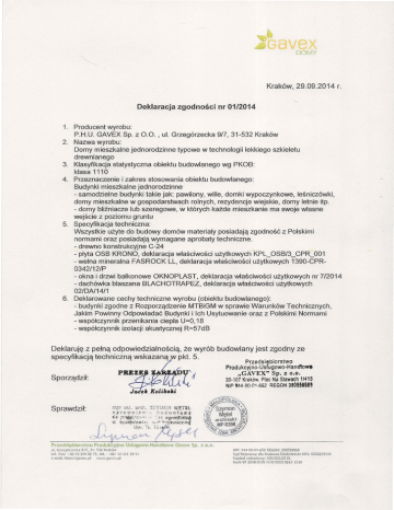 Kraków, 29.09.2014 r. Deklaracja zgodności nr 01/2014 1. Producent wyrobu: P.H.U. GAVEX Sp. z 0.0. , ul. Grzegórzecka 9/7, 31-532 Kraków 2. Nazwa wyrobu: Domy mieszkalne jednorodzinne typowe w technologii lekkiego szkieletu drewnianego 3. Klasyfikacja statystyczna obiektu budowlanego wg PKOB: klasa 1110 4. Przeznaczenie i zakres stosowania obiektu budowlanego: Budynki mieszkalne jednorodzinne - samodzielne budynki takie jak: pawilony, wille, domki wypoczynkowe, leśniczówki, domy mieszkalne w gospodarstwach rolnych, rezydencje wiejskie, domy letnie itp. - domy bliźniacze lub szeregowe, w których każde mieszkanie ma swoje własne wejście z poziomu gruntu 5. Specyfikacja techniczna: Wszystkie użyte do budowy domów materiały posiadają zgodność z Polskimi normami oraz posiadają wymagane aprobaty techniczne. - drewno konstrukcyjne C-24 - płyta OSB KRONO, deklaracja właściwości użytkowych KPL_OSB/3_CPR_001 - wełna mineralna FASROCK LL, deklaracja właściwości użytkowych 1390-CPR0342/12/P - okna i drzwi balkonowe OKNOPLAST, deklaracja właściwości użytkowych nr 7/2014 - dachówka blaszana BLACHOTRAPEZ, deklaracja właściwości użytkowych 02/DA/14/1 6. Deklarowane cechy techniczne wyrobu (obiektu budowlanego): - budynki zgodne z Rozporządzenie MTBiGM w sprawie Warunków Technicznych, Jakim Powinny Odpowiadać Budynki i Ich Usytuowanie oraz z Polskimi Normami - współczynnik przenikania ciepła U=O,18 - współczynnik izolacji akustycznej R=57dB Deklaruję z pełną odpowiedzialnością, że wyrób budowlany jest zgodny ze specyfikacją techniczną wskazaną w pkt. 5. Przedstęblorstwo Produkcyjno-Usfugowo-Handklwt "GAVEX" Sp. z Sporządził: Sprawdził: 0.0. 30-107 Kraków. Plac Na Stawach 1/415 NIP !W·-OO·P1·992 R~QON 350&519n i'i~r i7c.~..... .,•.~-;t:. ~~Y~l.tt'··N ~~T~L "ł.;ir~,'.·~;1':ro.: !-::;(o,,!:l j~1 ,€o ?~,'r.'.,.~ .. - '.':' Qę(t"!I~~;:tNi :'.." "-:::!rJOic~,~ Grl~J.x...:r:3 9/7. 3ł· 531 Y.takO.., tel.:fax: .•48/1229·102 7S.lel.: ··HU 12·;:n 2911 e-mail: biumj.ga·;e..x.pl· •.!..·t, ga\.e<.pt ul. WP: 944·00·01-652 REGO;I: 350558%9 Są" Rejenor • dla K,ako,'. Śródmielcie KRS:00:>0225345 ".pitill zaklado":;: 5()()CoO'J.OO II Bank 97 2!}J() oo.s IllO o.iCJ 0263 Ino