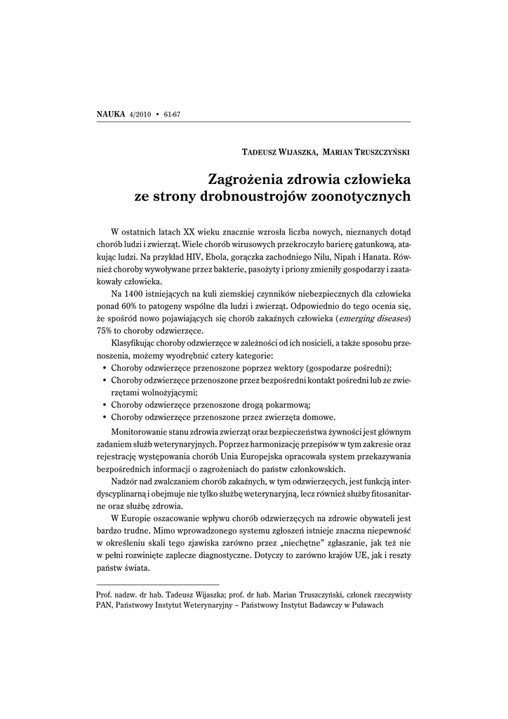 NAUKA 4/2010 • 61-67 TADEUSZ WIJASZKA, MARIAN TRUSZCZYŃSKI Zagrożenia zdrowia człowieka ze strony drobnoustrojów zoonotycznych W ostatnich latach XX wieku znacznie wzrosła liczba nowych, nieznanych dotąd chorób ludzi i zwierząt. Wiele chorób wirusowych przekroczyło barierę gatunkową, atakując ludzi. Na przykład HIV, Ebola, gorączka zachodniego Nilu, Nipah i Hanata. Również choroby wywoływane przez bakterie, pasożyty i priony zmieniły gospodarzy i zaatakowały człowieka. Na 1400 istniejących na kuli ziemskiej czynników niebezpiecznych dla człowieka ponad 60% to patogeny wspólne dla ludzi i zwierząt. Odpowiednio do tego ocenia się, że spośród nowo pojawiających się chorób zakaźnych człowieka (emerging diseases) 75% to choroby odzwierzęce. Klasyfikując choroby odzwierzęce w zależności od ich nosicieli, a także sposobu przenoszenia, możemy wyodrębnić cztery kategorie: • Choroby odzwierzęce przenoszone poprzez wektory (gospodarze pośredni); • Choroby odzwierzęce przenoszone przez bezpośredni kontakt pośredni lub ze zwierzętami wolnożyjącymi; • Choroby odzwierzęce przenoszone drogą pokarmową; • Choroby odzwierzęce przenoszone przez zwierzęta domowe. Monitorowanie stanu zdrowia zwierząt oraz bezpieczeństwa żywności jest głównym zadaniem służb weterynaryjnych. Poprzez harmonizację przepisów w tym zakresie oraz rejestrację występowania chorób Unia Europejska opracowała system przekazywania bezpośrednich informacji o zagrożeniach do państw członkowskich. Nadzór nad zwalczaniem chorób zakaźnych, w tym odzwierzęcych, jest funkcją interdyscyplinarną i obejmuje nie tylko służbę weterynaryjną, lecz również służby fitosanitarne oraz służbę zdrowia. W Europie oszacowanie wpływu chorób odzwierzęcych na zdrowie obywateli jest bardzo trudne. Mimo wprowadzonego systemu zgłoszeń istnieje znaczna niepewność w określeniu skali tego zjawiska zarówno przez „niechętne” zgłaszanie, jak też nie w pełni rozwinięte zaplecze diagnostyczne. Dotyczy to zarówno krajów UE, jak i reszty państw świata. Prof. nadzw. dr hab. Tadeusz Wijaszka; prof. dr hab. Marian Truszczyński, członek rzeczywisty PAN, Państwowy Instytut Weterynaryjny – Państwowy Instytut Badawczy w Puławach 62 Tadeusz Wijaszka, Marian Truszczyński Z szacunków MedVetNet rocznie notuje się ponad 400 mln przypadków diagnozowania czynników zakaźnych, które powodują straty sięgające do 40 mld euro, natomiast koszty pojawienia się nowych chorób odzwierzęcych w skali globalnej są szczególnie trudne do oszacowania Przekroczenia barier gatunkowych przez drobnoustroje, które obserwujemy od końca XX wieku, zastanawia ekspertów. Wielu skłania się ku hipotezie, że ludzie stali się bardziej wrażliwi na zakażenia przez osłabienie systemu immunologicznego. Według Morse’a [1] czynniki sprzyjające występowaniu i szerzeniu się zoonoz to: 1) Znaczny wzrost liczby ludności na świecie i rozwój osadnictwa na terenach dotąd niezamieszkałych. 2) Zmiany ekosystemu – przez rozwój przemysłu i niszczenie naturalnych barier. 3 Znaczny wzrost handlu (obrotu) zwierzętami i produktami pochodzenia zwierzęcego. 4) Stosowanie w żywieniu człowieka produktów pochodzących od zwierząt wolnożyjących (dzikich). 5) Intensyfikacja upraw polowych. 6) Wzrost podróży oraz turystyki do egzotycznych rejonów świata o nie do końca rozpoznanej sytuacji epidemiologicznej. 7) Zmiany w genomie patogenów powodujące przełamywanie bariery międzygatunkowej. 8) Znaczny rozwój metod diagnostycznych. 9) Wycofanie przez niektóre kraje programów zwalczania zoonoz. 10) Zmiany klimatyczne – powodujące zmiany w zasięgu bytowania niektórych wektorów (gospodarzy pośrednich). Liczne przykłady wskazują, że choroby odzwierzęce pojawiające się po raz pierwszy u ludzi szybko rozprzestrzeniają się na danym terenie i obejmują dużą część populacji. Proces pojawienia się nowej choroby składa się z dwu faz. W pierwszej następuje przełamanie bariery gatunkowej – zarazek powoduje zachorowanie pojedynczych osób. Druga faza charakteryzuje się rozprzestrzenieniem się zachorowań na znaczną część ludzi zamieszkujących ten region. Istnieje wiele dowodów wskazujących na to, że przeniesienie choroby ze zwierząt na ludzi to często proces powolnej adaptacji do człowieka zarazków od dawna występujących na danym terenie. Klasycznym przykładem są wirusy Hendra w Australii i Nipah w Azji, które od dawna wywoływały choroby nietoperzy i dopiero od lat 90. XX wieku stały się przyczyną groźnych zachorowań ludzi. Choroby te oraz Ebola są uważane za najgroźniejsze zoonozy – śmiertelność u ludzi jest bliska 100%. Zagrożenia zdrowia człowieka ze strony drobnoustrojów zoonotycznych 63 Na szczęście nie stwierdzono dotychczas transmisji poziomej tzn. zakażeń ludzi zdrowych od chorych. Niektóre jednak nowe zoonozy – Lassa, SARS przeniosły się na ludzi zdrowych kontaktujący się z chorymi (personel lekarski) [1]. W szerzeniu się wielu chorób niezwykle ważną rolę odgrywają zachowania człowieka w tym nielegalny obrót zwierzętami egzotycznymi, ekstremalna turystyka, jedzenie mięsa pochodzącego od egzotycznych zwierząt, uważanego dotychczas za nienadające się do spożycia. Globalizacja, zmiany ekologiczne, intensyfikacja rolnictwa ingerencja człowieka w środowisko naturalne spowodowały ujawnianie się nowych, nieznanych dotychczas chorób ludzi. Znanym przykładem jest tu borelioza, która pojawiła się w Stanach Zjednoczonych na obszarach, które intensywnie zalesiano. Zalesianie spowodowało znaczny wzrost populacji jeleniowatych, a to sprzyjało pojawianiu się kleszczy wektora boreliozy. Rozwój uprawy ryżu w Chinach doprowadził do wzrostu populacji myszy polnej często zakażonej wirusem koreańskiej gorączki krwotocznej, który szybko przeniósł się na robotników pracujących