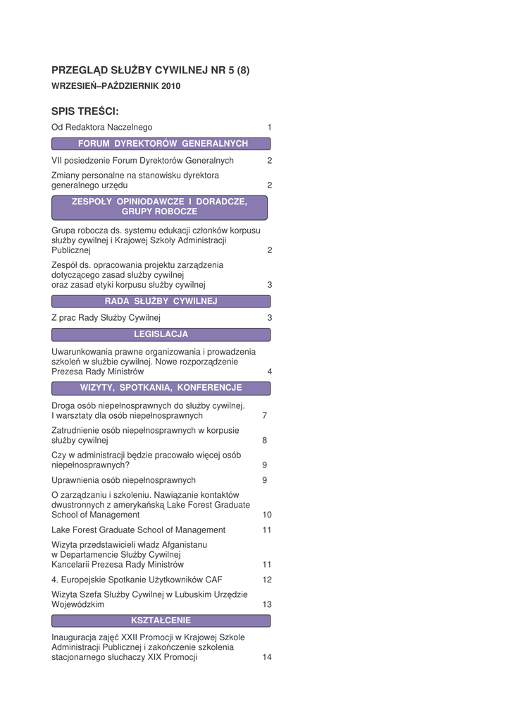 PRZEGL D SŁU BY CYWILNEJ NR 5 (8) WRZESIE –PA DZIERNIK 2010 SPIS TRE CI: Od Redaktora Naczelnego 1 FORUM DYREKTORÓW GENERALNYCH VII posiedzenie Forum Dyrektorów Generalnych 2 Zmiany personalne na stanowisku dyrektora generalnego urz du 2 ZESPOŁY OPINIODAWCZE I DORADCZE, GRUPY ROBOCZE Grupa robocza ds. systemu edukacji członków korpusu słu by cywilnej i Krajowej Szkoły Administracji Publicznej 2 Zespół ds. opracowania projektu zarz dzenia dotycz cego zasad słu by cywilnej oraz zasad etyki korpusu słu by cywilnej 3 RADA SŁU BY CYWILNEJ Z prac Rady Słu by Cywilnej 3 LEGISLACJA Uwarunkowania prawne organizowania i prowadzenia szkole w słu bie cywilnej. Nowe rozporz dzenie Prezesa Rady Ministrów 4 WIZYTY, SPOTKANIA, KONFERENCJE Droga osób niepełnosprawnych do słu by cywilnej. I warsztaty dla osób niepełnosprawnych 7 Zatrudnienie osób niepełnosprawnych w korpusie słu by cywilnej 8 Czy w administracji b dzie pracowało wi cej osób niepełnosprawnych? 9 Uprawnienia osób niepełnosprawnych 9 O zarz dzaniu i szkoleniu. Nawi zanie kontaktów dwustronnych z ameryka sk Lake Forest Graduate School of Management 10 Lake Forest Graduate School of Management 11 Wizyta przedstawicieli władz Afganistanu w Departamencie Słu by Cywilnej Kancelarii Prezesa Rady Ministrów 11 4. Europejskie Spotkanie U ytkowników CAF 12 Wizyta Szefa Słu by Cywilnej w Lubuskim Urz dzie Wojewódzkim 13 KSZTAŁCENIE Inauguracja zaj XXII Promocji w Krajowej Szkole Administracji Publicznej i zako czenie szkolenia stacjonarnego słuchaczy XIX Promocji 14 KARIERA W SŁU BIE CYWILNEJ Uczestnicy post powania kwalifikacyjnego w słu bie cywilnej w 2010 r. Analiza danych statystycznych dotycz cych osób, które w 2010 r. zako czyły sprawdzian w toku post powania kwalifikacyjnego w słu bie cywilnej z wynikiem pozytywnym 15 DOBRE PRAKTYKI ZARZ DZANIA Słu ba cywilna dla rodowiska 18 BEZPIECZE STWO I HIGIENA PRACY Ochrona pracy a administracja rz dowa. Rozmowa z profesor Danut Koradeck , dyrektorem Centralnego Instytutu Ochrony Pracy – Pa stwowego Instytutu Badawczego 21 BADANIA I ANALIZY Czynniki wpływaj ce na decyzj o podejmowaniu pracy w administracji rz dowej w wietle bada pracowników urz dów wojewódzkich 28 POST POWANIE KWALIFIKACYJNE – TESTY Pytania wykorzystane w sprawdzianie wiedzy przeprowadzonym przez Krajow Szkoł Administracji Publicznej w ramach post powania kwalifikacyjnego w słu bie cywilnej w 2010 r. 32 REDAKCJA