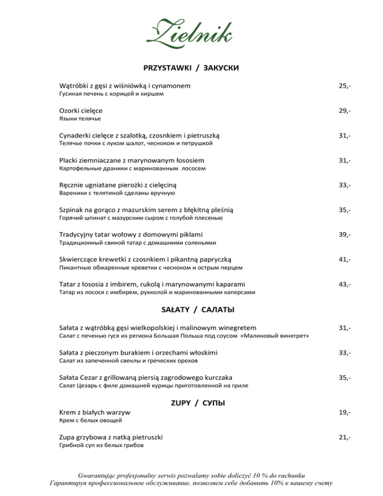 PRZYSTAWKI / ЗАКУСКИ Wątróbki z gęsi z wiśniówką i cynamonem 25,- Ozorki cielęce 29,- Cynaderki cielęce z szalotką, czosnkiem i pietruszką 31,- Placki ziemniaczane z marynowanym łososiem 31,- Ręcznie ugniatane pierożki z cielęciną 33,- Szpinak na gorąco z mazurskim serem z błękitną pleśnią 35,- Tradycyjny tatar wołowy z domowymi piklami 39,- Skwierczące krewetki z czosnkiem i pikantną papryczką 41,- Tatar z łososia z imbirem, rukolą i marynowanymi kaparami 43,- Гусиная печень с корицей и киршем Языки телячье Телячье почки с луком шалот, чесноком и петрушкой Картофельные драники с маринованным лососем Вареники с телятиной сделаны вручную Горячий шпинат с мазурским сыром с голубой плесенью Традиционный свиной татар с домашними соленьями Пикантные обжаренные креветки с чесноком и острым перцем Татар из лосося с имбирем, рукколой и маринованными каперсами SAŁATY / САЛАТЫ Sałata z wątróbką gęsi wielkopolskiej i malinowym winegretem 31,- Sałata z pieczonym burakiem i orzechami włoskimi 33,- Sałata Cezar z grillowaną piersią zagrodowego kurczaka 35,- Салат с печенью гуся из региона Большая Польша под соусом «Малиновый винегрет» Салат из запеченной свеклы и греческих орехов Салат Цезарь с филе домашней курицы приготовленной на гриле Krem z białych warzyw ZUPY / СУПЫ Крем с белых овощей Zupa grzybowa z natką pietruszki Грибной суп из белых грибов Gwarantując profesjonalny serwis pozwalamy sobie doliczyć 10 % do rachunku Гарантируя профессиональное обслуживание, позволяем себе добавить 10% к вашему счету 19,21,- DLA NAJMŁODSZYCH / ДЛЯ САМЫХ МАЛЕНЬКИХ Rosół z domowym makaronem 15,- Tagiatelle z pomidorami 19,- Ręcznie wygniatane pierożki z cielęciną 25,- Kotleciki z ekologicznego kurczaka w chrupiącej panierce 25,- Naleśniki z serem 17,- Бульон с домашними макаронами Паста Тальяте́лле с помидорами Вареники с телятиной сделаны вручную Котлетки с курицы домашнего выращивания в хрустящей панировке Налистники с творогом DANIA GŁÓWNE / ГЛАВНЫЕ БЛЮДА Naleśniki ze szpinakiem i miodem z nawłoci 33,- Pulpeciki cielęce z duszoną marchewką 35,- Pikantne żeberka z pieca 39,- Polędwica z łososia z dzikim ryżem i sezonowymi warzywami 41,- Pappardelle z borowikami, rozmarynem i wstęgami polędwicy 43,- Dorada z grilla w sosie z kolendry i marynowanych kaparów 45,- Królik z domowymi kopytkami i sosem tymiankowy 49,- Gęsina wielkopolska z kluseczkami i pieczoną pigwą 53,- Pół kaczki z codziennego wypieku 59,- Polędwica wołowa w sosie borowikowym 65,- Налистники со шпинатом и медом с золотарника Фрикадельки телячье с тушенной морковкой Пикантные ребрышки с печи Вырезка из лосося с диким рисом и сезонными овощами Паста Паппарделле с боровиками, розмарином и полосками вырезки Золотистый спар (дорада) в соусе из кориандра и маринованных каперсов Кролик с домашними клецками в соусе из тимьяна Гусь похождения с территории Большая Польша с вареничками и запеченной айвой Половина обжаренной утки Свиная вырезка в соусе из боровиков Gwarantując profesjonalny serwis pozwalamy sobie doliczyć 10 % do rachunku Гарантируя профессиональное обслуживание, позволяем себе добавить 10% к вашему счету DESKA POLSKICH SERÓW ZAGRODOWYCH ДОЩЕЧКА ПОЛЬСКИХ ФЕРМЕРСКИХ СЫРОВ 39,- Koryciński śmietankowy / Корытинский сметанный Krowi ser z surowego mleka ze wsi Korycin na północnym wschodzie Коровий сыр из сырого молока с села Корытинь северо-восточной Польши Wańczyk krowi / Ваньчик коровий Ser dojrzewający z sudeckiego gospodarstwa Wańczykówka Дозревающий сыр с судетской фермы «Ваньчиковка» Szafir dojrzewający 8 miesięcy / Сапфир дозревающий 8 месяцев Słodki, miodny, owocowo-kwiatowy z pasteryzowanego mleka krowiego Сладкий, медовый, фруктово-цветочный сыр с пастеризованного коровьего молока Frontiera Dżersej z błękitną pleśnią / Frontiera Dżersej с голубой плесенью Pikantny, słony ser z mleka krów rasy Dżersej spod Mrągowa Пикантный, соленый сыр с коровьего молока вида Джерсей с околиц Мрогово DESERY /ДЕСЕРТЫ Tarta owocowa 17,- Szarlotka z lodami waniliowymi 19,- Ciastko dnia Пирожное дня 21,- Pascha litewska na musie z pomarańczy Литовская пасха на апельсиновом муссе 23,- Tort bezowy: migdałowy, pistacjowy, kawowy Торт безе: миндальный, фисташковый, кофейный 25,- Фрук