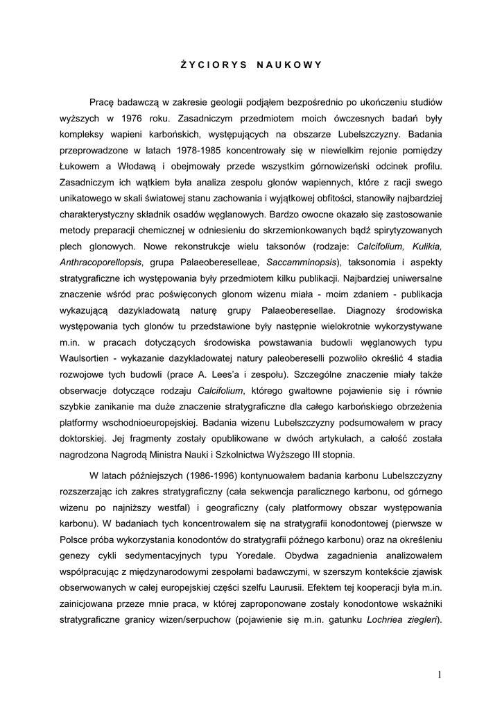 ŻYCIORYS NAUKOWY Pracę badawczą w zakresie geologii podjąłem bezpośrednio po ukończeniu studiów wyższych w 1976 roku. Zasadniczym przedmiotem moich ówczesnych badań były kompleksy wapieni karbońskich, występujących na obszarze Lubelszczyzny. Badania przeprowadzone w latach 1978-1985 koncentrowały się w niewielkim rejonie pomiędzy Łukowem a Włodawą i obejmowały przede wszystkim górnowizeński odcinek profilu. Zasadniczym ich wątkiem była analiza zespołu glonów wapiennych, które z racji swego unikatowego w skali światowej stanu zachowania i wyjątkowej obfitości, stanowiły najbardziej charakterystyczny składnik osadów węglanowych. Bardzo owocne okazało się zastosowanie metody preparacji chemicznej w odniesieniu do skrzemionkowanych bądź spirytyzowanych plech glonowych. Nowe rekonstrukcje wielu taksonów (rodzaje: Calcifolium, Kulikia, Anthracoporellopsis, grupa Palaeobereselleae, Saccamminopsis), taksonomia i aspekty stratygraficzne ich występowania były przedmiotem kilku publikacji. Najbardziej uniwersalne znaczenie wśród prac poświęconych glonom wizenu miała - moim zdaniem - publikacja wykazującą dazykladowatą naturę grupy Palaeoberesellae. Diagnozy środowiska występowania tych glonów tu przedstawione były następnie wielokrotnie wykorzystywane m.in. w pracach dotyczących środowiska powstawania budowli węglanowych typu Waulsortien - wykazanie dazykladowatej natury paleobereselli pozwoliło określić 4 stadia rozwojowe tych budowli (prace A. Lees’a i zespołu). Szczególne znaczenie miały także obserwacje dotyczące rodzaju Calcifolium, którego gwałtowne pojawienie się i równie szybkie zanikanie ma duże znaczenie stratygraficzne dla całego karbońskiego obrzeżenia platformy wschodnioeuropejskiej. Badania wizenu Lubelszczyzny podsumowałem w pracy doktorskiej. Jej fragmenty zostały opublikowane w dwóch artykułach, a całość została nagrodzona Nagrodą Ministra Nauki i Szkolnictwa Wyższego III stopnia. W latach późniejszych (1986-1996) kontynuowałem badania karbonu Lubelszczyzny rozszerzając ich zakres stratygraficzny (cała sekwencja paralicznego karbonu, od górnego wizenu po najniższy westfal) i geograficzny (cały platformowy obszar występowania karbonu). W badaniach tych koncentrowałem się na stratygrafii konodontowej (pierwsze w Polsce próba wykorzystania konodontów do stratygrafii późnego karbonu) oraz na określeniu genezy cykli sedymentacyjnych typu Yoredale. Obydwa zagadnienia analizowałem współpracując z międzynarodowymi zespołami badawczymi, w szerszym kontekście zjawisk obserwowanych w całej europejskiej części szelfu Laurusii. Efektem tej kooperacji była m.in. zainicjowana przeze mnie praca, w której zaproponowane zostały konodontowe wskaźniki stratygraficzne granicy wizen/serpuchow (pojawienie się m.in. gatunku Lochriea ziegleri). 1 Wskaźnik ten został w dalszych latach zaakceptowany jako element definicji tej granicy (patrz materiały: International Commission on Stratigraphy). Podsumowaniem badań karbonu Lubelszczyzny była moja praca habilitacyjna, w której przedstawiłem znaczenie konodontów i glonów wapiennych dla stratygrafii karbonu nadbużańskiego oraz eustatyczne uwarunkowania sedymentacji paralicznej. Połączenie w badaniach karbonu Lubelszczyzny wątków stratygraficznych i sedymentologicznych pozwoliło wzmocnić wcześniej już sformułowaną, ale ciągle dyskutowaną tezę o późnowizeńskim początku karbońsko-permskiego zlodowacenia półkuli południowej. Dalekim oddźwiękiem tego zlodowacenia były wahania poziomu oceanu, które znalazły swój zapis w cyklicznych sukcesjach osadowych strefy międzyzwrotnikowej. Dokładna kontrola stratygraficzna czasu powstania cyklotemów umożliwiła oszacowanie ich częstotliwości (~500.000 lat). Badania publikowane w latach poźniejszych wykazały, że bliskim analogiem obszaru lubelskiego był basen Illinois (Ameryka Północna), w którym identyczne cyklotemy, o zbliżonym czasie powstawania, pojawiły się w tym samym okresie (przełom wizenu i serpuchowu). W okresie pohabilitacyjnym kontynuowałem dotychczasowe wątki badań: stratygrafię i sedymentację osadów karbonu południowej Polski oraz badania dewonu Gór Świętokrzyskich. Ponadto rozpocząłem badania górnego syluru ukraińskiego Podola. Zebrana w ciągu wielu lat kolekcja konodontów pozwoliła mi na określenie historii termicznej skał karbonu Lubelszczyzny. Z karbońskich doświadczeń stratygraficznopaleontologicznych wynikał także krytyczny przegląd stratygrafii karbonu Lubelskiego Zagłębia Węglowego, jak i odpowiednie rozdziały w Katalogu Skamieniałości Karbonu Badania wapieni karbońskich kontynuowałem w innych regionach Polski w ramach kierowanego przeze mnie grantu KBN poświęconego karbońskim formacjom rafowym. Obserwacje prowadzone były w południowej Polsce, a w celach porównawczych również na północnym Uralu, skąd opisywano „wzorcowe” budowle dolnokarbońskie. Pomimo sporadycznego występowania tych budowli w profilach południowej Polski, przeprowadzone badania wykazały ich duże zróżnicowanie i umożliwiły odniesienie miejsc ich wzrostu do różnych środowisk sedymentacji (płytkowodnych jak i głębokowodnych), stosownie do modeli rozpoznanych w Wlk. Brytanii. W przypadku odsłonięć występujących na północnym Uralu badania doprowadziły do odtworzenia pełnej dewońsko-karbońskiej historii budowli węglanowych Bolshoy Nadoty i zanegowania ich jedynie karbońskiego wieku. Zasadnicza budowla, której wiek we wcześniejszych opracowaniach określano jako wczesnokarboński, okazała się być późnodewońska, zaś małe, wizeńskie budowle wchodziły w skład pokrywy platformowej rozwijającej się na podłożu starej budowli. 2 W sumie badania budowli węglanowych pozwoliły uzupełnić lukę poznawczą przypadającą na przełom dolnego i górnego karbonu, kiedy to enigmatyczne - choć ogrom