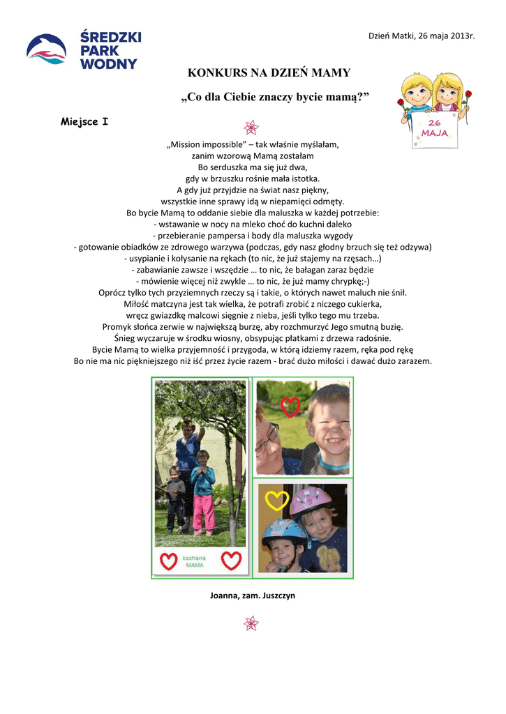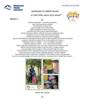 Dzień Matki, 26 maja 2013r. KONKURS NA DZIEŃ MAMY „Co dla Ciebie znaczy bycie mamą?” Miejsce I „Mission impossible” – tak właśnie myślałam, zanim wzorową Mamą zostałam Bo serduszka ma się już dwa, gdy w brzuszku rośnie mała istotka. A gdy już przyjdzie na świat nasz piękny, wszystkie inne sprawy idą w niepamięci odmęty. Bo bycie Mamą to oddanie siebie dla maluszka w każdej potrzebie: - wstawanie w nocy na mleko choć do kuchni daleko - przebieranie pampersa i body dla maluszka wygody - gotowanie obiadków ze zdrowego warzywa (podczas, gdy nasz głodny brzuch się też odzywa) - usypianie i kołysanie na rękach (to nic, że już stajemy na rzęsach…) - zabawianie zawsze i wszędzie … to nic, że bałagan zaraz będzie - mówienie więcej niż zwykle … to nic, że już mamy chrypkę;-) Oprócz tylko tych przyziemnych rzeczy są i takie, o których nawet maluch nie śnił. Miłość matczyna jest tak wielka, że potrafi zrobić z niczego cukierka, wręcz gwiazdkę malcowi sięgnie z nieba, jeśli tylko tego mu trzeba. Promyk słońca zerwie w największą burzę, aby rozchmurzyć Jego smutną buzię. Śnieg wyczaruje w środku wiosny, obsypując płatkami z drzewa radośnie. Bycie Mamą to wielka przyjemność i przygoda, w którą idziemy razem, ręka pod rękę Bo nie ma nic piękniejszego niż iść przez życie razem - brać dużo miłości i dawać dużo zarazem. Joanna, zam. Juszczyn Dzień Matki, 26 maja 2013r. Miejsce II Być mamą... to takie proste. To tylko kochać, całować i tulić. Być mamą to się uśmiechać, to umieć słuchać, pocieszać i uczyć. Wybaczać, szanować, wielbić nad życie miłością wielką, niesamowitą Taką, że boli i czasem dusi, taką co każe być zawsze czujną. Być mamą to patrzeć na pierwsze kroki I do przedszkola za łapkę prowadzić. Pierwszego mleczaka pod poduszkę chować i wciąż tłumaczyć, tłumaczyć, tłumaczyć. Być mamą to razem tornister kupować, to lekcje codziennie pomagać robić, to niewyraźnych wierszyków na występach słuchać, to plaster na zdarte kolano przyłożyć. Być mamą to najpiękniejsze, co w życiu spotkać nas może. A ja codziennie rano Dziękuję Ci za moje dzieci Boże. Izabela, zam. Machnice Miejsce III Katarzyna zam. Ciechów Dzień Matki, 26 maja 2013r. Pozostałe prace, za które również bardzo dziękujemy: To dla Mamy Edyty..... która ma zniszczone dłonie od ciężkiej pracy, setki zmarszczek na zroszonym potem - czole i tysiące siwych włosów od zamartwiania się o swoją córkę i zbyt mało czasu na życie..... Jest Nią moja najdroższa i najukochańsza mama Edyta z Rzeszowa. Kochana Mamo na wstępie życzę dużo miłości ponieważ bez niej nie byłoby Mnie. Dziękuję za czas który poświęcasz mnie i moim problemom których niestety mam zbyt dużo. Jest to najcudowniejszy okres w moim życiu. Bo jesteś Ty Mamo.... Mimo wszystkich kłótni i łez właśnie dzięki tym łzom potrafię sobie uświadomić jak wiele dla mnie znaczysz! Przepraszam za przykrości z mojej strony i wylane łzy. Jesteś osobą która zasługuje na wiele. Mamuś bądź zawsze uśmiechnięta-szczególnie wtedy, gdy jesteś sama, gdy doskwiera Ci samotność, nawet gdy pada smutny deszcz. Uśmiechaj się również wtedy gdy spacerkiem przygarbiona podążasz na grób Taty.... a tak bardzo marzyłaś o starości, o miłości u Jego boku. Kochana... dziękuję też za to, że tak wspaniale nauczyłaś mnie by cieszyć się z tego co mam, a nie z tego co nie mam. Nauczyłaś mnie miłości, szczęścia,i szacunku dla drugiego człowieka. Więc w Dniu Twojego Święta niech twoja każda zachcianka się spełni i da Ci z tego ogromną radość. Kochana Mamuś za wszystko dziękuję. Twoja pamiętająca i kochająca Konstancja Konstancja, zam. Czarna Smakujesz mi, Mamo Bajką na dobranoc, Morzem czułości w słodkim serniku I słowem wsparcia, gdy dwójka znalazła się w dzienniku Smakujesz mi, Mamo, letnią przygodą, Spacerem po łące, zabawą nad wodą, Smakujesz kwiatami w prześlicznym bukiecie I wiem, że drugiej takiej nie znajdę na calutkim świecie Smakujesz mi, Mamo, słońcem, gdy deszcz pada, Smakujesz mi radością… co tu dużo gadać, Jesteś moim chlebem, bajką, drogowskazem, Me dzieciństwo było przepięknym obrazem Wskazałaś mi drogę do ludzi, na życie, Wspierając mnie w sukcesach, błędy licząc skrycie Nauczyłaś mnie życia, dziś wiem, że mam z górki, Bo w podzięce za miłość mam miłość mej córki. Sama jestem mamą, lecz bez Ciebie, Mamusiu, nie miałabym tyle Jesteś moim lekarstwem na te wszystkie chwile, Kiedy łzy się do oczu cisną jak szalone I rwie się wciąż do Ciebie me serce stęsknione, A kiedy jestem w rozpaczy, w rozterce, w potrzebie, To wiem, że wciąż mogę liczyć, Mamusiu, na Ciebie. Dziękuję Ci, Mateńko, za Twe serce szczodre, Za promienny uśmiech, za Twe oczy modre, Za czułe dłonie, bo zawsze mym oparciem były I za dobre słowa, które dodawały siły, Dzień Matki, 26 maja 2013r. Dziękuję za żar miłości, która nadal płonie, Za wyrozumiałość, za cierpliwość do mnie. Dziś składam Ci, Mamusiu, najlepsze życzenia, By spełniły się Twoje najskrytsze marzenia, By nie zabrakło nigdy w oczach Twoich słońca, By miłość mego Taty wciąż była gorąca, By Ci los dał, co najlepsze, moja Matuś miła I byś nam w słodkim szczęściu jeszcze sto lat żyła, Byś się zdrowiem niezłomnym cieszyła przez lata Tego życzy z rodziną kochająca córka Beata!!! Beata, zam. Świdnik Bycie mamą to praca 24 godziny, Bez urlopowego i chorobowego. Nie ma narzekania i na kanapie leniuchowania. Trzeba posprzątać, obiad ugotować I wszystkie rzeczy poprasować. Zrobić zakupy, pomóc dziecku w lekcjach I iść na wywiadówkę, A, tam często trzeba świecić oczami, Że leniwe dziecko mamy. Kiedy już dorośnie nasza pociecha, Wówczas inne zmartwienia dochodzą, I, nowe wątpliwości rodzą.