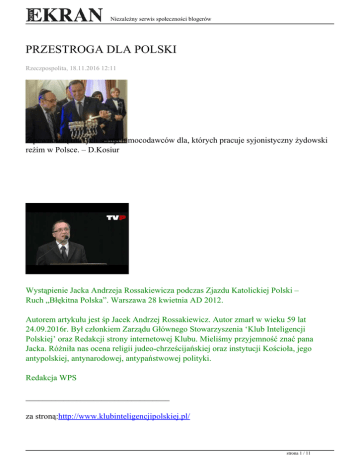 Niezależny serwis społeczności blogerów PRZESTROGA DLA POLSKI Rzeczpospolita, 18.11.2016 12:11 Z pewnością dla tych samych mocodawców dla, których pracuje syjonistyczny żydowski reżim w Polsce. – D.Kosiur Wystąpienie Jacka Andrzeja Rossakiewicza podczas Zjazdu Katolickiej Polski – Ruch „Błękitna Polska”. Warszawa 28 kwietnia AD 2012. Autorem artykułu jest śp Jacek Andrzej Rossakiewicz. Autor zmarł w wieku 59 lat 24.09.2016r. Był członkiem Zarządu Głównego Stowarzyszenia ‘Klub Inteligencji Polskiej’ oraz Redakcji strony internetowej Klubu. Mieliśmy przyjemność znać pana Jacka. Różniła nas ocena religii judeo-chrześcijańskiej oraz instytucji Kościoła, jego antypolskiej, antynarodowej, antypaństwowej polityki. Redakcja WPS __________________________________ za stroną:http://www.klubinteligencjipolskiej.pl/ strona 1 / 11 Niezależny serwis społeczności blogerów Strzeżcie się fałszywych proroków, którzy przychodzą do was w odzieniu owczym, wewnątrz zaś są wilkami drapieżnymi! Po ich owocach poznacie ich. Czyż zbierają winogrona z cierni albo z ostu figi? Ewangelia Św. Mateusza, 17:15-16 Przypowieść Jezusa dobrze charakteryzuje sposób realizacji i cele współczesnej polityki USA. Stany Zjednoczone zajmują obecnie wyjątkową pozycję na świecie. Po upadku Związku Radzieckiego stały się hegemonem w polityce światowej i roszczą sobie prawo do decydowania o losie innych narodów i państw. Kiedy zawodzi droga dyplomatyczna, USA nie wahają się wysłać swoich wojsk, aby za pomocą militarnej agresji zaprowadzić swój porządek, coraz częściej zwany Pax Americana. Czy jednak o pokój i wolność chodzi rządowi USA? Należy w to wątpić. Nie ma mowy także o wspólnych z innymi państwami cywilizacji łacińskiej celach, ani o wspólnie wyznawanych wartościach. Dotyczy to oczywiście rządu USA a nie amerykańskiego Narodu. Rząd Stanów Zjednoczonych Ameryki Północnej kieruje się innym systemem wartości niż amerykański Naród i narody pozostałych państw cywilizacji łacińskiej, a także innym niż większość Narodów Świata. Najlepszym probierzem wartości realizowanych przez rząd USA jest prześledzenie strona 2 / 11 Niezależny serwis społeczności blogerów wyników głosowań Zgromadzenia Ogólnego ONZ. Obnaża ono RZECZYWISTY – a nie deklarowany – system wartości i wskazuje na pokrewieństwo celów rządu USA jedynie z Izraelem. Oto niewielki wybór z zestawienia jakiego dokonał William Blum [1] w książce Państwo zła.Przewodnik po mrocznym imperium, (Rogue State. A Guide to the World’s Only Superpower). [2] Na dwunastu stronach rozdziału 20. Stany Zjednoczone kontra reszta świata na forum ONZ, William Blum podaje przedmiot i datę głosowania, numer rezolucji i wynik głosowania. Ze 150 przytoczonych przez niego głosowań podam wynik 25 najbardziej charakterystycznych: – Apel do Rady Bezpieczeństwa aby podjęła wszelkie możliwe kroki dla egzekwowania postanowień ONZ w sprawie zachowania pokoju i bezpieczeństwa na świecie: 119 państw głosowało za / 2 państwa przeciw: USA i Izrael. – Warunki życia Palestyńczyków: 110 głosów za / 2 głosy przeciw: USA i Izrael. – Potępienie Izraela za liczne przypadki łamania praw człowieka na okupowanych terytoriach: 97 państw za / 3 państwa przeciw: USA, Izrael, Gwatemala – Ułatwienia eksportowe dla krajów rozwijających się: 111 glosów za / 1 głos przeciw: USA. – Zróżnicowanie polityki ONZ w podejściu do realizacji praw człowieka i jego podstawowych swobód: 136 państw za / 1 głos przeciw: USA. – Powrót wypędzonych przez Izrael na ich rdzenne ziemie: 121 głosów za / 3 głosy przeciw: USA, Izrael, Australia – Wznowienie rozmów w sprawie rozbrojenia i zaprzestania wyścigu zbrojeń: 120 za / 3 przeciw USA, W.Brytania, Francja –Wezwanie Izraela do zaniechania aktów łamania praw człowieka: 111 za / 2 przeciw: USA. Izrael – Sprzeciw wobec ingerencji w politykę wewnętrzną państw: 104 głosów za / 2 przeciw: USA, Izrael – Apel o przygotowanie i zorganizowanie konferencji w sprawie kobiet: 121 za / 2 przeciw: USA, Izrael strona 3 / 11 Niezależny serwis społeczności blogerów –Apel o nowy Międzynarodowy Ład Ekonomiczny promujący rozwój krajów rozwijających się i międzynarodową współpracę gospodarczą: 134 głosów za /1 głos przeciw: USA –Zakaz użycia broni jądrowej przeciwko państwom jej nieposiadającym: 110 za / 2 głos przeciw: USA, Albania – Włączenie prawa do rozwoju narodów i jednostek do pakietu praw człowieka: 120 za / 1 głos przeciw: USA –Wsparcie dla inicjatyw spółdzielczych w krajach rozwijających się(rolnictwo, kasy oszczędnościowo-pożyczkowe, budownictwo, ochrona konsumenta, usługi socjalne itd.) : 123 za / 1 głos przeciw: USA –Prawo każdego państwa do wyboru systemu społeczno-ekonomicznego zgodnie z wolą narodu, bez jakichkolwiek ingerencji z zewnątrz: 126 za /1 głos przeciw: USA – Ustanowienie na bliskim wschodzie strefy wolnej od broni jądrowej: 107 za /2 głosy przeciw: USA, Izrael – Włączenie prawa do nauki, pracy, opieki zdrowotnej, prawidłowego odżywiania się, rozwoju narodowego i in. do pakietu praw człowieka: 135 za /1 głos przeciw: USA – Wezwanie do ustanowienia nowego i bardziej sprawiedliwego porządku światowej informacji i łącznści: 147 za / 2 głosy przeciw: USA, Izrael – Międzynarodowa Konwencja w sprawie Likwidacji i Karania za Zbrodnię Apartheidu: 110 za /1 głos przeciw: USA – Upamiętnienie 25 rocznicy Deklaracji Przyznania Niepodległości Krajom i Narodom Kolonialnym: 143 za /1 głos przeciw: USA – Deklaracja o prawie do rozwoju: 146 głosów za /1 głos przeciw: USA – Ochrona przed produktami szkodliwymi dla zdrowia i środowiska: 146 głosów za /1 głos przeciw: USA – Współpraca ONZ z Ligą Państw Arabskich: 153 głosów za /2 głosy przeciw: USA, Izrael – Apel o „konwencję 