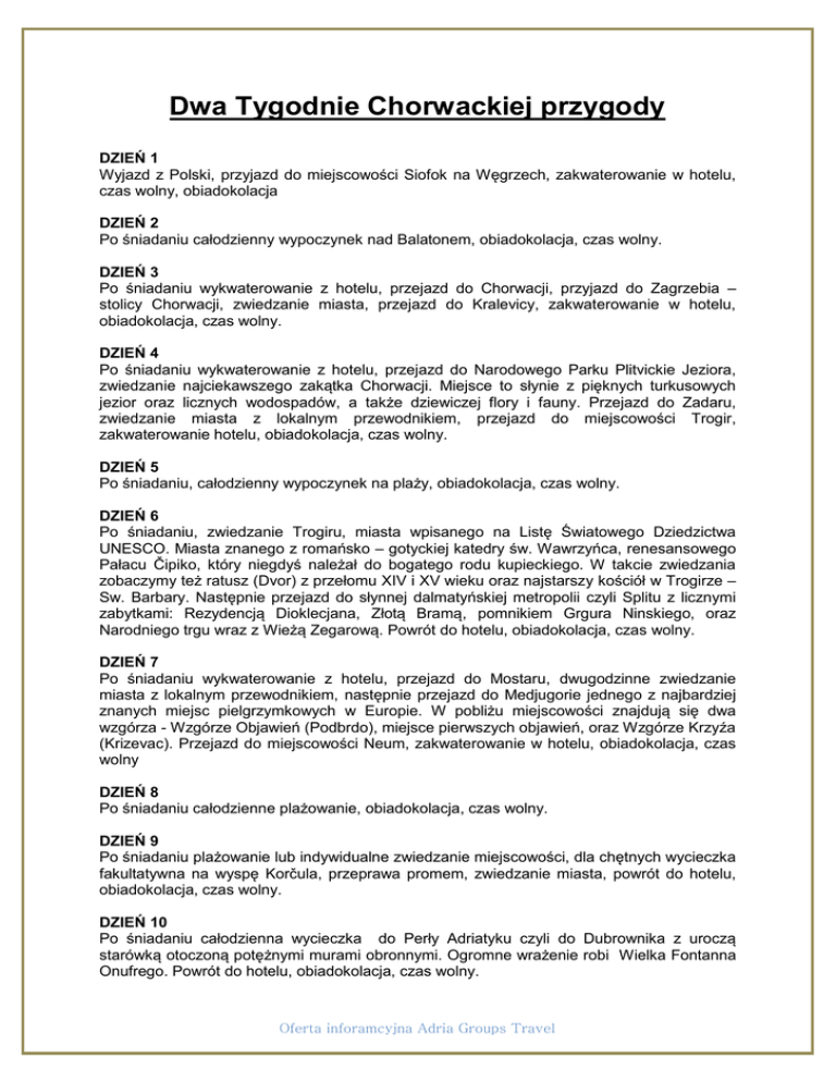 Dwa Tygodnie Chorwackiej przygody DZIEŃ 1 Wyjazd z Polski, przyjazd do miejscowości Siofok na Węgrzech, zakwaterowanie w hotelu, czas wolny, obiadokolacja DZIEŃ 2 Po śniadaniu całodzienny wypoczynek nad Balatonem, obiadokolacja, czas wolny. DZIEŃ 3 Po śniadaniu wykwaterowanie z hotelu, przejazd do Chorwacji, przyjazd do Zagrzebia – stolicy Chorwacji, zwiedzanie miasta, przejazd do Kralevicy, zakwaterowanie w hotelu, obiadokolacja, czas wolny. DZIEŃ 4 Po śniadaniu wykwaterowanie z hotelu, przejazd do Narodowego Parku Plitvickie Jeziora, zwiedzanie najciekawszego zakątka Chorwacji. Miejsce to słynie z pięknych turkusowych jezior oraz licznych wodospadów, a także dziewiczej flory i fauny. Przejazd do Zadaru, zwiedzanie miasta z lokalnym przewodnikiem, przejazd do miejscowości Trogir, zakwaterowanie hotelu, obiadokolacja, czas wolny. DZIEŃ 5 Po śniadaniu, całodzienny wypoczynek na plaży, obiadokolacja, czas wolny. DZIEŃ 6 Po śniadaniu, zwiedzanie Trogiru, miasta wpisanego na Listę Światowego Dziedzictwa UNESCO. Miasta znanego z romańsko – gotyckiej katedry św. Wawrzyńca, renesansowego Pałacu Čipiko, który niegdyś należał do bogatego rodu kupieckiego. W takcie zwiedzania zobaczymy też ratusz (Dvor) z przełomu XIV i XV wieku oraz najstarszy kościół w Trogirze – Sw. Barbary. Następnie przejazd do słynnej dalmatyńskiej metropolii czyli Splitu z licznymi zabytkami: Rezydencją Dioklecjana, Złotą Bramą, pomnikiem Grgura Ninskiego, oraz Narodniego trgu wraz z Wieżą Zegarową. Powrót do hotelu, obiadokolacja, czas wolny. DZIEŃ 7 Po śniadaniu wykwaterowanie z hotelu, przejazd do Mostaru, dwugodzinne zwiedzanie miasta z lokalnym przewodnikiem, następnie przejazd do Medjugorie jednego z najbardziej znanych miejsc pielgrzymkowych w Europie. W pobliżu miejscowości znajdują się dwa wzgórza - Wzgórze Objawień (Podbrdo), miejsce pierwszych objawień, oraz Wzgórze Krzyźa (Krizevac). Przejazd do miejscowości Neum, zakwaterowanie w hotelu, obiadokolacja, czas wolny DZIEŃ 8 Po śniadaniu całodzienne plażowanie, obiadokolacja, czas wolny. DZIEŃ 9 Po śniadaniu plażowanie lub indywidualne zwiedzanie miejscowości, dla chętnych wycieczka fakultatywna na wyspę Korčula, przeprawa promem, zwiedzanie miasta, powrót do hotelu, obiadokolacja, czas wolny. DZIEŃ 10 Po śniadaniu całodzienna wycieczka do Perły Adriatyku czyli do Dubrownika z uroczą starówką otoczoną potężnymi murami obronnymi. Ogromne wrażenie robi Wielka Fontanna Onufrego. Powrót do hotelu, obiadokolacja, czas wolny. Oferta inforamcyjna Adria Groups Travel DZIEŃ 11 Po śniadaniu wykwaterowanie z hotelu, przejazd do miejscowości Omis, zakwaterowanie w hotelu, odpoczynek na plaży, obiadokolacja, czas wolny DZIEŃ 12 Po śniadaniu wykwaterowanie z hotelu, przejazd do Sibenika, XI-wiecznego miasta z katedrą Św. Jakuba, Pałacem Rektorów (Kneževa Palača), kościółem Św. Jana Chrzciciela z XVI wieku oraz cerkwią Św. Spasa z XVI wieku, gdzie znajduje się zbiór ikon, zwiedzanie miasta z lokalnym przewodnikiem, przejazd do miejscowości Karlobag, zakwaterowanie w hotelu Zagreb 3*, obiadokolacja, czas wolny. DZIEŃ 13 Śniadanie, wykwaterowanie z hotelu, przyjazd do Budapesztu, zwiedzanie miasta, zakwaterowanie w hotelu, obiadokolacja, czas wolny DZIEŃ 14 Śniadanie, wykwaterowanie z hotelu, przejazd do Polski Świadczenia zawarte w cenie: zakwaterowanie: W hotelach 2 i 3* oraz 2 noclegi tranzytowe (13 noclegów) wyżywienie HB (śniadania i obiadokolacje) taksy klimatyczne ubezpieczenie Cena od: 320 Eur/os Do ceny dolicz: bilety wstępu oraz wycieczki w trakcie pobytu miejscowych przewodników pilota autokaru Oferta inforamcyjna Adria Groups Travel