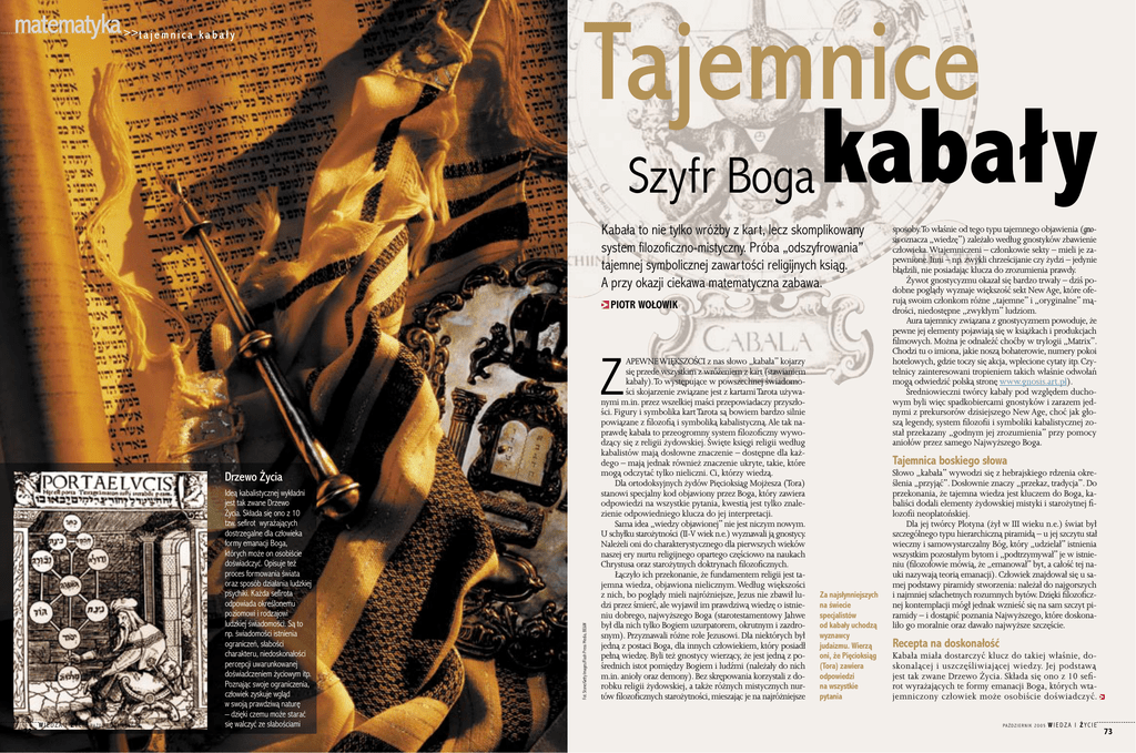 matematyka >>t a j e m n i c a k a b a ł y Tajemnice Szyfr Boga kabały Kabała to nie tylko wróżby z kart, lecz skomplikowany system filozoficzno-mistyczny. Próba „odszyfrowania” tajemnej symbolicznej zawartości religijnych ksiąg. A przy okazji ciekawa matematyczna zabawa. PIOTR WOŁOWIK Z 72 WIEDZA I ŻYCIE PA Ź D Z I E R N I K 2 0 0 5 Ideą kabalistycznej wykładni jest tak zwane Drzewo Życia. Składa się ono z 10 tzw. sefirot wyrażających dostrzegalne dla człowieka formy emanacji Boga, których może on osobiście doświadczyć. Opisuje też proces formowania świata oraz sposób działania ludzkiej psychiki. Każda sefirota odpowiada określonemu poziomowi i rodzajowi ludzkiej świadomości. Są to np. świadomości istnienia ograniczeń, słabości charakteru, niedoskonałości percepcji uwarunkowanej doświadczeniem życiowym itp. Poznając swoje ograniczenia, człowiek zyskuje wgląd w swoją prawdziwą naturę – dzięki czemu może starać się walczyć ze słabościami Fot. Stone/Getty Images/Flash Press Media, BE&W Drzewo Życia APEWNE WIĘKSZOŚCI z nas słowo „kabała” kojarzy się przede wszystkim z wróżeniem z kart (stawianiem kabały). To występujące w powszechnej świadomości skojarzenie związane jest z kartami Tarota używanymi m.in. przez wszelkiej maści przepowiadaczy przyszłości. Figury i symbolika kart Tarota są bowiem bardzo silnie powiązane z filozofią i symboliką kabalistyczną. Ale tak naprawdę kabała to przeogromny system filozoficzny wywodzący się z religii żydowskiej. Święte księgi religii według kabalistów mają dosłowne znaczenie – dostępne dla każdego – mają jednak również znaczenie ukryte, takie, które mogą odczytać tylko nieliczni. Ci, którzy wiedzą. Dla ortodoksyjnych żydów Pięcioksiąg Mojżesza (Tora) stanowi specjalny kod objawiony przez Boga, który zawiera odpowiedzi na wszystkie pytania, kwestią jest tylko znalezienie odpowiedniego klucza do jej interpretacji. Sama idea „wiedzy objawionej” nie jest niczym nowym. U schyłku starożytności (II-V wiek n.e.) wyznawali ją gnostycy. Należeli oni do charakterystycznego dla pierwszych wieków naszej ery nurtu religijnego opartego częściowo na naukach Chrystusa oraz starożytnych doktrynach filozoficznych. Łączyło ich przekonanie, że fundamentem religii jest tajemna wiedza, objawiona nielicznym. Według większości z nich, bo poglądy mieli najróżniejsze, Jezus nie zbawił ludzi przez śmierć, ale wyjawił im prawdziwą wiedzę o istnieniu dobrego, najwyższego Boga (starotestamentowy Jahwe był dla nich tylko Bogiem uzurpatorem, okrutnym i zazdrosnym). Przyznawali różne role Jezusowi. Dla niektórych był jedną z postaci Boga, dla innych człowiekiem, który posiadł pełną wiedzę. Byli też gnostycy wierzący, że jest jedną z pośrednich istot pomiędzy Bogiem i ludźmi (należały do nich m.in. anioły oraz demony). Bez skrępowania korzystali z dorobku religii żydowskiej, a także różnych mistycznych nurtów filozoficznych starożytności, mieszając je na najróżniejsze sposoby.To właśnie od tego typu tajemnego objawienia (gnosis oznacza „wiedzę”) zależało według gnostyków zbawienie człowieka. Wtajemniczeni – członkowie sekty – mieli je zapewnione. Inni – np. zwykli chrześcijanie czy żydzi – jedynie błądzili, nie posiadając klucza do zrozumienia prawdy. Żywot gnostycyzmu okazał się bardzo trwały – dziś podobne poglądy wyznaje większość sekt New Age, które oferują swoim członkom różne „tajemne” i „oryginalne” mądrości, niedostępne „zwykłym” ludziom. Aura tajemnicy związana z gnostycyzmem powoduje, że pewne jej elementy pojawiają się w książkach i produkcjach filmowych. Można je odnaleźć choćby w trylogii „Matrix”. Chodzi tu o imiona, jakie noszą bohaterowie, numery pokoi hotelowych, gdzie toczy się akcja, wplecione cytaty itp. Czytelnicy zainteresowani tropieniem takich właśnie odwołań mogą odwiedzić polską stronę www.gnosis.art.pl). Średniowieczni twórcy kabały pod względem duchowym byli więc spadkobiercami gnostyków i zarazem jednymi z prekursorów dzisiejszego New Age, choć jak głoszą legendy, system filozofii i symboliki kabalistycznej został przekazany „godnym jej zrozumienia” przy pomocy aniołów przez samego Najwyższego Boga. Tajemnica boskiego słowa Za najsłynniejszych na świecie specjalistów od kabały uchodzą wyznawcy judaizmu. Wierzą oni, że Pięcioksiąg (Tora) zawiera odpowiedzi na wszystkie pytania Słowo „kabała” wywodzi się z hebrajskiego rdzenia określenia „przyjąć”. Dosłownie znaczy „przekaz, tradycja”. Do przekonania, że tajemna wiedza jest kluczem do Boga, kabaliści dodali elementy żydowskiej mistyki i starożytnej filozofii neoplatońskiej. Dla jej twórcy Plotyna (żył w III wieku n.e.) świat był szczególnego typu hierarchiczną piramidą – u jej szczytu stał wieczny i samowystarczalny Bóg, który „udzielał” istnienia wszystkim pozostałym bytom i „podtrzymywał” je w istnieniu (filozofowie mówią, że „emanował” byt, a całość tej nauki nazywają teorią emanacji). Człowiek znajdował się u samej podstawy piramidy stworzenia: należał do najgorszych i najmniej szlachetnych rozumnych bytów. Dzięki filozoficznej kontemplacji mógł jednak wznieść się na sam szczyt piramidy – i dostąpić poznania Najwyższego, które doskonaliło go moralnie oraz dawało najwyższe szczęście. Recepta na doskonałość Kabała miała dostarczyć klucz do takiej właśnie, doskonalącej i uszczęśliwiającej wiedzy. Jej podstawą jest tak zwane Drzewo Życia. Składa się ono z 10 sefirot wyrażających te formy emanacji Boga, których wtajemniczony człowiek może osobiście doświadczyć. PA Ź D Z I E R N I K 2 0 0 5 WIEDZA I ŻYCIE 73 Gematria – święta geometria Każda sefirota odpowiada określonemu poziomowi ludzkiej świadomości: są to 