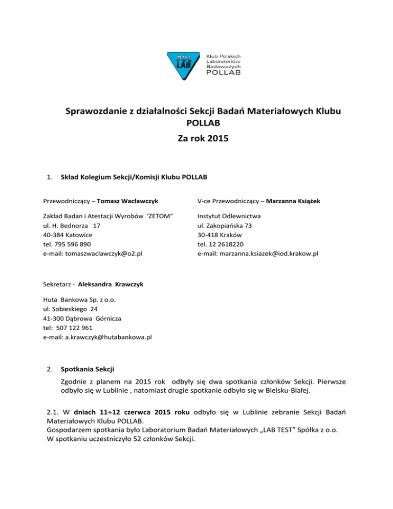 Sprawozdanie z działalności Sekcji Badań Materiałowych Klubu POLLAB Za rok 2015 1. Skład Kolegium Sekcji/Komisji Klubu POLLAB Przewodniczący – Tomasz Wacławczyk V-ce Przewodniczący – Marzanna Książek Zakład Badan i Atestacji Wyrobów ‘ZETOM” ul. H. Bednorza 17 40-384 Katowice tel. 795 596 890 e-mail: [email protected] Instytut Odlewnictwa ul. Zakopiańska 73 30-418 Kraków tel. 12 2618220 e-mail: [email protected] Sekretarz - Aleksandra Krawczyk Huta Bankowa Sp. z o.o. ul. Sobieskiego 24 41-300 Dąbrowa Górnicza tel: 507 122 961 e-mail: [email protected] 2. Spotkania Sekcji Zgodnie z planem na 2015 rok odbyły się dwa spotkania członków Sekcji. Pierwsze odbyło się w Lublinie , natomiast drugie spotkanie odbyło się w Bielsku-Białej. 2.1. W dniach 1112 czerwca 2015 roku odbyło się w Lublinie zebranie Sekcji Badań Materiałowych Klubu POLLAB. Gospodarzem spotkania było Laboratorium Badań Materiałowych „LAB TEST” Spółka z o.o. W spotkaniu uczestniczyło 52 członków Sekcji. Pierwszego dnia 11 czerwca, sesja rozpoczęła się od spotkania uczestników zebrania na terenie Hotelu MERCURE Lublin Centrum w Lublinie. Zebranie Sekcji Badań Materiałowych Klubu POLLAB otworzył Przewodniczący Sekcji Bogusław Marciniak. Przewodniczący powitał członków Sekcji, organizatora zebrania Małgorzatę Stępniak oraz prelegentów szkolenia. Przewodniczący Sekcji podziękował Gospodarzom za umożliwienie zorganizowanie spotkania. Pani Prezes Małgorzata Stępniak omówiła działalność firmy Laboratorium Badań Materiałowych „LAB TEST” Spółka z o.o. w Lublinie Dalszym etapem sesji przedpołudniowej było szkolenie zaprezentowane w formie referatów przez: - przedstawiciela Zakładu Obróbki Plastycznej w Świdniku – Dyrektora TechnicznoHandlowego Krzysztofa Drozdowskiego na temat: „Procesy kucia matrycowego odkuwek z metali lekkich oraz zastosowanie w przemyśle” oraz „Badanie plastyczności stopów magnezu AZ31 i AZ61 w warunkach przemysłowych na prasach śrubowych i młotach kuźniczych”; - przedstawiciela Firmy DAEWON EUROPE Sp. z o.o. – Szefa Departamentu Jakości Grzegorza Dadosa na temat: „Procesy produkcji sprężyn, drążków stabilizatora i resorów do samochodów” Sesja przedpołudniowa została zakończona zwiedzaniem firm działających na terenie dawnego DMP Lublin tj.: zwiedzanie Spółek: Kuźni Matrycowej i Daewon Europe przy ul. Frezerów w Lublinie. Na wieczornym spotkaniu Sekcji – Kolegium Sekcji Badań Materiałowych Klubu POLLAB uroczyście podziękowało za wieloletnią pracę społeczną w Sekcji Badań Materiałowych Panu Andrzejowi Piątkowskiemu. Drugi dzień spotkania 12 czerwca poświęcony był porównaniom międzylaboratoryjnym/badaniom biegłości oraz sprawą organizacyjnym Sekcji. Omówiono porównania międzylaboratoryjne/badania biegłości zakończone: Małgorzata Stępniak – Laboratorium Badań Materiałowych „LAB TEST” – koordynator badań - omówiła zakończone badanie: Próba udarności metodą Charpy’ego wg PN-EN ISO 148-1:2010; Agnieszka Zaczkowska-Gaca - ArcelorMittal S.A. – koordynator badań – omówiła zakończone badanie: Pomiar głębokości odwęglenia metodą metalograficzną zgodnie z PN-EN ISO 3887 Adam Jarosz - ArcelorMittal w Dąbrowie Górniczej – koordynator badań – omówił zakończone badanie: Przygotowanie odbitek Baumanna wg ISO 4968 oraz ich ocena wg PN-EN 13674-1 Andrzej Plewa – TDT Kraków – koordynator badań – omówił zakończone badanie: Pomiar grubości materiału metodą ultradźwiękową wg PN-EN 14127:2011. Porównania międzylaboratoryjne/badania w trakcie realizacji: Przedstawiciel Instytutu Spawalnictwa – Dawid Majewski omówił stan zaawansowania – „Badanie ultradźwiękowe złącza spawanego doczołowo”. Propozycje porównań międzylaboratoryjnych do realizacji: Małgorzata Stępniak – Laboratorium Badań Materiałowych „LAB TEST” – zaproponowała organizację obiektów do kolejnych badań w zakresie: próby rozciągania; pomiaru twardości metodą Vickersa, Brinella; badanie mikrostruktury stali badanie składu chemicznego stali wysokostopowej Obiektem do pierwszych trzech badań byłyby pręty ze stali sprężynowej. Antoni Rzepkowski – Politechnika Łódzka zaproponował organizację porównań w zakresie badania warstwy nawęglonej, Ryszard Bartz zaproponował zorganizowanie przez Instytut Spawalnictwa porównań w zakresie oceny przełomu połamaniu złączy spawanych Wszyscy koordynatorzy zobowiązali się do zaprezentowania na następne zebranie instrukcji postępowania przy powyższych badaniach. Przewodniczący Sekcji przypomniał członkom zebrania o formie zapisów na badania międzylaboratoryjne/badanie biegłości tj.: zapisy są prowadzone po ogłoszeniu informacji i planu porównań/biegłości na stronie Klubu POLLAB oraz do przestrzegania terminów określonych w w/w dokumentach dotyczących m.in. terminu zapisu oraz terminu realizacji badań i przekazania wyników badań wg załączonych dokumentów. Sprawy organizacyjne: Ryszard Bartz podziękował wszystkim członkom Sekcji za czynny udział w konferencji Łagów 2014 za uczestnictwo i wygłoszenie referatów. Następnie zaprosił na następną konferencję, która planowana jest w dniach 8÷11.06.2016. Obrady Sekcji Badań Materiałowych zakończył przewodniczący Sekcji, podziękował organizatorowi – Małgorzacie Stępniak za zorganizowanie spotkania w Lublinie. Przewodniczący Sekcji wraz z Janem Nowakiem zaprosił wszystkich członków na kolejne zebranie, które odbędzie się w Bielsku-Białej w dniach 89 październik 2015 roku. Organizatorem w/w spotkania Sekcji będzie Instytut Badań i Rozwoju Motoryzacji „BOSMAL” Spółka z. o.o. 2.2. W dniach 89 października 2015 roku odbyło się w Bielsku-Białej zebranie Sekcji Badań Materiałowych Klubu POLLAB. Gospodarzem spotkania był Instytut Badań i Rozwoju Motoryzacji „BOSMAL