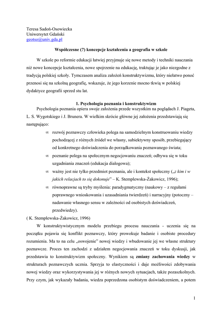 Teresa Sadoń-Osowiecka Uniwersytet Gdański [email protected] Współczesne (?) koncepcje kształcenia a geografia w szkole W szkole po reformie edukacji łatwiej przyjmuje się nowe metody i techniki nauczania niż nowe koncepcje kształcenia, nowe spojrzenie na edukację, traktując je jako niezgodne z tradycją polskiej szkoły. Tymczasem analiza założeń konstruktywizmu, który niełatwo ponoć przenosi się na szkolną geografię, wskazuje, że jego korzenie mocno tkwią w polskiej dydaktyce geografii sprzed stu lat. 1. Psychologia poznania i konstruktywizm Psychologia poznania opiera swoje założenia przede wszystkim na poglądach J. Piageta, L. S. Wygotskiego i J. Brunera. W wielkim skrócie główne jej założenia przedstawiają się następująco: • rozwój poznawczy człowieka polega na samodzielnym konstruowaniu wiedzy pochodzącej z różnych źródeł we własny, subiektywny sposób, przebiegający od konkretnego doświadczenia do porządkowania poznawanego świata; • poznanie polega na społecznym negocjowaniu znaczeń; odbywa się w toku uzgadniania znaczeń (edukacja dialogowa); • ważny jest nie tylko przedmiot poznania, ale i kontekst społeczny („z kim i w jakich relacjach to się dokonuje” – K. Stemplewska-Żakowicz, 1996); • równoprawne są tryby myślenia: paradygmatyczny (naukowy – z regułami poprawnego wnioskowania i uzasadniania twierdzeń) i narracyjny (potoczny – nadawanie własnego sensu w zależności od osobistych doświadczeń, przedwiedzy). ( K. Stemplewska-Żakowicz, 1996) W konstruktywistycznym modelu przebiegu procesu nauczania - uczenia się na początku pojawia się konflikt poznawczy, który prowokuje badanie i osobiste procedury rozumienia. Ma to na celu „oswojenie” nowej wiedzy i wbudowanie jej we własne struktury poznawcze. Proces ten zachodzi z udziałem negocjowania znaczeń w toku dyskusji, jak przedstawia to konstruktywizm społeczny. Wynikiem są zmiany zachowania wiedzy w strukturach poznawczych ucznia. Sprzyja to elastyczności i daje możliwości zdobywania nowej wiedzy oraz wykorzystywania jej w różnych nowych sytuacjach, także pozaszkolnych. Przy czym, jak wykazały badania, wiedza poprzedzona osobistym doświadczeniem, a potem 1 ugruntowana przez przekaz, jest trwalsza niż wiedza z przekazu. Taka wiedza jest też odporna na manipulacje i indoktrynację (K. Stemplewska-Żakowicz, 1996). D. Klus-Stańska (2002) proponuje, jak przełożyć założenia konstruktywizmu na szkolną praktykę: 1. Doświadczanie chaosu poznawczego przez uczniów (poczucie problematyczności sądów, niepewności dróg poszukiwań, niejednoznaczności pojęć i obiektów), będące motywacją do samodzielnych poszukiwań, badań; 2. Uczenie się nie samych teorii ale budowania ich przez uczniów w oparciu o racjonalne przesłanki; 3. Szukanie nowych dróg rozwiązań problemu rozpatrywanego z różnych punktów widzenia; 4. Sprzyjanie zadawaniu pytań przez ucznia; poszukiwanie przez niego problemów. Takie podejście do nauczania współgra z poglądami głoszonymi przez brytyjskich dydaktyków geografii, podkreślających znaczenia myślenia geograficznego we współczesnych czasach, ujmującego problemy całościowo, „z lotu ptaka”, z różnych punktów widzenia. Geografia, jak żaden inny przedmiot szkolny, oferuje potęgę krytycznego myślenia o miejscu w różnych aspektach naszego skomplikowanego, powiązanego siecią zależności świata. Brytyjscy geografowie zwracają uwagę nie na rezultat uczenia się, ale na drogi zdobywania wiedzy (D. Lambert, 1999; J. Morgan, 2002). Nie jest ważne „co” uczeń myśli, ale „jak” myśli (D. Klus-Stańska, 2002). 2. Aktualność poglądów E. Romera i W. Nałkowskiego Po przeanalizowaniu obecnych szkolnych podręczników geografii i poradników metodycznych oraz porównaniu ich z poglądami na nauczanie polskich dydaktyków geografii z początków XX wieku nasuwa się wniosek o aktualności niektórych zaleceń dawnych polskich geografów E. Romera i W. Nałkowskiego. Ważną rolę w kształceniu geograficznym według Romera i Nałkowskiego odgrywa myślenie indukcyjne, polegające na formułowaniu ogólnych wniosków na podstawie jednostkowych doświadczeń, obserwacji. Możliwości zdobywania informacji geograficznych były w porównaniu z czasami współczesnymi znikome, ale samo podejście do nauczania, uprawomocniające samodzielne wyciąganie wniosków przez ucznia było początkiem konstruowania wiedzy w bardzo współczesnym rozumieniu. E. Romer podkreślał samodzielne dochodzenie ucznia do wiedzy prowadzące do jej trwałości, aktywność badawczą ucznia: „Uczeń nie mówi, ani nie myśli o niczem, czego zmysłami przedtem nie objął. Każda lekcja staje się samodzielną, twórczą pracą młodzieży – własnych tworów się nie 2 zapomina!” (E. Romer, 1906, za: A. Chałubińska, 1959). Dopuszczał również język potoczny, kładąc nacisk na wewnętrzną spójność uczniowskich teorii: „według metody dogmatycznej dobrą odpowiedzią jest reprodukcja pojęć z wykładu, czy też z książki; w zastosowaniu metody heurystycznej jest każda odpowiedź dobrą, o ile tylko z niej wnosić można, że uczeń rzecz zrozumiał. Zawsze baczyć musimy na to, że odpowiedź ucznia jest w zastosowaniu metody heurystycznej jego własnym tworem.” (E. Romer, 1906, za: A. Chałubińska, 1959). Nałkowski podkreśla „naturalność” zdobywania wiedzy geograficznej w całym cyklu kształcenia: od obserwacji zjawisk, kiedy to uczeń jak człowiek pierwotny „ocenia ich pożyteczność lub szkodliwość, zużytkowuje je dla swych potrzeb, orientuje się, kreśli nieraz plan okolicy z wielką dokładnością” (W. Nałkowski, 1908), do formułowania uogólnień, wniosków. Za równoprawne uważa zdobywanie wiedzy także z innych źródeł (przedwiedza) np. korzystanie z informacji o miejscach zamieszkania przekazywane przez innych uczniów, z opowieści podró