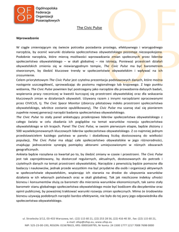 The Civic Pulse Wprowadzenie W ciągle zmieniającym się świecie potrzeba posiadania prostego, efektywnego i wiarygodnego narzędzia, by ocenić warunki działania społeczeństwa obywatelskiego pozostaje niezaspokojona. Podobnie narzędzia, które mierzą możliwości wprowadzania zmian społecznych przez liderów społeczeństwa obywatelskiego – w skali globalnej – nie istnieją. Ponieważ przestrzeń działań obywatelskich zmienia się w niewiarygodnym tempie, The Civic Pulse ma być barometrem stworzonym, by śledzić kluczowe trendy w społeczeństwie obywatelskim i wpływać na ich zrozumienie. Celem priorytetowym The Civic Pulse jest czytelna prezentacja podstawowych danych, które można następnie uszczegółowić, sprowadzając do poziomu regionalnego lub krajowego. Z tego punktu widzenia, The Civic Pulse powinien być postrzegany jako narzędzie dla prowadzenia dalszych badań, wspierania pracy rzeczniczej w kwestii kurczącej się przestrzeni obywatelskiej oraz dla wskazania kluczowych zmian w działaniach obywateli. Używany razem z innymi narzędziami opracowanymi przez CIVICUS, tj. The Civic Space Monitor (zbiorczy pilotażowy indeks przestrzeni społeczeństwa obywatelskiego, wkrótce zostanie opublikowany), The Civic Pulse ma szansę stać się pionierem zupełnie nowej generacji narzędzi badania społeczeństwa obywatelskiego. The Civic Pulse to stały panel ankietujący przekrojowo liderów społeczeństwa obywatelskiego z całego świata w celu zbadania ich poglądów na temat warunków rozwoju społeczeństwa obywatelskiego w ich krajach. Panel The Civic Pulse, w swoim pierwszym etapie, będzie złożony z 500 wyselekcjonowanych kluczowych liderów społeczeństwa obywatelskiego. Z co najmniej jednym przedstawicielem każdego państwa w panelu i dodatkową liczbą dostosowaną do wielkości populacji, The Civic Pulse ma objąć całe społeczeństwo obywatelskie w jego różnorodności, znajdując jednocześnie synergię pomiędzy aktorami umiejscowionymi w różnych obszarach geograficznych. Ankieta będzie rozsyłana co kwartał po to, by śledzić zmiany w czasie i przestrzeni. The Civic Pulse jest tak zaprojektowany, by dostarczał regularnych, aktualnych, dostosowanych do potrzeb i czytelnych danych na temat przestrzeni obywatelskiej. Narzędzie z pewnością będzie pomocne dla badaczy i naukowców, jednak przede wszystkim ma być przydatne dla osób i organizacji aktywnych w społeczeństwie obywatelskim, wspierając ich starania na drodze do ulepszenia warunków działania w ich własnych państwach oraz w skali globalnej. Tak jak niezliczone indeksy ufności biznesu i konsumentów służą za barometr dla mierzenia warunków ekonomicznych, tak samo stały barometr stanu globalnego społeczeństwa obywatelskiego może być bodźcem dla decydentów oraz opinii publicznej, by poważniej traktować warunki rozwoju zmian społecznych. Mimo że środowiska biznesu używają podobnych narzędzi bardzo efektywnie, nie było do tej pory jego odpowiednika dla społeczeństwa obywatelskiego. ul. Strzelecka 3/12, 03-433 Warszawa, tel.: (22) 115 60 21, (22) 253 28 56, (22) 416 40 30 , fax: (22) 115 60 21, e-mail: [email protected], www.ofop.eu NIP: 525-23-00-193, REGON: 015678615, KRS: 0000169795, Nr konta: 24 1500 1777 1217 7008 7698 0000 Tło CIVICUS jest jedyną światową siecią organizacji pozarządowych i aktywistów mającą na celu wzmacnianie działań obywatelskich oraz sektora pozarządowego na całym świecie. Jesteśmy umiejscowieni w Johannesburgu, w RPA, i mamy ponad 1000 członków w więcej niż 120 krajach. Jako że jesteśmy prawdziwie globalną siecią, nasi członkowie są naturalnymi respondentami dla panelu The Civic Pulse. Różnorodność jest główną cechą tej sieci, co pozwala nam zobrazować jak odmienne są sytuacje społeczeństw obywatelskich w różnych częściach globu. CIVICUS jest więc idealnym kandydatem, by poprowadzić ten ambitny projekt. Baza członkowska CIVICUSA oraz międzynarodowy profil zapewniają niezbędny zasięg, by rozpocząć projekt o tej skali. Metodologia Próba Kto weźmie udział w globalnym panelu opinii? W ramach programu pilotażowego, CIVICUS zamierza zrekrutować 500 wiodących, cieszących się zaufaniem liderów społeczeństwa obywatelskiego. Podczas gdy spora liczba liderów będzie bezpośrednimi współpracownikami CIVICUS-a, część z nich będzie zrekrutowana przez jednego z członków panelu opinii lub też przez ekstensywną sieć organizacji. Chcąc dać przestrzeń nowym perspektywom, CIVICUS uwzględni nowe głosy sektora obok zaufanych, sprawdzonych partnerów. The Civic Pulse będzie stosował dobór kwotowy. Próba zostanie tak podzielona by pasować do odpowiednich kryteriów i by zapewnić udział jak najszerszej grupy o odmiennych perspektywach. Grupy w panelu: - Co najmniej jeden członek Globalnego Panelu Opinii na kraj (tj. 210 organizacji) - Dodatkowa ilość członków adekwatnie do wielkości populacji (190 organizacji w sumie) - 10% całości Globalnego Panelu Opinii będzie zorientowana globalnie, tj. na liderów międzynarodowych organizacji pozarządowych (w liczbie ok. 50) - dodatkowa przestrzeń dla sieci i organizacji typu „parasolowego” (50-60) Ankiety dostosowane do kraju W celu zapewnienia adekwatnej interakcji pomiędzy analizą na poziomie globalnym i analizą na poziomie krajowym przeprowadzone zostaną ankiety na terenie wybranych krajów. W proces zaangażowany będzie panel około 300 liderów organizacji pozarządowych z danego kraju. W ramach projektu pilotażowego, CIVICUS przetestuje ankiety w państwach Afryki Południowej. ul. Strzelecka 3/12, 03-433 Warszawa, tel.: (22) 115 60 21, (22) 253 28 56, (22) 416 40 30 , fax: (22) 115 60 21, e-mail: [email protected], www.ofop.eu NIP: 525-23-00-193, REGON: 015678615, KRS: 0000169795, Nr konta: 24 1500 1777 1217 7008 7698 0000 Wydobywanie danych Innym sposobem weryfikowania wyników the Civic Pulse będ