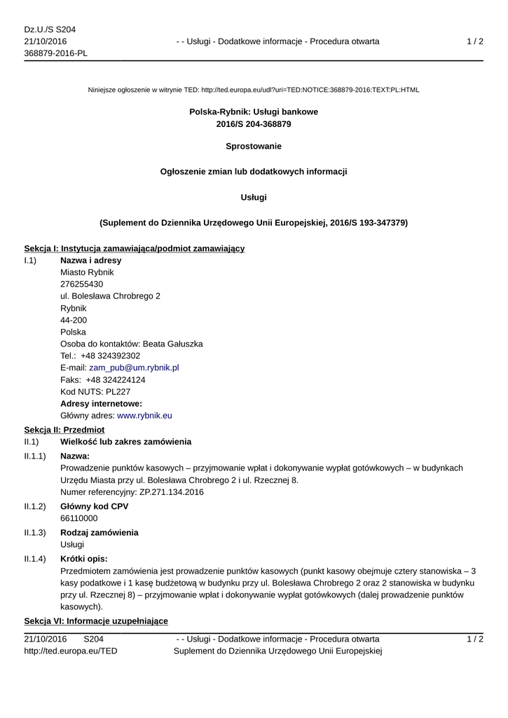 Dz.U./S S204 21/10/2016 368879-2016-PL - - Usługi - Dodatkowe informacje - Procedura otwarta 1/2 Niniejsze ogłoszenie w witrynie TED: http://ted.europa.eu/udl?uri=TED:NOTICE:368879-2016:TEXT:PL:HTML Polska-Rybnik: Usługi bankowe 2016/S 204-368879 Sprostowanie Ogłoszenie zmian lub dodatkowych informacji Usługi (Suplement do Dziennika Urzędowego Unii Europejskiej, 2016/S 193-347379) Sekcja I: Instytucja zamawiająca/podmiot zamawiający I.1) Nazwa i adresy Miasto Rybnik 276255430 ul. Bolesława Chrobrego 2 Rybnik 44-200 Polska Osoba do kontaktów: Beata Gałuszka Tel.: +48 324392302 E-mail: [email protected] Faks: +48 324224124 Kod NUTS: PL227 Adresy internetowe: Główny adres: www.rybnik.eu Sekcja II: Przedmiot II.1) Wielkość lub zakres zamówienia II.1.1) Nazwa: Prowadzenie punktów kasowych – przyjmowanie wpłat i dokonywanie wypłat gotówkowych – w budynkach Urzędu Miasta przy ul. Bolesława Chrobrego 2 i ul. Rzecznej 8. Numer referencyjny: ZP.271.134.2016 II.1.2) Główny kod CPV 66110000 II.1.3) Rodzaj zamówienia Usługi II.1.4) Krótki opis: Przedmiotem zamówienia jest prowadzenie punktów kasowych (punkt kasowy obejmuje cztery stanowiska – 3 kasy podatkowe i 1 kasę budżetową w budynku przy ul. Bolesława Chrobrego 2 oraz 2 stanowiska w budynku przy ul. Rzecznej 8) – przyjmowanie wpłat i dokonywanie wypłat gotówkowych (dalej prowadzenie punktów kasowych). Sekcja VI: Informacje uzupełniające 21/10/2016 S204 http://ted.europa.eu/TED - - Usługi - Dodatkowe informacje - Procedura otwarta Suplement do Dziennika Urzędowego Unii Europejskiej 1/2 Dz.U./S S204 21/10/2016 368879-2016-PL - - Usługi - Dodatkowe informacje - Procedura otwarta VI.5) Data wysłania niniejszego ogłoszenia: 19/10/2016 VI.6) Numer pierwotnego ogłoszenia Numer ogłoszenia w Dz.Urz. UE – OJ/S: 2016/S 193-347379 2/2 Sekcja VII: Zmiany VII.1) Informacje do zmiany lub dodania VII.1.2) Tekst, który należy poprawić w pierwotnym ogłoszeniu Numer sekcji: II.2.4 Miejsce, w którym znajduje się tekst do modyfikacji: Opis zamówienia Zamiast: (...) 6.Środki pieniężne z tytułu przyjętych wpłat gotówkowych Wykonawca będzie przekazywał na wskazane rachunki bankowe Zamawiającego w dniu dokonania tych operacji. 7.Wykonawca będzie przekazywał Zamawiającemu drogą elektroniczną oraz w formie papierowej informacje o przyjętych wpłatach oraz dokonanych wypłatach gotówkowych, w formie raportów. (...). Powinno być: (...) 6. Środki pieniężne z tytułu przyjętych wpłat gotówkowych Wykonawca będzie przekazywał na wskazane rachunki bankowe Zamawiającego najbliższą sesją ELIXIR. 7. Wykonawca będzie przekazywał Zamawiającemu drogą elektroniczną informacje o przyjętych wpłatach oraz dokonanych wypłatach gotówkowych, w formie raportów – w następnym dniu roboczym po dokonaniu operacji. Format oraz zakres danych zostaną uzgodnione z Zamawiającym. (...). Numer sekcji: IV.2.2 Miejsce, w którym znajduje się tekst do modyfikacji: Termin składania ofert lub wniosków o dopuszczenie do udziału Zamiast: Data: 14/11/2016 Czas lokalny: 9:30 Powinno być: Data: 15/11/2016 Czas lokalny: 9:30 Numer sekcji: IV.2.7 Miejsce, w którym znajduje się tekst do modyfikacji: Warunki otwarcia ofert Zamiast: Data: 14/11/2016 Czas lokalny: 10:00 Powinno być: Data: 15/11/2016 Czas lokalny: 10:00 VII.2) Inne dodatkowe informacje: Każda oferta musi być zabezpieczona wadium w wysokości: 10 000 PLN (dziesięć tysięcy PLN). 21/10/2016 S204 http://ted.europa.eu/TED - - Usługi - Dodatkowe informacje - Procedura otwarta Suplement do Dziennika Urzędowego Unii Europejskiej 2/2