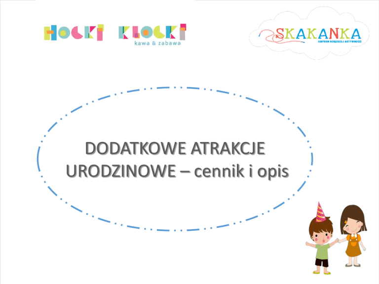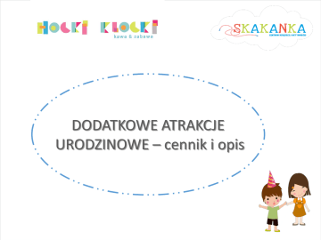 DODATKOWE ATRAKCJE URODZINOWE – cennik i opis URODZINY TEMATYCZNE - 150 zł za całą grupę Zabawa z animatorami, którzy zaproponują mieszankę wielu różnych zabaw ruchowych, plastycznych i logicznych w oparciu o wybrany wcześniej motyw np. olimpiada sportowa, piraci, małe zoo, kinderbalet, gwiezdne wojny i wiele, wiele innych, także tych zaproponowanych przez Państwa. URODZINY EDUKACYJNE - 150 zł za całą grupę Urodziny edukacyjne to odpowiedź na szerokie zainteresowania naszych jubilatów oraz coraz większe wymagania rodziców. Specjalnie dla tych, którzy oczekują czegoś więcej od zabawy urodzinowej proponujemy kilka scenariuszy tematycznych. DODATKOWE ATRAKCJE - 50 – 700 zł za całą grupę Polecamy sprawdzone przez nas oferty wielu artystów, naukowców i animatorów, a w śród nich: teatr baniek mydlanych, zabawy z gadami, warsztaty archeologiczne, zabawa z rozbijaniem piniaty, balonowe show czy warsztaty z klockami LEGO. URODZINOWY TELEDYSK - 900 zł za całą grupę SESJA ZDJĘCIOWA - 400 zł za całą grupę Jesteśmy otwarci na wszelkie pomysły i propozycje rodziców. Nasi animatorzy mogą stworzyć nowe scenariusze zabaw zgodnych z tematem zainteresowań dzieci. URODZINY TEMATYCZNE Zdobywcy kosmosu Zabawa w kosmicznym klimacie, ciekawostki o kosmosie i gwiazdach, kreatywne bazgroły w których główną rolę odgrywają dziecięce marzenia (nie tylko te o lotach na księżyc). Piraci Urodziny pirackie to gratka nie tylko dla fascynatów „Piratów z Karaibów”, to świetna zabawa dla wszystkich, którzy lubią poszukiwać skarbów lub rozszyfrowywać listy z butelki. Łamigłówki i zagadki logiczne, gry i zabawy zręcznościowe. Rycerze i Księżniczki To zabawa w konwencji starodawnych zwyczajów, dowiemy się jakie sprawności musi posiadać prawdziwy rycerz, i jak wyglądały księżniczki, nie tylko te z dzisiejszych bajek. A wszystko to po odnalezieniu starej księgi. Kubuś i przyjaciele To zabawa dla najmłodszych jubilatów i fanów najsympatyczniejszego misia na świecie, czyli Kubusia Puchatka. Podczas urodzin motywem przewodnim będzie on sam oraz jego przyjaciele. Olimpiada Sportowa Dla wszystkich, którzy nie lubią siedzieć w jednym miejscu proponujemy prawdziwy maraton rozmaitych konkurencji sportowych: chodzenie na szczudłach, skoki w workach, pokonywanie przeszkód i wiele innych. Małe zoo Jak odróżnić ślady lisa od kota, oraz jak rozpoznać dźwięki lasu i łąki. To temat na urodziny dla najmłodszych z najmłodszych jubilatów. Mała Miss To urodziny przygotowane specjalnie z myślą o najmłodszych kobietach – szalone fryzury, makijaże, owocowe maseczki czy tor przeszkód na obcasach. Mali Agenci To gratka dla miłośników rozszyfrowywania zagadek oraz odkrywania tajemnic. Urodziny odbywają się w formie szkolenia dla małych agentów, a więc zdobywamy umiejętności, jakimi powinien posługiwać się prawdziwy detektyw. Stadion urodzinowy Aby powstał stadion urodzinowy mali kibice muszą przygotować swoje własne flagi, gwizdki lub szaliki. Tak gotowi do meczu możemy rozegrać urodzinowy turniej piłki nożnej. Na kibiców czeka również sprawdzian z piłkarskiej wiedzy. Akcja Integracja To zabawa dla nowo zapoznanej grupy, w której królują zadania przełamujące lody, budujące i integrujące grupę w naturalny sposób. Nasz przepis jest prosty: odrobina rywalizacji, wspólny cel i dobra zabawa. Najdzikszy Dziki Zachód Kowboje i pościgi w klimacie Dzikiego Zachodu. Dużo zabaw ruchowych oraz zręcznościowych. Emocje gwarantowane! Komandosi na wojskowym szkoleniu Urodziny w konwencji prawdziwego szkolenia. Aby zasłużyć na odznakę trzeba sprostać nie jednemu zadaniu. Lego Ninjago W trakcie tej zabawy spróbujemy wcielić się w rolę dzielnych Wojowników Ninja. Przed dzieciakami do wykonania wiele zadań i podróży po Jaskini Rozpaczy, Zamarzniętym Pustkowiu, czy Świątyni Ognia. W każdym miejscu czeka inne zadanie, czy uda nam się zaskoczyć uczestników? Kto zostanie Złotym Ninja? Czy uda im się odnaleźć skarb i pokonać groźnego smoka? Scooby Doo i zamek strachów Razem z bohaterami bajek Scooby Doo będziemy szukać Widma Nocy. Musimy odnaleźć jego kryjówkę, w której znajduje się skarb, a po drodze rozwiązać nie jedną zagadkę. Zabawa w Scooby Doo to prawdziwa gratka dla fanów zagadek i tajemnic. W krainie lodu Razem z Anną – bohaterką disneyowskiej animacji wyruszamy w podróż pełną przygód i wyzwań. W tej zabawie królują zimowe dyscypliny: bitwa na śnieżki, skoki na lodowych krach, ozdabianie zimowych śnieżek. Animatorzy przygotowują specjalne zadania, aby jak najszybciej pozbyć się pogodowych anomalii wywołanych przez Elsę. Poszukiwacze skarbów To idealna zabawa dla dzieciaków które uwielbiają trochę pogłówkować i kombinować. Animatorzy przygotują specjalne zadania, do których rozwiązania przyda się z pewnością mapa i dobre pomysły! Poszukiwacze skarbów to zabawa, która sprawdza się najlepiej w plenerze. W Nibylandii Zapraszamy na wyprawę w nieznane! Naszym przewodnikiem będzie sam Piotruś Pan. Czy nauczymy się latać? Czy uda nam się uratować Dzwoneczka z rąk wrogów? Zrobimy własny Magiczny Pyłek i razem z Zagubionymi Chłopcami przeżyjemy niezapomniane chwile. Kinderbalet To szalone i roztańczone urodziny w rytmie największych hitów. Podczas zabawy nauczymy się nowych kroków tanecznych oraz zorganizujemy taneczny quiz! Jak to na prawdziwe przyjęcie przystało zadbamy o maski i specjalne gadżety. Ta zabawa sprawdza się nie tylko w karnawale! Gwiezdne Wojny Ta kultowa trylogia z pewnością zasługuje na wyjątkową zabawę. Wszystkich fanów świetlnych mieczy zapraszamy na specjalnie przez nas przygotowane szkolenie Jedi. Każdy uczestnik przejdzie test sprawności, spostrzegawczości i odwagi, aby na końcu złożyć oficjalną przysięgę Jedi. URODZINY EDUKACYJNE Raz na ludowo! To zabawa w folkowym klimacie. Uc