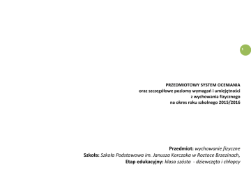 1 PRZEDMIOTOWY SYSTEM OCENIANIA oraz szczegółowe poziomy wymagań i umiejętności z wychowania fizycznego na okres roku szkolnego 2015/2016 Przedmiot: wychowanie fizyczne Szkoła: Szkoła Podstawowa im. Janusza Korczaka w Roztoce Brzezinach, Etap edukacyjny: klasa szósta - dziewczęta i chłopcy Podstawy prawne: 1. Rozporządzenie MEN z dn. 07 IX 2004 r. w sprawie zasad oceniania, klasyfikowania i promowania uczniów i słuchaczy oraz przeprowadzania egzaminów i sprawdzianów w szkołach publicznych. 2. Wewnątrzszkolny System Oceniania. 3. Autorski program wychowania fizycznego dla klas VI szkoły podstawowej, zatwierdzony przez MINISTERSTWO EDUKACJI NARODOWEJ : DKW – 4014 – 68/99 oraz umieszczony w szkolnym wykazie programów nauczania pod nr : SPRB -20-09/10 2 Autor: Alicja Romanowska – Autorski program nauczania wychowania fizycznego dla klas IV-VI. Wydawnictwo: Korepetytor Płock 1999 Nauczyciel realizujący: Marek Nowakowski CELE PRZEDMIOTOWEGO SYSTEMU OCENIANIA 1. Dostarczanie zainteresowanym ( uczniom, jego rodzicom lub opiekunom, dyrekcji szkoły) wszechstronnej i rzeczowej informacji o postępach, osiągnięciach, brakach i uzdolnieniach ucznia w zakresie nauki wychowania fizycznego. 2. Wspieranie ucznia w jego dążeniu do osiągnięcia wszechstronnego rozwoju fizycznego i pozytywnej postawy wobec aktywności ruchowej, określonych w treściach kształcenia i wychowania fizycznego. 3. Pomoc uczniowi w samodzielnym planowaniu swego rozwoju. 4. Przekazywanie podstawowych wiadomości i umiejętności umożliwiających samokontrolę, samoocenę i samodzielne podejmowanie działań służących udoskonaleniu wszystkich funkcji organizmu. 5. Motywowanie ucznia do dalszej pracy w zakresie doskonalenia sprawności fizycznej. 6. Informowanie nauczyciela o trafności doboru metod i sposobów nauczania i oceniania. WYMAGANIA EDUKACYJNE I SPOSOBY SPRAWDZANIA OSIĄGNIĘĆ EDUKACYJNYCH Z WYCHOWANIA FIZYCZNEGO w Szkole Podstawowej im. Janusza Korczaka w Roztoce Brzezinach. I. Kryteria oceniania zostały oparte na określeniu komponentów składających się na ocenę semestralną i końcowo - roczną. - Stopień opanowania wymagań podstawowych i ponadpodstawowych w zakresie: sprawności motorycznej, poziomu umiejętności ruchowych i poziomu wiadomości na lekcji wychowania fizycznego. - Uczestnictwa w zajęciach obowiązkowych. Frekwencja, - Przygotowania do zajęć, - Postawa ucznia i stosunek do wychowania fizycznego w klasach IV-VI - Społecznego zaangażowania w krzewieniu kultury fizycznej, - Udziału w zajęciach nadobowiązkowych, zawodach sportowych. 1. Sprawność motoryczna, umiejętności ruchowe i wiadomości Poziom sprawności motorycznej (siła, szybkość, zwinność, wytrzymałość) określamy na podstawie wyników uzyskanych w wybranych testach. 1. Test sprawności fizycznej Zuchory (narzędzie sprawdzania) jest do wglądu u nauczyciela wychowania fizycznego (uzyskany wynik przekłada się na określoną ocenę). - Ocenę sprawności motorycznej nauczyciel przeprowadza bez wcześniejszej zapowiedzi. - W drugim semestrze nauki nauczyciel winien wziąć pod uwagę w szczególności stan sprawności motorycznej ucznia w stosunku do stanu wyjściowego uzyskanego w pierwszym semestrze, tj. za poprawę osiągniętego wyniku należy podwyższyć uzyskaną ocenę o pół stopnia, a w przypadku dużej poprawy wyniku o cały jeden stopień. 3 - Forma sprawdzianu - działania praktyczne właściwe dla danego testu sprawności fizycznej. Poziom umiejętności ruchowych ucznia oceniamy z tych działów, które były przedmiotem nauczania w danym semestrze (np. gimnastyka, gry zespołowe, lekka atletyka itp.) oraz umiejętności zdobytych na zajęciach fakultatywnych w klasach VI. Tematyka zajęć znajduje się w załączonym planie wynikowym. Kryteria i narzędzia sprawdzania umiejętności ruchowych: 6. Celująca Uczeń wykonał bezbłędnie ćwiczenie w szybkim tempie, które objęte są program nauczania w danej klasie. 5. Bardzo dobra Uczeń wykonał ćwiczenie bezbłędnie w dobrym tempie. 4. Dobra Uczeń wykonał ćwiczenie z małymi błędami w dobrym tempie - błędy jednak w wyraźny sposób nie wpłynęły na poprawność demonstrowanej ewolucji ruchowej lub wykonał ćwiczenie poprawnie, lecz w nienaturalnym tempie. 3. Dostateczna Uczeń wykonał ćwiczenie z wyraźnymi błędami w dobrym tempie – błędy zakłóciły poprawność demonstrowanej ewolucji ruchowej lub wykonał ćwiczenie z małymi błędami, lecz w nienaturalnym tempie. 2. Dopuszczająca Uczeń wykonał ćwiczenie w sposób niedbały, z dużymi błędami w nienaturalnym tempie. 1. Niedostateczna Uczeń bez podania przyczyny odmówił wykonania ćwiczenia lub w dniu sprawdzianu nie jest właściwie przygotowany (bez uzasadnienia) do zajęć. Forma sprawdzianu - działania praktyczne (wykonanie określonego ćwiczenia, ewolucji, elementu technicznego). Poziom wiadomości z zakresu szeroko pojętej kultury fizycznej powinna być ściśle związana z tym, co nauczyciel przekazał uczniom w czasie jednostki lekcyjnej. Powinny to być informacje krótkie i łatwo przyswajalne. Szczegółowa tematyka znajduje się w załączonym planie wynikowym. Forma sprawdzianu poziomu wiadomości - jest dowolna - ustna lub pisemna. Kryteria i narzędzia sprawdzania wiadomości – ilość zdobytych punktów przez ucznia zgodna ze skalą WSO pkt.10 2. Przygotowanie do zajęć. Przez przygotowanie do zajęć lekcji wychowania fizycznego w klasach IV- VI rozumie się posiadanie przez ucznia czystego, odpowiedniego stroju sportowego. Należy zwrócić szczególną uwagę na higienę i właściwe przeznaczenie stroju (tylko do ćwiczeń fizycznych) – biała koszulka TShirt, spodenki krótkie lub długie, skarpetki, obuwie sportowe zmienne. Za każdy przypadek braku stroju, bądź braku odpowiedniego obuwia lub niewłaściwej higieny stroju, nauczyciel stawia po jednym minusie. 4 Trzy minusy - ocena niedostateczna. W o