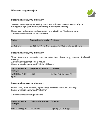Warstwa wegetacyjna Substrat ekstensywny mineralny Substrat ekstensywny mineralny umożliwia roślinom prawidłowy rozwój, w szczególnych przypadkach spełnia rolę warstwy dociskowej. Skład: skały mineralne o odpowiedniej granulacji, torf i mielona kora. Zastosowano substrat XF 200 xero terr Ciężar Gromadzenie wody Dostawa do 1,6 t/m3 od 15l do 19l na 1m2 big bag 1m3 lub worki po 50 litrów Substrat ekstensywny mineralny Skład: keramzyty, porowate kruszywo mineralne, piasek ostry, kompost, torf niski, nawozy. Zastosowano substrat TYP E v01_11 Ciężar w stanie suchym od 900 do 1000kg/m3 Ciężar w stanie mokrym Pojemność wodna Dostawa od 1300 do 1400 kg/m3 ≥35% big bag 1,2 m3 waga 1t Substrat ekstensywny mineralny Skład: lawa, bims-pumeks, łupek ilasty, kompost około 20%, nawozy. Ciężar w stanie suchym od 960kg/m3 Zastosowano substrat gala*LBB/E Ciężar w stanie mokrym Pojemność wodna Dostawa Max. 1200 kg/m3 około 40% big bag 1,5 m3 waga 1t Grubość warstwy wegetacyjnej substratu Grubość warstwy wegetacyjnej w cm 4 6 8 10 12 15 18 20 Rodzaj Ekstensywne Mech-rozchodnik** zazielenienia zazielenienie Rozchodnik-mech-zioła** Rozchodnik-zioła-trawa* Trawa-zioła* **grubość substratu dla mat wegetacyjnych powinna wynosić od 4 do 10 cm Substrat intensywny mineralny Skład: keramzyty, porowate kruszywo mineralne, piasek ostry, kompost, torf niski, nawóz. Ciężar w stanie suchym 700-800 kg/m3 Zastosowano SUBSTRAT I-Intensywne Ciężar w stanie mokrym Pojemność wodnaDostawa od 1100 do 1200 kg/m3 ≥55% big bagi 1,5 m3 (waga 1,2t) Grubość warstwy wegetacyjnej substratu Zależy od zaprojektowanej formy zieleni intensywnej Grubość warstwy wegetacyjnej w cm Rodzaj zazielenienia Intensywne zazielenienie Duże krzaki i małe drzewa Średnie i wysokie drzewa Wysokie drzewa 60 70 80 90 100 125 150 200 Grubość warstwy wegetacyjnej substratu Zależy od zaprojektowanej formy zieleni intensywnej Grubość warstwy wegetacyjnej w cm Rodzaj Intensywne Sedum-rozchodniki zazielenienia zazielenienie Trawy zioła Średnio wysokie wieloletnie zagajniki Wysokie wieloletnie krzaki 15 18 20 25 30 35 40 45 50 60 70