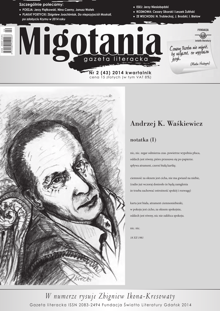 Szczególnie polecamy: ● POEZJA: Jerzy Piątkowski, Nina Czerny, Janusz Wałek ● PLAKAT POETYCKI: Zbigniew Joachimiak, Do nieprzyjaciół Moskali, po zdobyciu Krymu w 2014 roku ● ESEJ: Jerzy Niesiobędzki ● ROZMOWA: Cezary Sikorski i Leszek Żuliński ● ZE WSCHODU: N. Trubieckoj, J. Brodski, I. Biełow Czasem trzebaconiwe ygmówłaszića, by usłyszeć, język. (Martin Heidegger) N r 2 ( 43) 2014 kw art al ni k cena 15 złotych ( w tym VAT 8 %) Andrzej K. Waśkiewicz notatka (I) nic, nic. zegar odmierza czas. powietrze wypełnia płuca, oddech jest równy, pióro przesuwa się po papierze. spływa atrament, czerni białą kartkę. ciemność za oknem jest cicha, nie ma gwiazd na niebie, (radio już wczoraj doniosło że będą zamglenia że trzeba zachować ostrożność spokój i rozwagę) karta jest biała, atrament ciemnoniebieski, w pokoju jest cicho, za oknem spokojnie, oddech jest równy, nic nie zakłóca spokoju. nic. nic. 18 XII 1981 W numerze rysuje Zbigniew Ikona-Kresowaty Gazeta literacka ISSN 2083-2494 Fundacja Światło Literatury Gdańsk 2014 FELIETON M oja przyjaciółka czyta Kwiaty polskie Juliana Tuwima zamiast śledzić politykę rosyjską i najnowsze polskie opcje obrony przeciwrakietowej. Ma świętą rację. Na rozmowy o polityce byłby czas podczas dłuuugiej jazdy gdzieś aż nad koreańską granicę (obecnie Rosja jak wiadomo, graniczy z kim chce) – w skromnym podręcznym tobołku zaś trudno upchnąć poezję, chyba że ponowocześni sybiracy liczą na dostęp do Google’a. Sybiracy? Dlaczego? Ponieważ jesteśmy narodem bohaterów i wszyscy byliśmy internowani w stanie wojennym. Ba, nad rubieżą północnokoreańską Federacji mogą się w Internecie pojawiać zakłócenia, i to wcale nie z winy szalonych Kimów. Spójrzmy na mapę. Tutaj właśnie Chiny zostały odepchnięte od Morza Japońskiego, nie mają nawet czegoś w rodzaju naszego Korytarza Gdańskiego. Od morza odgradza je cieniutki pas Nadmorskiego Kraju, tu są ujścia Amuru i Ussuri, i porty Władywostok i Nachodka, a także mniejsze, zaledwie rybacko-promowe jak Zarubino nad Zatoką Piotra Wielkiego. Otóż Chiny w roku 1966 próbowały sobie wywalczyć dostęp do Oceanu Spokojnego na północny wschód od Korei, atakowały radzieckie posterunki pograniczne, miały miażdżącą przewagę liczebną (na spornej wysepce Damanskij, gdzie stacjonowało mniej niż stu żołnierzy, pięciotysięczny oddział odparły dopiero (aż trzy!) czołgi T-62. W związku z militarnym zacofaniem Chin w najweselszym bloku radzieckiego imperium opowiadano kawał: Mao staje do walnej bitwy z Moskwą, która zdradziła idee Stalina. Ostatnia wymiana zdań z adiutantem: Towarzyszu Mao, na prawym skrzydle mamy dwieście milionów piechoty. Na lewym skrzydle trzysta milionów. – A co w środku – pyta ukochany wódz. – Czołgi! – Obydwa? Czasy się zmieniły i wiek dwudziesty wspominają ludzie z łezką i u nas, i w rosyjskiej głubince, i zapewne w nieodległym od granicy chińskim Kyanghun. Armia Państwa Środka od lat zbroi się po zęby a można być pewnym, że jej sztaby robią sobie komputerowe symulacje tego, jak wykorzystać dwa urocze precedensy, Kosowo mianowicie i Krym, jako prawną podstawę swoich działań. Symulacje wojny postmodernistycznej. Silniejszy anektuje upatrzone terytorium. Dowolne terytorium. Oczywiście, niezbyt to pociesza rdzennych Krymian, potomków kultury, jakiej zawdzięczamy papierowy pieniądz, kumys, polskich muzułmanów (w tym cudowne drewniane meczety) i tolerancję religijną. Niezbyt pociesza także Swobodę, oligarchów bojących się wylądować w łagrze u Putina (nawet tylko w piwnicy u separatystów), a nawet Polaków. Nas o tyle słabo pociesza, że będąc w NATO pozostajemy lojalnym sojusznikiem USA, tymczasem prezydent Obama uważa Europę za mało istotną dla geostrategii amerykańskiej. Jego interesuje właśnie Azja i wątpię, aby zachwyciła go ekspansja Chin kosztem Rosji. Polsko-chińska granica na Uralu granicą pokoju, to coś, co w Waszyngtonie brzmi mało dowcipnie. Naprawdę. Obama śmiał się na pogrzebie Nelsona Mandeli, ale cokolwiek by mówić o iluzoryczności granic państwowych na tym świecie, nienaruszalne pozostały granice śmieszności. Zostalibyśmy karnym, zwartym i gotowym sojusznikiem prezydenta Federacji. Morze, nasze morze, będziem ciebie wiernie strzec! Nasi wspaniali dziennikarze ze Szkła Kontaktowego komentowaliby, nie kryjąc patriotyzmu, przebieg zdarzeń. Lektura Tuwima nad ustronną rzeką Ussuri może być więc zakłócana, gdyby pobyt tam zajął więcej czasu, a swojski język rosyjski – niewykluczone – zamieniono nam na mandaryński. Marek Wawrzkiewicz N iewielki formatem i cieniutki tomik wierszy wydany przez PIW w 1967 roku: Krzysztof Gąsiorowski – Tonące morze. Na stronie tytułowej dedykacja napisana niebieskim atramentem: Marku, drogi, przyjmij te kilka czółen na tonącym morzu jako wyraz najgłębszej przyjaźni i jako podziękowanie za twoją książkę. Krzysztof. W-wa, 31 styczeń 1968. Jaką swoją książkę wtedy mu podarowałem? Nie pamiętam, ale to nieważne. Z Krzysztofem poznałem się dziesięć lat wcześniej, nasza przyjaźń trwała przeszło pół wieku. Nazbierało się przeżyć i wspomnień. Byłem świadkiem na jego pierwszym rozwodzie i drugim ślubie, przeszliśmy od baru do baru cała Marszałkowską w oczekiwaniu na narodziny jego córki Natalii, Gąsior był świadkiem na moim drugim ślubie, przemawiał nad grobem mojej żony, której z wzajemnością nie lubił. Przeszło pięćdziesiąt lat mówił, a ja słuchałem. Ostatnie trzy lata on słuchał (był po amputacji krtanią), a ja musiałem mówić. Nie mogłem się do tego przyzwyczaić. Tak jak do tego, że go już nie ma. Są wspomnienia. Gdzieś tak w połowie lat siedemdziesiątych wezwano mnie do Najwyższego Urzędu i zarzucono, że zbyt często bywam w Macedonii. Ta jugosłowiańska republika pozos