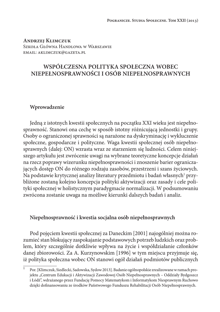 Studia Społeczne. Współczesna polityka społecznaPogranicze. wobec niepełnosprawności i osób…Tom XXII (2013) 185 Andrzej Klimczuk Szkoła Główna Handlowa w Warszawie email: [email protected] WSPÓŁCZESNA POLITYKA SPOŁECZNA WOBEC NIEPEŁNOSPRAWNOŚCI I OSÓB NIEPEŁNOSPRAWNYCH Wprowadzenie Jedną z istotnych kwestii społecznych na początku XXI wieku jest niepełnosprawność. Stanowi ona cechę w sposób istotny różnicującą jednostki i grupy. Osoby o ograniczonej sprawności są narażone na dyskryminację i wykluczenie społeczne, gospodarcze i polityczne. Waga kwestii społecznej osób niepełnosprawnych (dalej: ON) wzrasta wraz ze starzeniem się ludności. Celem niniejszego artykułu jest zwrócenie uwagi na wybrane teoretyczne koncepcje działań na rzecz poprawy wizerunku niepełnosprawności i znoszenie barier ograniczających dostęp ON do różnego rodzaju zasobów, przestrzeni i szans życiowych. Na podstawie krytycznej analizy literatury przedmiotu i badań własnych1 przybliżone zostaną kolejno koncepcja polityki aktywizacji oraz zasady i cele polityki społecznej w holistycznym paradygmacie normalizacji. W podsumowaniu zwrócona zostanie uwaga na możliwe kierunki dalszych badań i analiz. Niepełnosprawność i kwestia socjalna osób niepełnosprawnych Pod pojęciem kwestii społecznej za Daneckim [2001] najogólniej można rozumieć stan blokujący zaspokajanie podstawowych potrzeb ludzkich oraz problem, który szczególnie dotkliwie wpływa na życie i współdziałanie członków danej zbiorowości. Za A. Kurzynowskim [1996] w tym miejscu przyjmuje się, iż polityka społeczna wobec ON stanowi ogół działań podmiotów publicznych 1 Por. [Klimczuk, Siedlecki, Sadowska, Sydow 2013]. Badanie ogólnopolskie zrealizowane w ramach projektu „Centrum Edukacji i Aktywizacji Zawodowej Osób Niepełnosprawnych – Oddziały Bydgoszcz i Łódź”, wdrażanego przez Fundację Pomocy Matematykom i Informatykom Niesprawnym Ruchowo dzięki dofinansowaniu ze środków Państwowego Funduszu Rehabilitacji Osób Niepełnosprawnych. 186 Andrzej Klimczuk i pozarządowych, które mają na celu wyrównywanie nieuzasadnionych różnic socjalnych, asekurowanie wobec ryzyk życiowych, jak również tworzenie szans do ich funkcjonowania we wszystkich dziedzinach życia społecznego i gospodarczego w sposób umożliwiający pełną integrację ze społeczeństwem. Poprzez niepełnosprawność (ang. disability), najogólniej za Światową Organizacją Zdrowia, rozumie się każde ograniczenie bądź niemożność prowadzenia aktywnego życia w sposób lub w zakresie uznawanym za typowe dla człowieka, przy czym stan ten jest poprzedzony przez niesprawność, uszkodzenie (ang. impariment), [UNIC 2007]. Pod tym pojęciem rozumie się natomiast każdą utratę sprawności lub nieprawidłowość w budowie czy funkcjonowaniu organizmu pod względem psychologicznym, psychofizycznym lub anatomicznym w wyniku określonej wady wrodzonej, choroby lub urazu. Niepełnosprawność prowadzi do ograniczenia w pełnieniu ról społecznych (ang. handicap), czyli mniej uprzywilejowanej lub mniej korzystnej sytuacji danej osoby wynikającej z niesprawności lub niepełnosprawności, która ogranicza lub uniemożliwia pełną realizację roli społecznej odpowiadającej jej wiekowi, płci oraz zgodnej z uwarunkowaniami społecznymi i kulturowymi. Kategorię społeczną osób niepełnosprawnych za Konwencją Organizacji Narodów Zjednoczonych (ONZ) z 2006 roku, która została ratyfikowana przez Polskę w 2012 roku, rozumie się zaś jako obejmującą osoby o długotrwale naruszonej sprawności fizycznej, umysłowej, intelektualnej lub sensorycznej, przy czym stan ten w oddziaływaniu z różnymi barierami, może utrudniać im pełne i skuteczne uczestnictwo w życiu społecznym, na równych zasadach z innymi ludźmi. W artykule przyjmuje się szeroką definicję ON bez różnicowania grup, gdyż etap ten ma miejsce dopiero przy opracowywaniu polityk szczegółowych podporządkowanych ogólnym zasadom i celom polityki społecznej na rzecz obywateli z ograniczeniem sprawności [Woźniak 2008]. W Narodowym Spisie Powszechnym Ludności i Mieszkań z 2011 roku wyróżniono dwa kryteria podziału ON: prawne (obiektywne) – odnoszące się do osób posiadających aktualne orzeczenie o niepełnosprawności wydane przez organ do tego uprawniony oraz biologicznie (subiektywne) – obejmuje osoby niedysponujące orzeczeniami, lecz odczuwające całkowicie lub poważnie ograniczoną zdolność do wykonywania czynności podstawowych stosownie do swojego wieku [GUS 2012: 63]. Zgodnie z tym spisem w Polsce żyje 4,69 mln ON, czyli stanowią 12,2% wszystkich zameldowanych mieszkańców kraju. Osoby niepełnosprawne prawne stanowią 3,13 mln, a biologicznie 1,57 mln. Kobiety stanowią tu 2,53 mln osób (53,9%) wobec 2,167 mln mężczyzn (46,1%). Większość z tych osób żyje w miastach (64%), co odpowiada stanowi populacji generalnej (61%). Jednocześnie liczba ON prawnie zmniejszyła się względem spisu z 2002 roku Współczesna polityka społeczna wobec niepełnosprawności i osób… 187 o 1,3 mln poprzez zmiany prawne i zaostrzenie kryteriów przyznawania rent z tytułu niezdolności do pracy. Prognozuje się wzrost liczebności zbiorowości ON głównie z uwagi na proces starzenia się ludności. W prognozie demograficznej na lata 2008-2035 [GUS 2009: 204, 219] oczekuje się wzrostu liczby osób w wieku 65+ w analizowanym okresie z 5,1 mln (13,5% ogółu ludności) do 8,3 (23,2%). Należy przy tym zauważyć, iż według danych ONZ kluczowym problemem ON jest bezrobocie [UN 2013]. W krajach rozwijających się od 80% do 90% ON w wieku produkcyjnym nie ma zatrudnienia, a w krajach rozwiniętych ta sama wartość wynosi od 50% do 70%. Z badań Eurostatu [2002], (dane z edycji 2011 znajdują się jeszcze w opracowaniu) wynika, że problem bezrobocia ON jest też kluczowy w krajach Unii Europejskiej. W kra