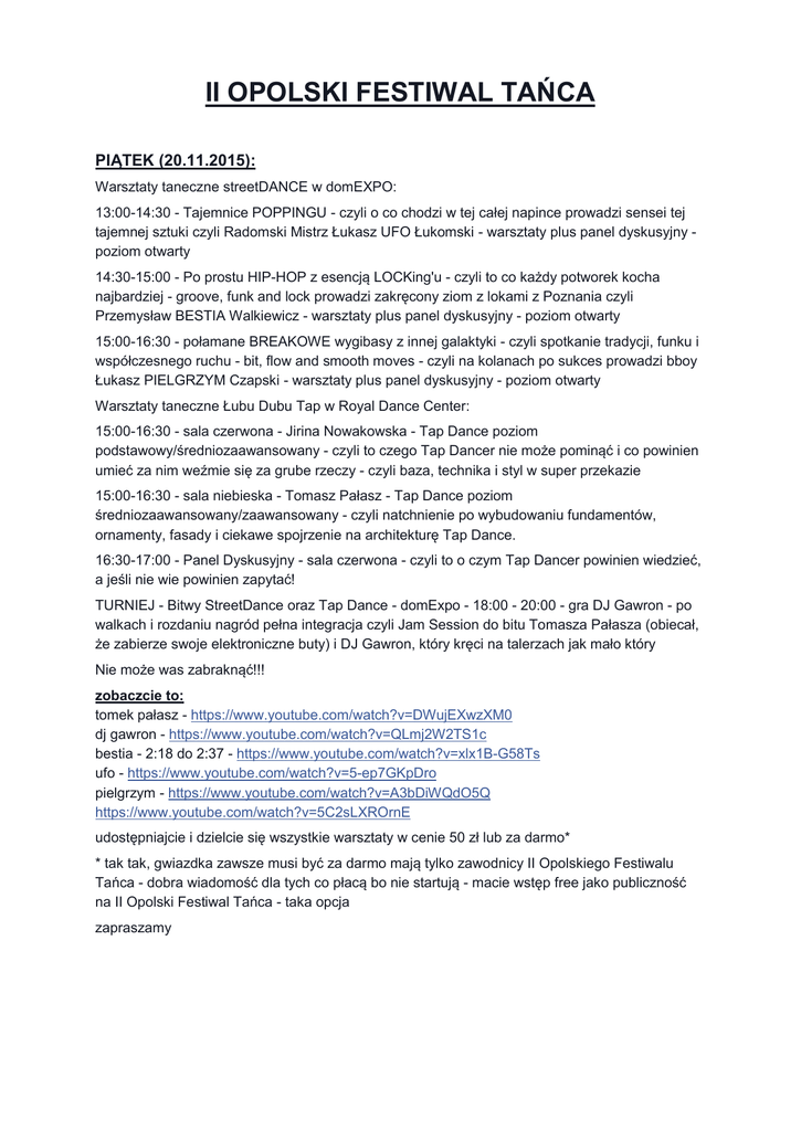 II OPOLSKI FESTIWAL TAŃCA PIĄTEK (20.11.2015): Warsztaty taneczne streetDANCE w domEXPO: 13:00-14:30 - Tajemnice POPPINGU - czyli o co chodzi w tej całej napince prowadzi sensei tej tajemnej sztuki czyli Radomski Mistrz Łukasz UFO Łukomski - warsztaty plus panel dyskusyjny poziom otwarty 14:30-15:00 - Po prostu HIP-HOP z esencją LOCKing'u - czyli to co każdy potworek kocha najbardziej - groove, funk and lock prowadzi zakręcony ziom z lokami z Poznania czyli Przemysław BESTIA Walkiewicz - warsztaty plus panel dyskusyjny - poziom otwarty 15:00-16:30 - połamane BREAKOWE wygibasy z innej galaktyki - czyli spotkanie tradycji, funku i współczesnego ruchu - bit, flow and smooth moves - czyli na kolanach po sukces prowadzi bboy Łukasz PIELGRZYM Czapski - warsztaty plus panel dyskusyjny - poziom otwarty Warsztaty taneczne Łubu Dubu Tap w Royal Dance Center: 15:00-16:30 - sala czerwona - Jirina Nowakowska - Tap Dance poziom podstawowy/średniozaawansowany - czyli to czego Tap Dancer nie może pominąć i co powinien umieć za nim weźmie się za grube rzeczy - czyli baza, technika i styl w super przekazie 15:00-16:30 - sala niebieska - Tomasz Pałasz - Tap Dance poziom średniozaawansowany/zaawansowany - czyli natchnienie po wybudowaniu fundamentów, ornamenty, fasady i ciekawe spojrzenie na architekturę Tap Dance. 16:30-17:00 - Panel Dyskusyjny - sala czerwona - czyli to o czym Tap Dancer powinien wiedzieć, a jeśli nie wie powinien zapytać! TURNIEJ - Bitwy StreetDance oraz Tap Dance - domExpo - 18:00 - 20:00 - gra DJ Gawron - po walkach i rozdaniu nagród pełna integracja czyli Jam Session do bitu Tomasza Pałasza (obiecał, że zabierze swoje elektroniczne buty) i DJ Gawron, który kręci na talerzach jak mało który Nie może was zabraknąć!!! zobaczcie to: tomek pałasz - https://www.youtube.com/watch?v=DWujEXwzXM0 dj gawron - https://www.youtube.com/watch?v=QLmj2W2TS1c bestia - 2:18 do 2:37 - https://www.youtube.com/watch?v=xlx1B-G58Ts ufo - https://www.youtube.com/watch?v=5-ep7GKpDro pielgrzym - https://www.youtube.com/watch?v=A3bDiWQdO5Q https://www.youtube.com/watch?v=5C2sLXROrnE udostępniajcie i dzielcie się wszystkie warsztaty w cenie 50 zł lub za darmo* * tak tak, gwiazdka zawsze musi być za darmo mają tylko zawodnicy II Opolskiego Festiwalu Tańca - dobra wiadomość dla tych co płacą bo nie startują - macie wstęp free jako publiczność na II Opolski Festiwal Tańca - taka opcja zapraszamy SOBOTA (21.11.2015): - 7:00 - 8:30 - Rejestracja zawodników w biurze II Opolskiego Festiwalu Tańca (wydanie opasek i numerów startowych) - domEXPO Opole ul. Kępska 8 WARSZTATY TANECZNE w domEXPO: główny parkiet: 9:00-10:15 - DISCO DANCE dla młodzieży i dorosłych - prowadzi Pan Leszek Cichocki 10:15-11:00 - PANEL DYSKUSYJNY - zapytaj trenera, sędziego swego dlaczego? 11:15-12:30 - DISCO DANCE dla dzieci - prowadzi Pan Leszek Cichocki Jak wygląda praca z Leszkiem LC Cichockim sprawdź: https://youtu.be/k9imEzVeHo8 sala boczna: 9:00-10:15 - SALSA FOOTWORK SOLO - prowadzi (niespodzianka czekamy na potwierdzenie) 10:15-11:00 - PANEL DYSKUSYJNY - zapytaj trenera, sędziego swego dlaczego? 11:15-12:30 - SALSA PARTNERWORK - prowadzi (niespodzianka czekamy na potwierdzenie) OTWARTY TURNIEJ LIGOWY PFT w domEXPO: 13:30 - Start turnieju w kategoriach: Jazz solo i duety, Hip-Hop małe grupy i formacje, Disco Dance solo i duety, Tańce Par solo i duety, Tap Dance, Inne Formy, Tap Dance Open Groups, OPEN SALSA BATTLE 18:30 - 20:00 - Gala Finałowa oraz Pokaz TAP DANCE Tomasz Pałasz Warsztaty taneczne w cenie 50 zł osoba lub za darmo* ... o promocjach, pakietach i rabatach już wkrótce napiszemy * bezpłatne warsztaty tylko dla zarejestrowanych zawodników-prosimy przedstawicieli klubów, zespołów i szkół tańca o odbieranie opasek zawodników przed warsztatami. NIEDZIELA (22.11.2015): - 7:00 - 8:30 - Rejestracja zawodników w biurze II Opolskiego Festiwalu Tańca (wydanie opasek i numerów startowych) - domEXPO Opole ul. Kępska 8 WARSZTATY TANECZNE w domEXPO: główny parkiet: 9:00-10:15 - AFRO JAZZ dla dzieci - prowadzi Anna Wielogórska 10:15-11:00 - PANEL DYSKUSYJNY - zapytaj trenera, sędziego swego dlaczego? - Panel contemporary prowadzony przez Annę Wielogórską i Łukasza Czapskiego 11:00-12:30 - JAZZ DANCE dla Młodzieży - prowadzi Anna Wielogórska sprawdźcie sami jak wyglądają warsztaty z Panią Anną Wielogórską, co sama mówi o swoich zajęciach i dlaczego warto być na jej warsztatach:https://youtu.be/KWmVZFPgEmY sala boczna: 9:00-10:15 - MODERN CONTEMPORARY dla młodzieży i dorosłych - prowadzi Łukasz Czapski PANEL DYSKUSYJNY -> na głównym parkiecie 11:00-12:30 - MODERN CONTEMPORARY dla dzieci - prowadzi Łukasz Czapski zobacz jak tańczy PIELGRZYM: https://youtu.be/wahtfsKCrmA OTWARTY TURNIEJ LIGOWY PFT w domEXPO: 13:30 - Start turnieju w kategoriach: Modern Solo i Duety, Disco Dance małe grupy i formacje, Modern małe grupy i formacje, Hip-Hop solo i duety, Jazz Dance małe grupy i formacje, Latin Show małe grupy, formacje, solo i duety, OPEN JAZZ BATTLE 18:30 - 20:00 - Gala Finałowa Warsztaty taneczne w cenie 50 zł osoba lub za darmo* ... o promocjach, pakietach i rabatach już wkrótce napiszemy Emotikon smile * bezpłatne warsztaty tylko dla zarejestrowanych zawodników-prosimy przedstawicieli klubów, zespołów i szkół tańca o odbieranie opasek zawodników przed warsztatami.