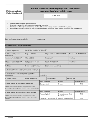ZŽĐnjŶĞƐƉƌĂǁŽnjĚĂŶŝĞŵĞƌLJƚŽƌLJĐnjŶĞnjĚnjŝĂųĂůŶŽƑĐŝ ŽƌŐĂŶŝnjĂĐũŝƉŽǏLJƚŬƵƉƵďůŝĐnjŶĞŐŽ Ministerstwo Pracy ŝWŽůŝƚLJŬŝ^ƉŽųĞĐnjŶĞũ za rok 2015 • • • • &ŽƌŵƵůĂƌnjŶĂůĞǏLJǁLJƉĞųŶŝđǁũħnjLJŬƵƉŽůƐŬŝŵ͖ ^ƉƌĂǁŽnjĚĂǁĐĂǁLJƉĞųŶŝĂƚLJůŬŽƉƌnjĞnjŶĂĐnjŽŶĞĚůĂŶŝĞŐŽďŝĂųĞƉŽůĂ͖ tƚƌĂŬĐŝĞǁLJƉĞųŶŝĂŶŝĂĨŽƌŵƵůĂƌnjĂŝƐƚŶŝĞũĞŵŽǏůŝǁŽƑđĚŽĚĂǁĂŶŝĂǁŝĞƌƐnjLJŽƌĂnjnjĂǁŝũĂŶŝĂƚĞŬƐƚſǁǁƉŽůĂĐŚ͖ tĞǁƐnjLJƐƚŬŝĐŚƉŽůĂĐŚ͕ǁŬƚſƌLJĐŚŶŝĞďħĚČǁƉŝƐĂŶĞŽĚƉŽǁŝĞĚŶŝĞŝŶĨŽƌŵĂĐũĞ͕ŶĂůĞǏLJǁƐƚĂǁŝđƉŽũĞĚLJŶĐnjLJnjŶĂŬŵLJƑůŶŝŬĂ (--–). Data zamieszczenia sprawozdania 2016-07-14 /͘ĂŶĞŽƌŐĂŶŝnjĂĐũŝƉŽǏLJƚŬƵƉƵďůŝĐnjŶĞŐŽ 1. Nazwa organizacji &hE:ΗE^WZz^BK_Η 2. Adres siedziby i dane kontaktowe Kraj Gmina M.ST. WARSZAWA Ulica LESZNO Nr domu 14 Nr lokalu DŝĞũƐĐŽǁŽƑđtZ^t Kod pocztowy 01-192 Poczta WARSZAWA Nr telefonu Nr faksu E-mail [email protected] Strona www www.fnp.pl POLSKA Województwo MAZOWIECKIE Powiat M.ST. WARSZAWA ϯ͘ĂƚĂƌĞũĞƐƚƌĂĐũŝǁ<ƌĂũŽǁLJŵZĞũĞƐƚƌnjĞ^ČĚŽǁLJŵ ϰ͘ĂƚĂƵnjLJƐŬĂŶŝĂƐƚĂƚƵƐƵŽƌŐĂŶŝnjĂĐũŝƉŽǏLJƚŬƵ publicznego 5. Numer REGON 87029250000000 ϳ͘^ŬųĂĚŽƌŐĂŶƵnjĂƌnjČĚnjĂũČĐĞŐŽŽƌŐĂŶŝnjĂĐũŝ 2014-02-19 6. Numer KRS 0000091141 /ŵŝħŝŶĂnjǁŝƐŬŽ Funkcja Wpisany do KRS Grzegorz Moj Prezes /ŵŝħŝŶĂnjǁŝƐŬŽ Funkcja Tadeusz Rydzyk WƌnjĞǁŽĚŶŝĐnjČĐLJZĂĚLJ Fundacji TAK Waldemar Piotr Gonczaruk njųŽŶĞŬZĂĚLJ&ƵŶĚĂĐũŝ TAK TAK ;EĂůĞǏLJǁƉŝƐĂđŝŵŝŽŶĂ͕ŶĂnjǁŝƐŬĂŽƌĂnjŝŶĨŽƌŵĂĐũĞŽĨƵŶŬĐũŝ ƉĞųŶŝŽŶĞũƉƌnjĞnjƉŽƐnjĐnjĞŐſůŶLJĐŚĐnjųŽŶŬſǁŽƌŐĂŶƵnjĂƌnjČĚnjĂũČĐĞŐŽͿ ϴ͘^ŬųĂĚŽƌŐĂŶƵŬŽŶƚƌŽůŝůƵďŶĂĚnjŽƌƵŽƌŐĂŶŝnjĂĐũŝ ;EĂůĞǏLJǁƉŝƐĂđŝŵŝŽŶĂ͕ŶĂnjǁŝƐŬĂŽƌĂnjŝŶĨŽƌŵĂĐũĞŽĨƵŶŬĐũŝ ƉĞųŶŝŽŶĞũƉƌnjĞnjƉŽƐnjĐnjĞŐſůŶLJĐŚĐnjųŽŶŬſǁŽƌŐĂŶƵŬŽŶƚƌŽůŝůƵď nadzoru) Druk: MPiPS Wpisany do KRS 1 9. Cele statutowe organizacji ;EĂůĞǏLJŽƉŝƐĂđĐĞůĞŶĂƉŽĚƐƚĂǁŝĞƐƚĂƚƵƚƵŽƌŐĂŶŝnjĂĐũŝͿ ͲĚnjŝĂųĂůŶŽƑđŶĂƌnjĞĐnjŶĂƵŬŝ͕ƐnjŬŽůŶŝĐƚǁĂǁLJǏƐnjĞŐŽ͕ĞĚƵŬĂĐũŝ͕ŽƑǁŝĂƚLJŝ ǁLJĐŚŽǁĂŶŝĂ͕ǁƚLJŵŶĂƌnjĞĐnjƌŽnjǁŽũƵtLJǏƐnjĞũ^njŬŽųLJ<ƵůƚƵƌLJ^ƉŽųĞĐnjŶĞũ i Medialnej w Toruniu, przede wszystkim w zakresie: rozbudowy bazy ůŽŬĂůŽǁĞũ͕ǁLJƉŽƐĂǏĞŶŝĂƚĞĐŚŶŝĐnjŶĞŐŽ͕ĂƉĂƌĂƚƵƌLJŝŬƐŝħŐŽnjďŝŽƌƵ ŶĂƵŬŽǁĞŐŽ͕njĂƉĞǁŶŝĞŶŝĂŵŽǏůŝǁŽƑĐŝŽĚďLJǁĂŶŝĂƐƉĞĐũĂůŝƐƚLJĐnjŶLJĐŚƉƌĂŬƚLJŬ ƐƚƵĚĞŶĐŬŝĐŚ͕njŝŶƚĞŶƐLJĨŝŬŽǁĂŶŝĂďĂĚĂŷŶĂƵŬŽǁLJĐŚ͕njǁŝħŬƐnjĂŶŝĂ ŵŽǏůŝǁŽƑĐŝŬŽŶƚĂŬƚſǁnjĂŐƌĂŶŝĐnjŶLJĐŚŽƌĂnjƉƌĞŶƵŵĞƌĂƚLJĐnjĂƐŽƉŝƐŵ ŶĂƵŬŽǁLJĐŚǁLJĚĂǁĂŶLJĐŚǁŬƌĂũƵŝnjĂŐƌĂŶŝĐČ͖ ͲƉƌŽŵŽǁĂŶŝĞƉŽůƐŬŝĞũŬƵůƚƵƌLJŝĚnjŝĞĚnjŝĐƚǁĂŶĂƌŽĚŽǁĞŐŽ͕ǁƐnjĐnjĞŐſůŶŽƑĐŝ ƉŽƉƌnjĞnjƵƉŽǁƐnjĞĐŚŶŝĂŶŝĞƚƌĂĚLJĐũŝŶĂƌŽĚŽǁĞũ͕ƉŝĞůħŐŶŽǁĂŶŝĞƉŽůƐŬŽƑĐŝ ŽƌĂnjƌŽnjǁŽũƵƑǁŝĂĚŽŵŽƑĐŝŶĂƌŽĚŽǁĞũ͕ŽďLJǁĂƚĞůƐŬŝĞũŝŬƵůƚƵƌŽǁĞũǁ ƉŽůƐŬŝĐŚƑƌŽĚŬĂĐŚƐƉŽųĞĐnjŶĞŐŽŬŽŵƵŶŝŬŽǁĂŶŝĂƐŝħŽƌĂnjǁƐƉſųƉƌĂĐħnj zagranicznymi centrami kultury, sztuki, ochrony dóbr kultury i dziedzictwa narodowego; ͲĚŽďƌŽĐnjLJŶŶŽƑđ͕ǁƐnjĐnjĞŐſůŶŽƑĐŝŶŝĞƐŝĞŶŝĞƉŽŵŽĐLJŵĂƚĞƌŝĂůŶĞũ ƐƚƵĚĞŶƚŽŵtLJǏƐnjĞũ^njŬŽųLJ<ƵůƚƵƌLJ^ƉŽųĞĐnjŶĞũŝDĞĚŝĂůŶĞũǁdŽƌƵŶŝƵŽƌĂnj ŽĨŝĂƌŽŵŬůħƐŬǏLJǁŝŽųŽǁLJĐŚ͖ ͲĚnjŝĂųĂůŶŽƑđŶĂƌnjĞĐnjŽĐŚƌŽŶLJŝƉƌŽŵŽĐũŝnjĚƌŽǁŝĂ͕ǁƐnjĐnjĞŐſůŶŽƑĐŝƉŽƉƌnjĞnj ŶŝĞƐŝĞŶŝĞƉŽŵŽĐLJŽƐŽďŽŵŶŝĞƉĞųŶŽƐƉƌĂǁŶLJŵ͖ ͲǁƐƉŽŵĂŐĂŶŝĞŝƌŽnjǁſũǁƐƉſůŶŽƚŝƐƉŽųĞĐnjŶŽƑĐŝůŽŬĂůŶLJĐŚ͖ - wspieranie i upowszechnianie kultury fizycznej i sportu; ͲĚnjŝĂųĂůŶŽƑđǁƐƉŽŵĂŐĂũČĐĂƌŽnjǁſũŐŽƐƉŽĚĂƌĐnjLJ͕ǁƐnjĐnjĞŐſůŶŽƑĐŝƉŽůƐŬŝĞũ ƉƌnjĞĚƐŝħďŝŽƌĐnjŽƑĐŝ͕ǁLJŶĂůĂnjĐnjŽƑĐŝŝŝŶŶŽǁĂĐLJũŶŽƑĐŝ͘ Fundacja realizuje swoje cele poprzez: ͲƵĚnjŝĞůĂŶŝĞƉŽŵŽĐLJĨŝŶĂŶƐŽǁĞũtLJǏƐnjĞũ^njŬŽůĞ<ƵůƚƵƌLJ^ƉŽųĞĐnjŶĞũŝ DĞĚŝĂůŶĞũǁdŽƌƵŶŝƵǁnjųŽƚLJĐŚƉŽůƐŬŝĐŚŝǁǁĂůƵƚĂĐŚŽďĐLJĐŚŶĂŬŽŶŬƌĞƚŶĞ 10. Sposób realizacji celów statutowych organizacji ƉƌnjĞĚƐŝħǁnjŝħĐŝĂŽƌĂnjƉƌnjĞŬĂnjLJǁĂŶŝĞĚĂƌſǁǁƉŽƐƚĂĐŝĂƉĂƌĂƚƵƌLJŶĂƵŬŽǁĞũ͕ ŬƐŝČǏĞŬ͕ĐnjĂƐŽƉŝƐŵŝŝŶŶLJĐŚƉŽŵŽĐLJŶĂƵŬŽǁLJĐŚ͕ƉŽƑƌĞĚŶŝĐƚǁŽǁƉŽŵŽĐLJ ;EĂůĞǏLJŽƉŝƐĂđƐƉŽƐſďƌĞĂůŝnjĂĐũŝĐĞůſǁƐƚĂƚƵƚŽǁLJĐŚŽƌŐĂŶŝnjĂĐũŝŶĂ ƐƚLJƉĞŶĚŝĂůŶĞũ͕ĨƵŶĚŽǁĂŶŝĞŶĂŐƌſĚ͕ǁƐƉŝĞƌĂŶŝĞƉƌnjĞĚƐŝħďŝŽƌĐnjŽƑĐŝ akademickiej, prowadzenie sympozjów i konferencji naukowych; podstawie statutu organizacji) ͲƉƌŽǁĂĚnjĞŶŝĞŝǁƐƉſųĨŝŶĂŶƐŽǁĂŶŝĞƉůĂĐſǁĞŬŽƑǁŝĂƚŽǁŽʹ ǁLJĐŚŽǁĂǁĐnjLJĐŚŝĞĚƵŬĂĐLJũŶLJĐŚ͕ǁƐnjĐnjĞŐſůŶŽƑĐŝ>ŝĐĞƵŵ KŐſůŶŽŬƐnjƚĂųĐČĐĞŐŽŝ'ŝŵŶĂnjũƵŵǁ^njĐnjĞĐŝŶŬƵ͖ - udzielanie pomocy finansowej i rzeczowej osobom fizycznym i ũĞĚŶŽƐƚŬŽŵŽƌŐĂŶŝnjĂĐLJũ