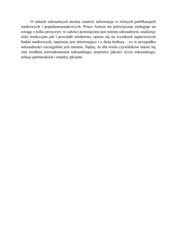 O mitach seksualnych można znaleźć informacje w różnych publikacjach naukowych i popularnonaukowych. Praca Autora im poświęcona zasługuje na uwagę z kilku przyczyn: w całości poświęcona jest mitom seksualnym, analizuje mity tradycyjne jak i powstałe niedawno, opiera się na wynikach najnowszych badań naukowych, napisana jest interesująco i z dużą kulturą – co w przypadku seksualności szczególnie jest istotnie. Sądzę, że dla wielu czytelników stanie się ona źródłem uświadomienia seksualnego, poprawy jakości życia seksualnego, relacji partnerskich i między płciami.