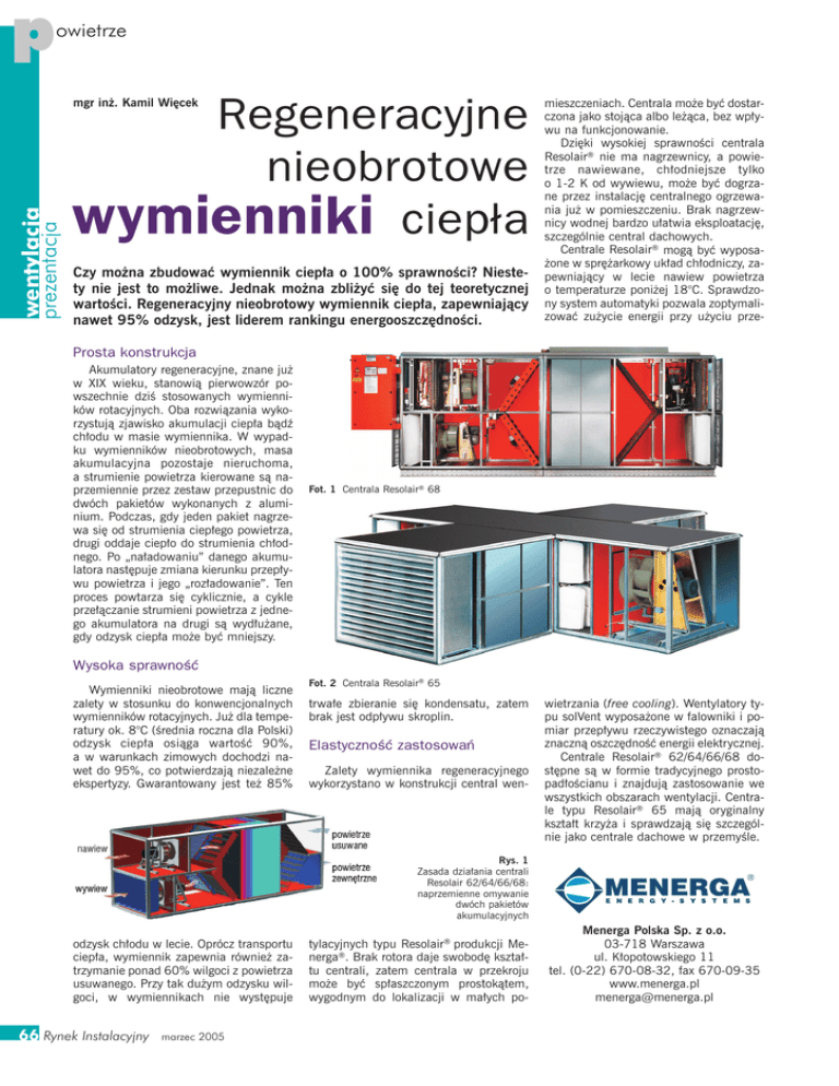 p owietrze wentylacja prezentacja mgr in¿. Kamil Wiêcek Regeneracyjne nieobrotowe wymienniki ciepła Czy mo¿na zbudowaæ wymiennik ciep³a o 100% sprawnoœci? Niestety nie jest to mo¿liwe. Jednak mo¿na zbli¿yæ siê do tej teoretycznej wartoœci. Regeneracyjny nieobrotowy wymiennik ciep³a, zapewniaj¹cy nawet 95% odzysk, jest liderem rankingu energooszczêdnoœci. mieszczeniach. Centrala mo¿e byæ dostarczona jako stoj¹ca albo le¿¹ca, bez wp³ywu na funkcjonowanie. Dziêki wysokiej sprawnoœci centrala Resolair® nie ma nagrzewnicy, a powietrze nawiewane, ch³odniejsze tylko o 1-2 K od wywiewu, mo¿e byæ dogrzane przez instalacjê centralnego ogrzewania ju¿ w pomieszczeniu. Brak nagrzewnicy wodnej bardzo u³atwia eksploatacjê, szczególnie central dachowych. Centrale Resolair® mog¹ byæ wyposa¿one w sprê¿arkowy uk³ad ch³odniczy, zapewniaj¹cy w lecie nawiew powietrza o temperaturze poni¿ej 18°C. Sprawdzony system automatyki pozwala zoptymalizowaæ zu¿ycie energii przy u¿yciu prze- Prosta konstrukcja Akumulatory regeneracyjne, znane ju¿ w XIX wieku, stanowi¹ pierwowzór powszechnie dziœ stosowanych wymienników rotacyjnych. Oba rozwi¹zania wykorzystuj¹ zjawisko akumulacji ciep³a b¹dŸ ch³odu w masie wymiennika. W wypadku wymienników nieobrotowych, masa akumulacyjna pozostaje nieruchoma, a strumienie powietrza kierowane s¹ naprzemiennie przez zestaw przepustnic do dwóch pakietów wykonanych z aluminium. Podczas, gdy jeden pakiet nagrzewa siê od strumienia ciep³ego powietrza, drugi oddaje ciep³o do strumienia ch³odnego. Po „na³adowaniu” danego akumulatora nastêpuje zmiana kierunku przep³ywu powietrza i jego „roz³adowanie”. Ten proces powtarza siê cyklicznie, a cykle prze³¹czanie strumieni powietrza z jednego akumulatora na drugi s¹ wyd³u¿ane, gdy odzysk ciep³a mo¿e byæ mniejszy. Fot. 1 Centrala Resolair® 68 Wysoka sprawność Wymienniki nieobrotowe maj¹ liczne zalety w stosunku do konwencjonalnych wymienników rotacyjnych. Ju¿ dla temperatury ok. 8°C (œrednia roczna dla Polski) odzysk ciep³a osi¹ga wartoœæ 90%, a w warunkach zimowych dochodzi nawet do 95%, co potwierdzaj¹ niezale¿ne ekspertyzy. Gwarantowany jest te¿ 85% Fot. 2 Centrala Resolair® 65 trwa³e zbieranie siê kondensatu, zatem brak jest odp³ywu skroplin. Elastyczność zastosowań Zalety wymiennika regeneracyjnego wykorzystano w konstrukcji central wen- wietrzania (free cooling). Wentylatory typu solVent wyposa¿one w falowniki i pomiar przep³ywu rzeczywistego oznaczaj¹ znaczn¹ oszczêdnoœæ energii elektrycznej. Centrale Resolair® 62/64/66/68 dostêpne s¹ w formie tradycyjnego prostopad³oœcianu i znajduj¹ zastosowanie we wszystkich obszarach wentylacji. Centrale typu Resolair® 65 maj¹ oryginalny kszta³t krzy¿a i sprawdzaj¹ siê szczególnie jako centrale dachowe w przemyœle. Rys. 1 Zasada dzia³ania centrali Resolair 62/64/66/68: naprzemienne omywanie dwóch pakietów akumulacyjnych odzysk ch³odu w lecie. Oprócz transportu ciep³a, wymiennik zapewnia równie¿ zatrzymanie ponad 60% wilgoci z powietrza usuwanego. Przy tak du¿ym odzysku wilgoci, w wymiennikach nie wystêpuje 66 Rynek Instalacyjny marzec 2005 tylacyjnych typu Resolair® produkcji Menerga®. Brak rotora daje swobodê kszta³tu centrali, zatem centrala w przekroju mo¿e byæ sp³aszczonym prostok¹tem, wygodnym do lokalizacji w ma³ych po- Menerga Polska Sp. z o.o. 03-718 Warszawa ul. K³opotowskiego 11 tel. (0-22) 670-08-32, fax 670-09-35 www.menerga.pl [email protected]