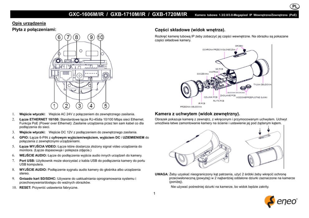 GXC-1606M/IR / GXB-1710M/IR / GXB-1720M/IR Opis urządzenia Płyta z połączeniami: Kamera tubowa 1.3/2.0/3.0-Megapixel IP Wewnętrzna/Zewnętrzna (PoE) Części składowe (widok wnętrza). Rozkręć kamerę tubową IP żeby zobaczyć jej części wewnętrzne. Na obrazku są pokazane części składowe kamery. 1. 2. 3. 4. Wejście wtyczki: Wejście AC 24V z połączeniem do zewnętrznego zasilania. Łącze ETHERNET 10/100: Standardowe łącze RJ-45dla 10/100 Mbps sieci Ethernet. Funkcja PoE (Power over Ethernet): Zasilanie urządzenia przez ten sam kabel co dla podłączenia do sieci. Wejście wtyczki: Kamera z uchwytem (widok zewnętrzny). Obrazek pokazuje kamerę z zewnątrz, z wkręconym i przymocowanym uchwytem. Uchwyt umożliwia łatwe zamontowanie kamery na ścianie i ustawienie jej pod żądanym kątem. Wejście DC 12V z podłączeniem do zewnętrznego zasilania. GPIO: Łącze 6-PIN z cyfrowym wyjściem/wejściem, wyjściem DC i UZIEMIENIEM do połączenia z zewnętrznymi urządzeniami. 5. Łącze WYJŚCIA VIDEO: Łącze które dostarcza złożony signal video urządzenia do monitora. (Łącze dopasowuje i polepsza zdjęcia.) 6. 7. WEJŚCIE AUDIO: Łącze do podłączenia wyjścia audio innych urządzeń do kamery. 8. WYJŚCIE AUDIO: Podłączenie sygnalu audio kamery do głośnika albo urządzenia stereo. 9. Gniazdo kart SD/SDHC: Używane do uaktualniania oprogramowania systemu i przechowywania/dostępu do ważnych obrazków. Port USB: Użytkownik może skorzystać z kabla USB do podłączenia kamery do portu USB komputera. 10. RESET: Przywróć ustawienia fabryczne. UWAGA: Żeby uzyskać nieograniczony kąt patrzenia, użyć 2 śróbki żeby wkręcić ochronę przeciwsłoneczną (powyżej) w 2 najbardziej oddalone dziurki zaznaczone na kamerze (poniżej). Nie używać pośredniej dziurki na kamerze, bo widok będzie zakrity. 1 Do instalowania, konfiguracji i ustawienia kamery IP, prosimy wykonać kroki poniżej. 1. Sprawdź klasę IP swojego PC Krok 1: Z menu Start, wskaż na Ustawienia i po tym naciśnij na Panel sterowania. Krok 2: Kiedy się pokaże Panel sterowania, dwa razy naciśnij ikonkę Połączenia sieciowe. Pojawi się okienko dialogowe Połączenia sieciowe. Krok 3: Naciśnij pasek Protokoły w okienku dialogowym Połączenia sieciowe. Krok 4: Kiedy się pokaże okienko dialogowe Właściwości lokalnego połączenia, wybierz Protokół sieciowy (TCP/IP) i kliknij na Właściwości. Krok 5: W okienku dialogowym Właściwości protokołu sieciowego (TCP/IP), wybierz Użyj następny adres IP żeby zaznaczyć że nie chcesz użyć DHCP, i przydziel adres IP 192.168.1.200 z maską Subnet mask 255.255.255.0. Kiedy zakonczysz, kliknij OK. Krok 6: Wybierz Zamknij żeby zakończyć zmianę. 4. Ustaw Krok 1: Krok 2: Krok 3: Krok 4: Krok 5: Krok 6: Krok 7: Krok 8: 2. Instaluj pakiety UPnP swojego PC Jak opisano powyżej, Microsoft Windows XP® nie rozpocznie UPnP servisu domyślnie; jednak przed inicjalizacją potrzebna jest instalacja niektórych pakietów. Następujące kroki pomogą w instalowaniu. Krok 1: Z menu Start, wskaż na Ustawianie dostępu do programu i Domyślnie, i kliknij. Krok 2: Kiedy sie pokaże okienko dialogowe Dodaj albo usuń oprogramowanie, kliknij na przycisk Dodaj/Usuń komponenty Windows. Krok 3: Sprawdź Usługi sieciowe w okienku dialogowym Windows Component Wizard i naciśnij Szczegóły… Krok 4: Sprawdź UPnP User Interface i wybierz OK. Krok 5: Kiedy wróci okienko dialogowe Wizard komponent sieci, naciśnij Next. Krok 6: Po upłwu koło jednej minuty, instalacja UPnP się zakończy, naciśnij Koniec żeby zamknąć. Krok 9: Krok 10: adres statyczny IP kamery. Podłącz zasilanie. Podłącz kabel USB do swojego PC i do gniazda USB z tyłu soczewki. Wyskoczy okienko z zapitaniem czy chcesz “Zastartować program”,"Otworzyć folder do przęglądania plików”, albo "Nie robić nic". Wybierz "Zastartować program" i kliknij "OK", wyskoczy okienko "konfiguracja USB". Nastaw Ustawienia sieci i rodzaj adresu IP na żądane. Przed zmianą adresu IP, powinienesz zapisać domyślny fabryczny Statyczny adres IP (192.168.1.10). Po zmianie adresu IP, naciśnij "Użyć" guzik w okienku "Konfiguracja USB”. Wyskoczy zapitanie zatwierdzenia działania z "OK". Naciśnij "OK", i usuń podłączenie USB z swego PC. Naciśnij "Wyjście" na dnie okienka "Konfiguracja USB” żeby zamknąć okienko. Lub, wybierz guzik "Startuj" tżeby zobaczyć obrazek z lokalnej kamery bezpośrednio. Przed naciśnięciem "Startuj", sprawdź adres IP swojego PC i skorzystaj z łącznika sieci (RJ-45) żeby się podłączyć do kamery. Jeżeli widzisz obraz, znaczy że ustawienie IP jest zakończone. 5. Skanuj kamerę IP przez “Moja sieć” Krok 1: Po instalacji i zastartowaniu serwisów, protokół UPnP zacznie działać. Teraz możesz skanować wszystkie Kamery IP w Moja sieć. Krok 2: Tylko dwa razy naciśnij ikonkę Kamera IP, i strumień video na żywo wyskoczy bez wyznaczenia adresu w Microsoft Internet Explorerze. 6. Zmiana kontroly i ustawienia działania kamery IP. Krok 1: Wpisz rodzaj adresu IP w przeszukiwarce IE. Zobaczysz obrazki z kamery IP. Krok 2: Skorzystaj z nacisków pod obrazkami żeby wejść do innych stron ustawień działania. Krok 3: Po zmianie ustawień, nie zapomnij kliknąć na guzik "Submit” na każdej stronie. 3. Włacz Serwisy swojego PC Po instalacji, trzeba włączyć odpowiednie serwisy żeby rozpocząć protokół UPnP. Następujące kroki pokażą jak to zrobić. Krok 1: Z menu Start, wskaż na Ustawienia, po tym naciśnij na Panel sterowania. Krok 2: Kiedy się pokaże Panel sterowania, naciśnij dwa razy na ikonkę Narzędzia administracyjne. Pokaże się skrzynka dialogowa Narzędzia administracyjne. Krok 3: Naciśnij na ikonkę Serwisy w skrzyncę dialogowej Narzędzia administracyjne. Krok 4: Kiedy się pokaże skrzynka dialogowa Serwisy, naciśnij dwa razy na ikonkę SSDP Odnalezienie serwisu. Krok 5: Wybierz Automatyczne w Rodz