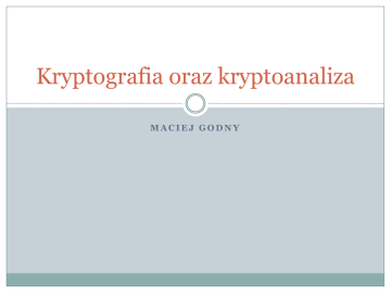 Kryptografia oraz kryptoanaliza MACIEJ GODNY Kryptologia kryptografia kryptoanaliza Starożytność do XV w. posłańcy hieroglify? szyfry przestawieniowe szyfry podstawieniowe Szyfry przestawieniowe szyfr przestawieniowy wszystkie znaki tekstu jawnego w zaszyfrowanym figury geometryczne do przestawień skytale metoda słów prawdopodobnych sz. płotkowy zamiana co 2, 3, 4 zamiana grupami Szyfry podstawieniowe szyfr podstawieniowy rozkład statystyczny znaków brute-force szyfr Cezara (August o 1 w prawo, X=AA) ala ma kota wiw jw hlpw (3) ROT13 kyk zk wbfk AtBash (~500 p.n.e) Alef Taw, Beth Szin ala ma kota zoz nz plgz Szyfry podstawieniowe proste 1 znak tekstu jawnego - dokladnie1 znak szyfrogramu homofoniczne 1 znak t. j. – jeden z „homofonów” poligramowe szyfrowane grupy znaków wieloalfabetowe - polialfabetyczne kilka przekształceń 1467 leon Battista Alberti