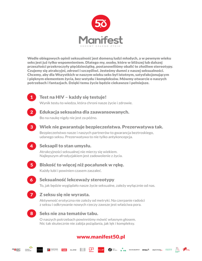 Wedle obiegowych opinii seksualność jest domeną ludzi młodych, a w pewnym wieku seks jest już tylko wspomnieniem. Dlatego my, osoby, które w bliższej lub dalszej przeszłości przekroczyły pięćdziesiątkę, postanowiliśmy obalić te złośliwe stereotypy. Czujemy się atrakcyjni, zdrowi i szczęśliwi. Jesteśmy dumni z naszej seksualności. Chcemy, aby dla Wszystkich w naszym wieku seks był istotnym, satysfakcjonującym i pięknym elementem życia, bez wstydu i kompleksów. Mówmy otwarcie o naszych potrzebach i fantazjach. Dzięki temu życie będzie ciekawsze i pełniejsze. Test na HIV – każdy się testuje! Wynik testu to wiedza, która chroni nasze życie i zdrowie. Edukacja seksualna dla zaawansowanych. Bo na naukę nigdy nie jest za późno. Wiek nie gwarantuje bezpieczeństwa. Prezerwatywa tak. Bezpieczeństwo nasze i naszych partnerów to gwarancja beztroskiego, udanego seksu. Prezerwatywa to nie tylko antykoncepcja. Seksapil to stan umysłu. Atrakcyjności seksualnej nie mierzy się wiekiem. Najlepszym afrodyzjakiem jest zadowolenie z życia. Biskość to więcej niż pocałunek w rękę. Każdy lubi i powinien czasem zaszaleć. Seksualność lekceważy stereotypy. To, jak będzie wyglądało nasze życie seksualne, zależy wyłącznie od nas. Z seksu się nie wyrasta. Aktywność erotyczna nie zależy od metryki. Na czerpanie radości z seksu i odkrywanie nowych rzeczy zawsze jest właściwa pora. Seks nie zna tematów tabu. O naszych potrzebach powinniśmy mówić własnym głosem. Nic tak skutecznie nie zabija pożądania, jak lęk i kompleksy. www.manifest50.pl