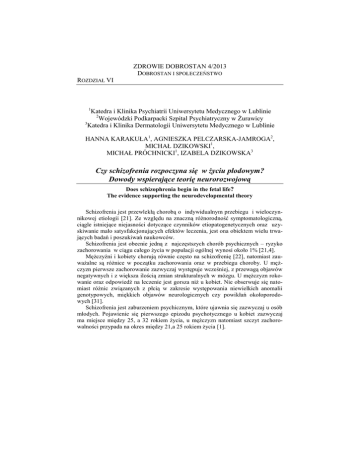 ZDROWIE DOBROSTAN 4/2013 DOBROSTAN I SPOŁECZEŃSTWO ROZDZIAŁ VI 1 Katedra i Klinika Psychiatrii Uniwersytetu Medycznego w Lublinie 2 Wojewódzki Podkarpacki Szpital Psychiatryczny w Żurawicy 3 Katedra i Klinika Dermatologii Uniwersytetu Medycznego w Lublinie HANNA KARAKUŁA1, AGNIESZKA PELCZARSKA-JAMROGA2, MICHAŁ DZIKOWSKI1, MICHAŁ PRÓCHNICKI1, IZABELA DZIKOWSKA3 Czy schizofrenia rozpoczyna się w życiu płodowym? Dowody wspierające teorię neurorozwojową Does schizophrenia begin in the fetal life? The evidence supporting the neurodevelopmental theory Schizofrenia jest przewlekłą chorobą o indywidualnym przebiegu i wieloczynnikowej etiologii [21]. Ze względu na znaczną różnorodność symptomatologiczną, ciągle istniejące niejasności dotyczące czynników etiopatogenetycznych oraz uzyskiwanie mało satysfakcjonujących efektów leczenia, jest ona obiektem wielu trwających badań i poszukiwań naukowców. Schizofrenia jest obecnie jedną z najczęstszych chorób psychicznych – ryzyko zachorowania w ciągu całego życia w populacji ogólnej wynosi około 1% [21,4]. Mężczyźni i kobiety chorują równie często na schizofrenię [22], natomiast zauważalne są różnice w początku zachorowania oraz w przebiegu choroby. U mężczyzn pierwsze zachorowanie zazwyczaj występuje wcześniej, z przewagą objawów negatywnych i z większa ilością zmian strukturalnych w mózgu. U mężczyzn rokowanie oraz odpowiedź na leczenie jest gorsza niż u kobiet. Nie obserwuje się natomiast różnic związanych z płcią w zakresie występowania niewielkich anomalii genotypowych, miękkich objawów neurologicznych czy powikłań okołoporodowych [31]. Schizofrenia jest zaburzeniem psychicznym, które ujawnia się zazwyczaj u osób młodych. Pojawienie się pierwszego epizodu psychotycznego u kobiet zazwyczaj ma miejsce między 25, a 32 rokiem życia, u mężczyzn natomiast szczyt zachorowalności przypada na okres między 21,a 25 rokiem życia [1]. ZDROWIE I DOBROSTAN NR 4 /2013 Dobrostan społeczeństwo Bardzo dużo uwagi poświęca się badaniom skierowanym na poszukiwanie kluczowych okresów dla rozwoju schizofrenii oraz czynników, które są istotne w powstawaniu tego schorzenia. Na przestrzeni lat powstawały różne teorie starające się wyjaśnić, dlaczego dochodzi do zachorowania na schizofrenię. Jednak żadna z nich nie jest w stanie wyjaśnić tego zjawiska w pełni, pomimo ciągle rosnących możliwości neuroobrazowania, badań genetycznych, badań molekularnych i innych metod diagnostycznych. Aktualnie funkcjonujące teorie etiopatogenetyczne nakładają się na siebie i tworzą swoiste puzzle, które w przyszłości być może uda się połączyć w całość i znaleźć odpowiedź na pytanie - kiedy, dlaczego i jak powstaje schizofrenia. Obecnie dominującym sposobem rozumienia przyczyn schizofrenii jest teoria neurorozwojowa, która zakłada, że pojawienie się objawów choroby jest końcowym etapem nieprawidłowych zmian zachodzących w okresie rozwoju ośrodkowego układu nerwowego, które mają miejsce najprawdopodobniej jeszcze w okresie życia płodowego, a następnie w okresie okołoporodowym i wczesnego dzieciństwa [45]. Teoria neurorozwojowa schizofrenii ma swój początek w latach 80-tych XX wieku, kiedy niezależnie od siebie I.Feinberg [16], T. Crow [14], D. Weinberger [59] i R. Murray [39] w swoich pracach umieścili pierwsze doniesienia o neurorozwojowym charakterze powstawania schizofrenii. Wg wielu autorów [51] schizofrenia jest behawioralną manifestacją zaburzonego procesu neurorozwojowego, który rozpoczyna się na długo przed początkiem objawów klinicznych i jest wywołany przez kombinację czynników środowiskowych i genetycznych. Aby przedstawić zarys teorii neurorozwojowej schizofrenii należy prześledzić proces dojrzewania ośrodkowego układu nerwowego, co zostało w uproszczeniu przedstawione w tab.1 Tab I. Etapy rozwoju CUN (Kolb, 1989) Etapy rozwoju Neurulacja Proliferacja Migracja Różnicowanie 112 Wiek Zmiany Tworzenie się pierwotnej cewy nerwowej oraz pierwotnych pęcherzyków przodo-, śród- i tyłomózgowia Namnażanie neuronów skupionych 40-125 dzień w okolicy okołokomorowej Przemieszczanie się neuronów wzdłuż włó8-16 tydzień kien glejowych do miejsc przeznaczenia III trymestr ciąży – Okres intensywnego wzrostu liczby pierwsze 3 lata życia obwodów i połączeń synaptycznych Okres regresji Apoptozy Od ok. 4 r.ż. do końca Trzebieży (prunning) II dekady Cofanie aksonów , mielogeneza Do 40 dnia Hanna Karakuła, Agnieszka Pelczarska-Jamroga, Michał Dzikowski, Michał Próchnicki, Izabela Dzikowska Czy schizofrenia rozpoczyna się w życiu płodowym? Dowody wspierające teorię neurorozwojową Niektóre czynniki środowiskowe mogą zaburzyć normalny neurobiologiczny proces dojrzewania mózgu na jednym lub kilku jego etapach [44]. W 1999 roku Keshavan zaproponował model podwójnego uderzenia (,,2 –hits model”) w schizofrenii obejmujący dwa krytyczne okresy, w których zadziałanie szkodliwego czynnika może zwiększyć ryzyko zachorowania na schizofrenię tj. okres migracji neuronów i przycinania (,,pruningu”). Czas migracji neuronów na wczesnych etapach rozwoju mózgu może prowadzić do nieprawidłowości w sieci synaptycznej, co skutkuje powstawaniem objawów przedchorobowych np. zaburzeń koordynacji ruchów. Drugim krytycznym momentem jest czas adolescencji, kiedy dochodzi do nadmiernego przycinania („pruningu”) synaps i utraty plastyczności mózgu co może odpowiadać za pojawienie się objawów choroby. Dowodami wskazującymi na neurorozwojowe pochodzenie schizofrenii są badania strukturalne in vivo i post mortem wskazujące na nieprawidłowości cytoarchitektoniczne [20], ilościowy ubytek neuronów [48] i zmiany wielkości niektórych struktur mózgowych, bez towarzyszącej opisanym zjawiskom gliozy [24]. Za tym, że są to zmiany rozwojowe przemawia fakt, że obserwuje się