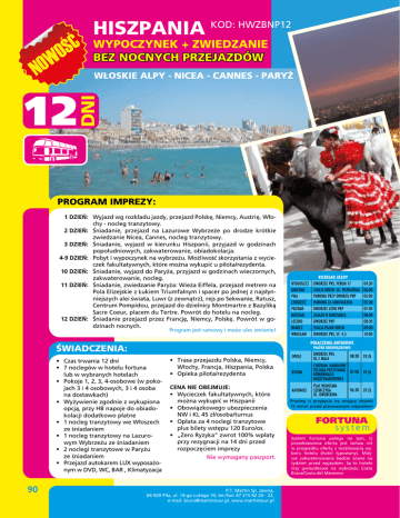 HISZPANIA KOD: HWZBNP12 WYPOCZYNEK + ZWIEDZANIE BEZ NOCNYCH PRZEJAZDÓW 12 DNI Włoskie Alpy - Nicea - Cannes - Paryż PROGRAM IMPREZY: 1 DZIEŃ: Wyjazd wg rozkładu jazdy, przejazd Polskę, Niemcy, Austrię, Włochy - nocleg tranzytowy. 2 DZIEŃ: Śniadanie, przejazd na Lazurowe Wybrzeże po drodze krótkie zwiedzanie Nicea, Cannes, nocleg tranzytowy. 3 DZIEŃ: Śniadanie, wyjazd w kierunku Hiszpanii, przyjazd w godzinach popołudniowych, zakwaterowanie, obiadokolacja. 4-9 DZIEŃ: Pobyt i wypoczynek na wybrzeżu. Możliwość skorzystania z wycieczek fakultatywnych, które można wykupić u pilota/rezydenta. 10 DZIEŃ: Śniadanie, wyjazd do Paryża, przyjazd w godzinach wieczornych, zakwaterowanie, nocleg. 11 DZIEŃ: Śniadanie, zwiedzanie Paryża: Wieża Eiffela, przejazd metrem na Pola Elizejskie z Łukiem Triumfalnym i spacer po jednej z najsłynniejszych alei świata, Luwr (z zewnątrz), rejs po Sekwanie, Ratusz, Centrum Pompidou, przejazd do dzielnicy Montmartre z Bazyliką Sacre Coeur, placem du Tertre. Powrót do hotelu na nocleg. 12 DZIEŃ: Śniadanie przejazd przez Francję, Niemcy, Polskę. Powrót w godzinach nocnych. Program jest ramowy i może ulec zmianie! ROZKŁAD JAZDY DWORZEC PKS, PERON 17 STACJA ORLEN UL. POZNAŃSKA PARKING PRZY DWORCU PKP PARKING ZA CMENTARZEM DWORZEC LETNI PKP ZAJAZD U DUDZIARZA DWORZEC PKP STACJA PALIW ORLEN DWORZEC PKS, ST. 4,5 04:30 06:00 05:00 05:30 07:00 08:00 08:30 09:00 10:00 POŁĄCZENIA ANTENOWE ŚWIADCZENIA: PŁATNE OBOWIĄZKOWO • Czas trwania 12 dni • 7 noclegów w hotelu fortuna lub w wybranych hotelach • Pokoje 1, 2, 3, 4-osobowe (w pokojach 3 i 4 osobowych, 3 i 4 osoba na dostawkach) • Wyżywienie zgodnie z wykupiona opcją, przy HB napoje do obiadokolacji dodatkowo płatne • 1 nocleg tranzytowy we Włoszech ze śniadaniem • 1 nocleg tranzytowy na Lazurowym Wybrzeżu ze śniadaniem • 2 noclegi tranzytowe w Paryżu ze śniadaniem • Przejazd autokarem LUX wyposażonym w DVD, WC, BAR , Klimatyzacja 90 BYDGOSZCZ GNIEZNO PIŁA CHODZIEŻ POZNAŃ KOŚCIAN LESZNO RAWICZ WROCŁAW • Trasa przejazdu Polska, Niemcy, Włochy, Francja, Hiszpania, Polska • Opieka pilota/rezydenta CENA NIE OBEJMUJE: • Wycieczek fakultatywnych, które można wykupić w Hiszpanii • Obowiązkowego ubezpieczenia NW i KL 45 zł/osoba/turnus • Opłata za 4 noclegi tranzytowe plus bilety wstępu 120 Euro/os. • „Zero Ryzyka” zwrot 100% wpłaty przy rezygnacji na 14 dni przed rozpoczęciem imprezy Nie wymagany paszport. P.T. Martin Sp. Jawna, 64-920 Piła, ul. 14-go Lutego 10, tel./fax: 67 215 62 20 - 22, e-mail: [email protected], www.martintour.pl OPOLE DWORZEC PKS UL.1 MAJA BYTOM CENTRUM HANDLOWE PLEJADA PRZYSTANEK 07:00 70 ZŁ KOMUNIKACJI MIĘDZYNARODOWEJ KATOWICE PLAC WILHELMA SZEWCZYKA UL. DWORCOWA 08:30 70 ZŁ 06:30 70 ZŁ Prosimy o przybycie na miejsce zbiórki 15 minut przed planowanym odjazdem! FORTUNA system System Fortuna polega na tym, iż przedstawiona oferta jest tańsza niż w przypadku oferty z możliwością wyboru hotelu (hotel typowany). Miejsce zakwaterowania będzie znane na tydzień przed wyjazdem. Są to hotele trzy gwiazdkowe na wybrzeżu Costa Brava/Costa del Maresme. KOD: HWZBNP12 ZA WCZESNĄ REZERWACJĘ HISZPANIA WYPOCZYNEK + ZWIEDZANIE BEZ NOCNYCH PRZEJAZDÓW Rabaty 400 zł - 100% WPŁATY przy dokonaniu rezerwacji, obowiązuje od 2.11.2010 r. do dnia 5.02.2011 r. 300 zł - 300 zł PRZEDPŁATY przy dokonaniu rezerwacji, obowiązuje od 2.11.2010 r. do dnia 31.03.2011 r. 200 zł - 200 zł PRZEDPŁATY przy dokonaniu rezerwacji, obowiązuje od 2.11.2010 r. do dnia 31.03.2011 r. 100 zł - 100 zł PRZEDPŁATY przy dokonaniu rezerwacji, obowiązuje od 2.11.2010 r. do dnia 30.04.2011 r. Do rezerwacji dokonanych w/w terminach dodatkowo: • Gwarancja niezmienności ceny! • Karty rabatowe na wycieczki • Wycieczka do Bodegi Gratis! fakultatywne 20% zniżki • Możliwość rezerwacji miejsc w autokarze! Alhambra*** HB SANTA SUSANNA Riwiera*** HB SANTA SUSANNA Caprici*** HB SANTA SUSANNA Acapulco*** HB LLORET DE MAR Don Juan*** HB LLORET DE MAR 1550 1550 1700 1700 1900 1990 1990 2140 2170 1550 1550 1700 1700 1800 1950 1950 2150 2170 1590 1590 1650 1740 1880 1880 2030 2030 2030 1380 1380 1590 1660 1720 1720 1900 1990 2120 2260 2260 1550 1550 1680 1740 1880 1930 1960 2100 2100 1380 1380 1770 1770 1770 1770 2030 2140 2140 2210 - 1550 1550 1660 1660 1930 1930 2140 2140 2200 1630 1630 1740 1740 1900 2080 2140 - 1850 2090 2200 1850 2090 2200 1850 2090 2200 1850 1880 1880 1700 1700 1660 1410 1630 1630 1410 1560 1520 2250 2250 2250 2030 1780 1780 1600 2390 2390 2390 1940 1940 1660 1740 1660 1740 1660 1600 2320 2300 2300 1940 1800 1800 1700 2280 2280 2280 1940 1740 1740 1520 2320 1880 1880 1740 2380 2140 1850 1850 1850 1940 1850 1850 1630 Catalonia*** HB CALLELA 1550 1500 1550 1500 1630 1660 1660 1660 1770 1800 1920 1920 1960 1900 2030 2030 2030 2030 1410 1410 1560 1700 1770 1850 Fortuna*** HB Costa Brava/ Costa Maresme Maripins*** HB MALGRAT DE MAR 19.05-30.05 29.05-09.06 05.06-16.06 12.06-23.06 19.06-30.06 26.06-07.07 03.07-14.07 10.07-21.07 17.07-28.07 24.07-04.08 31.07-11.08 07.08-18.08 14.08-25.08 21.08-01.09 28.08-08.09 04.09-15.09 11.09-22.09 Garbi*** HB CALLELA 12.05-23.05 Maeva* BB LLORET DE MAR TERMINY I CENY Bon Repos/Esplai*** HB, ALL CALLELA Uwaga! Nasz autokary nie jeżdżą w ruchu wahadłowym. W hotelu Garbi wszystkie pokoje z widokiem na morze obowiązkowa dopłata 130 zł/ osoba/turnus. Hotel Bon Repos, posiada 2 formuły wyżywienia: HB - dwa posiłki dziennie stół szwedzki - napoje do obiadokolacji płatne dodatkowo oraz formułę ALL INCLUSIVE, która zawiera śniadanie, obiad, kolację, napoje bezalkoholowe i lokalne alkoholowe od 10:00 do 23:30, przekąski w snack barze od 11:00 do 18:00, lody dla dzieci od 11:00 do 18:00. Dopłata do ALL 400 zł/osoba/turnus. • Osoba dorosła jako 3 osoba w pokoju 10% zniżki • 1 dziecko do lat 11 jako 3 osoba w pokoju na dostawce 50% zniżki • 2 dziecko do lat 11 jako 3
