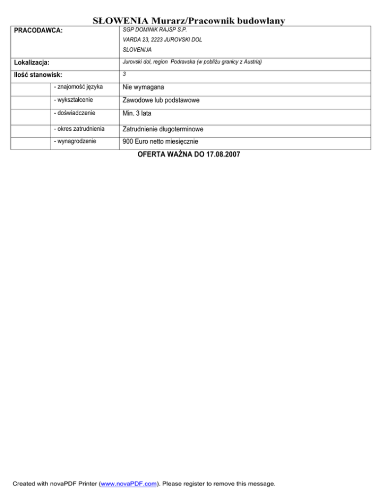 SŁOWENIA Murarz/Pracownik budowlany PRACODAWCA: SGP DOMINIK RAJSP S.P. VARDA 23, 2223 JUROVSKI DOL SLOVENIJA Lokalizacja: Jurovski dol, region Podravska (w pobliżu granicy z Austrią) Ilość stanowisk: 3 - znajomość języka Nie wymagana - wykształcenie Zawodowe lub podstawowe - doświadczenie Min. 3 lata - okres zatrudnienia Zatrudnienie długoterminowe - wynagrodzenie 900 Euro netto miesięcznie OFERTA WAŻNA DO 17.08.2007 Created with novaPDF Printer (www.novaPDF.com). Please register to remove this message.