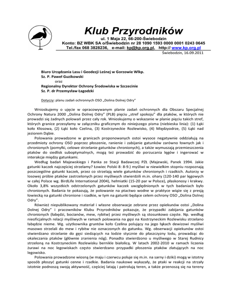 Klub Przyrodników ul. 1 Maja 22, 66-200-Świebodzin Konto: BZ WBK SA o/Świebodzin nr 28 1090 1593 0000 0001 0243 0645 Tel./fax 068 3828236, e-mail: [email protected], http:// www.kp.org.pl Świebodzin, 16.09.2011 Biuro Urządzania Lasu i Geodezji Leśnej w Gorzowie Wlkp. Sz. P. Paweł Guzikowski oraz Regionalny Dyrektor Ochrony Środowiska w Szczecinie Sz. P. dr Przemysław Łagodzki Dotyczy: planu zadań ochronnych OSO „Dolina Dolnej Odry” Wnioskujemy o ujęcie w opracowywanym planie zadań ochronnych dla Obszaru Specjalnej Ochrony Natura 2000 „Dolina Dolnej Odry” (PLB) pięciu „stref spokoju” dla ptaków, w których nie prowadzi się żadnych polowań przez cały rok. Wnioskujemy o wskazanie w planie pięciu takich stref, których granice przesyłamy w załączniku graficznym do niniejszego pisma (niebieska linia): (1) Łąki koło Kłosowa, (2) Łąki koło Czelina, (3) Kostrzyneckie Rozlewisko, (4) Międzyodrze, (5) Łąki nad jeziorem Dąbie. Polowania prowadzone w granicach proponowanych ostoi wysoce negatywnie oddziałują na przedmioty ochrony OSO poprzez płoszenie, ranienie i zabijanie gatunków zarówno łownych jak i chronionych (pomyłki, celowe strzelanie gatunków chronionych), a także wymuszają przemieszczenia ptaków do siedlisk suboptymalnych, mogą też prowadzić do porzucania lęgów i ingerować w interakcje między gatunkami. Według badań Majewskiego i Panka ze Stacji Badawczej PZŁ (Majewski, Panek 1994. Jakie gatunki kaczek najczęściej strzelamy? Łowiec Polski 8: 8-9.) myśliwi w niewielkim stopniu rozpoznają poszczególne gatunki kaczek, przez co strzelają wiele gatunków chronionych i rzadkich. Autorzy w losowej próbie ptaków zastrzelonych przez myśliwych stwierdzili m.in. ohary (120-140 par lęgowych w całej Polsce wg. BirdLife International 2004), hełmiatki (15-20 par w Polsce), płaskonosy i krakwy. Około 3,8% wszystkich odstrzelonych gatunków kaczek uwzględnionych w tych badaniach było chronionych. Badania te pokazują, że polowanie na ptactwo wodne w praktyce wiąże się z presją łowiecką na gatunki chronione i rzadkie, w tym na gatunki będące celem ochrony OSO „Dolina Dolnej Odry”. Również niepublikowany materiał i własne obserwacje zebrane przez opiekunów ostoi „Dolina Dolnej Odry” i pracowników Klubu Przyrodników pokazuje, że przypadki zabijania gatunków chronionych (łabędzi, bocianów, mew, rybitw) przez myśliwych są stosunkowo częste. Np. według nieoficjalnych relacji myśliwych w ramach polowania na gęsi na Kostrzyneckim Rozlewisku strzelano łabędzie nieme. Wg. użytkownika gruntów koło Czelina polujący na jego łąkach dewizowi myśliwi masowo strzelali do mew i rybitw nie oznaczonych do gatunku. Wg. obserwacji opiekunów ostoi stwierdzano strzelanie do gęsi siedzących na lodzie stycznie do płaszczyzny lodu, prowadząc do okaleczania ptaków (głównie zranienia nóg). Ponadto stwierdzono u myśliwego w Starej Rudnicy strzeloną na Kostrzyneckim Rozlewisku bernikle białolicą. W latach 2002-2010 w ramach liczenia żurawi na noc legowiskach często stwierdzano przypadki płoszenia ptaków zlatujących na noc legowisko. Polowania prowadzone wiosną (w maju i czerwcu poluje się m.in. na sarny i dziki) mogą w istotny sposób płoszyć gatunki cenne i rzadkie. Badania naukowe wykazały, że ptaki w reakcji na strzały istotnie podnoszą swoją aktywność, częściej latają i patrolują teren, a także przenoszą się na tereny suboptymalne pod względem żerowisk. W mniejszym stopniu natomiast odpoczywają i żerują (Casas i inni 2009 Effects of hunting on the behaviour and spatial distribution of farmland birds: importance of hunting-free refuges in agricultural areas. Anim. Conserv. 12: 346-354).Ponadto, same strzały (niezależnie od celu polowań) zwiększają istotnie presję drapieżników generalistycznych, koncentrujących się w miejscu prowadzenia polowania celem wyszukiwania martwych lub rannych zwierząt i ich pozostałości. Przykładowo, badania w USA wykazały, że kruki zlatują się w miejsce, z którego słyszały strzały (White 2005 Hunters ring dinner bell for ravens: experimental evidence of a unique foraging strategy. Ecology 86: 10547-1060.). W efekcie, polowania istotnie zwiększają liczebność drapieżników w miejscu gdzie są prowadzone. Jak wiadomo kruk jest drapieżnikiem często niszczącym gniazda ptaków, a wzrost jego liczebności może się przekładać na wyższe straty w lęgach. Ponadto, sama obecność myśliwych, psów myśliwskich i samochodów potęguje efekt płoszenia wywołany strzałami. Na terenie OSO „Dolina Dolnej Odry” kilka gatunków będących celem ochrony OSO występuje w skrajnie niskiej liczebności (Bączek 2-3 pary, błotniak łąkowy 3-5 par, mewa czarnogłowa 2-3 pary, puchacz 2-3 pary, wodniczka 2-4 śpiewające samce). Z punktu widzenia trwałości populacji tych gatunków nawet pojedyncze polowanie wykonywane w okresie lęgowym w sąsiedztwie ich gniazda mogące istotnie wpłynąć na utratę lęgów (pomyłka myśliwego, spłoszenie samicy wysiadującej jaja, ściągnięcie drapieżników), spowoduje utratę 25-50% całej lęgowej populacji, a tym samym może istotnie pogorszyć stan zachowania populacji tych gatunków. Z tego względu wyłączenie z gospodarki łowieckiej pięciu stosunkowo niewielkich obszarów koncentracji gatunków rzadkich jest naszym zdaniem bezwzględnie konieczne do zapewnienia właściwego stanu ochrony gatunków ptaków, które są przedmiotem ochrony obszaru Natura 2000 „Dolina Dolnej Odry”. W praktyce, wdrożenie takich „stref spokoju” służących ochronie ptaków mogłoby być zrealizowane na różne sposoby. Najprostszym z nich byłoby uznanie w/w stref za „ostoje zwierzyny” i przyjęcie, w ramach gospodarki łowieckiej, że nie prowadzi się w nich polowań. Innym sposobem mogłoby być uznanie w/w stref za rezerwaty przyrody. Innym wreszcie – uznanie i zapisanie 