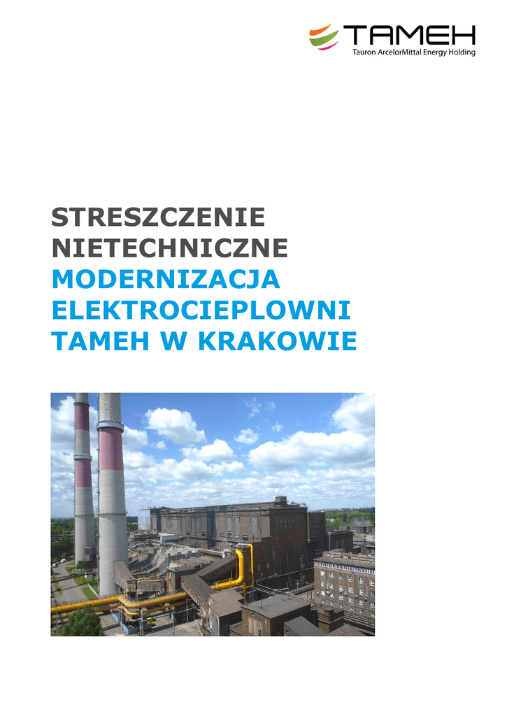 STRESZCZENIE NIETECHNICZNE MODERNIZACJA ELEKTROCIEPLOWNI TAMEH W KRAKOWIE STRESZCZENIE NIETECHNICZNE MODERNIZACJA ELEKTROCIEPLOWNI TAMEH W KRAKOWIE SPIS TREŚCI CZYM JEST TAMEH? DLACZEGO ELEKTROCIEPLOWNIA JEST NIEZBĘDNA W HUCIE? KONTEKST PRAWNY PROJEKTU LOKALIZACJA PROJEKTU OBECNY STAN ELEKROCIEPŁOWNI TAMEH W KRAKOWIE JAK ELEKTROCIEPŁOWNIA ZOSTANIE ZMODERNIZOWANA? ŚRODOWISKOWE SKUTKI PROJEKTU DODATKOWE INFORMACJE ORAZ PROCEDURA SKŁADANIA UWAG I OPINII TAMEH POLSKA Sp. z o.o. Al. J. Piłsudskiego 92 41-308 Dąbrowa Górnicza Polska T 032 735 55 01 T 032 735 55 05 F 032 735 55 14 www.tameh.pl REGON 243631583 NIP 6292469987 Kapitał zakładowy w pełni opłacony: 340 118 500 PLN Rejestracja: Sąd Rejonowy KatowiceWschód w Katowicach, Wydział VIII Gospodarczy Krajowego Rejestru Sądowego KRS 0000517891 1 1 2 3 4 5 6 7 Zarząd: Kristina Červenková Manfred Wawrzynosek Andrzej Curyło Prezes Zarządu Członek Zarządu Członek Zarządu Rafał Zawada Członek Zarządu 1 CZYM JEST TAMEH? Tauron Arcelor Mittal Energy Holding (TAMEH) jest spółką joint venture założoną w grudniu 2014 roku przez jeden z największych polskich koncernów energetycznych Tauron S.A. oraz wiodącego producenta stali Arcelor Mittal. Obie firmy posiadają po 50% udziałów w spółce TAMEH. TAMEH Holding jest właścicielem spółek operacyjnych: TAMEH Polska Sp. z o.o. i TAMEH Czech zarządzających elektrociepłowniami (EC) w hutach Arcelor Mittal w Polsce (Dąbrowa Górnicza, Kraków, Kędzierzyn Koźle) oraz w Czechach (Ostrava), które dostarczają energie elektryczną oraz inne media niezbędne do produkcji stali w hutach. Celem niniejszego streszczenia nietechnicznego jest przedstawienie projektu modernizacji elektrociepłowni w Krakowie planowanej przez TAMEH w celu spełnienia norm środowiskowych oraz poprawy wydajności energetycznej instalacji. Zakończenie projektu przewidywane jest na koniec 2017 roku. Finansowanie projektu jest zapewnione przez współwłaścicieli spółki oraz kredyty bankowe, o które spółka ubiegała się bezpośrednio. Spółka wdraża najwyższe standardy środowiskowo-społeczne. Dzięki temu oraz dzięki udziałowi międzynarodowych instytucji finansowych realizacja projektu zostanie przeprowadzona zgodnie z obowiązującymi przepisami zarówno krajowymi jak i Unii Europejskiej oraz najlepszymi praktykami w branży przemysłowej. DLACZEGO ELEKTROCIEPLOWNIA JEST NIEZBĘDNA W HUCIE? Duże zintegrowane huty są kompleksami instalacji przemysłowych zużywających duże ilości energii do produkcji stali z węgla i rudy żelaza. Do typowych etapów technologicznych należą: wytwarzanie koksu w koksowniach; jako produkt uboczny produkowana jest duża ilość gazu koksowniczego, który po obróbce w instalacji chemicznej może być wykorzystywany jako źródło energii; podczas obróbki chemicznej powstają również inne, liczne produkty uboczne takie jak smoła, benzen lub kwas siarkowy; wytwarzanie proszku lub granulatu z koksu, rudy żelaza i innych dodatków, jak np. wapień; wytwarzanie surówki w wielkich piecach, gaz wielkopiecowy jest generowany jako produkt uboczny; podstawowe wytwarzanie stali oraz odlewów żeliwnych metodą konwertorową tlenową, jako produkt uboczny generowany jest gaz konwertorowy. Wszystkie te etapy technologiczne wymagają dużej ilości energii elektrycznej, która jest produkowana na miejscu przez elektrociepłownie. Oprócz energii elektrycznej, elektrociepłownie produkują również parę używaną w różnych instalacjach, a także sprężone powietrze, które jest wykorzystywane w wielkich piecach. Jako, że gaz konwertorowy ma stosunkowo dużą wartość opałową (wartość opałowa wynosi od 17,4 do 20 MJ/m3), jest on powszechnie używany, jako paliwo w piecach koksowniczych i innych instalacjach, włączając w to potrzeby wytwarzania energii w elektrociepłowni. Gaz wielkopiecowy powstaje w dużych ilościach w wielkich piecach. Zawiera około 20-28% tlenku węgla, a wydajność energetyczna zazwyczaj waha się od 2,7 do 4,0 MJ/m3. Historycznie gaz wielkopiecowy był zwykle spalany w pochodniach, natomiast we współczesnych hutach stosuje się metodę współspalania z gazem konwertorowym, a czasem z gazem ziemnym. 2 KONTEKST PRAWNY PROJEKTU Elektrociepłownia w Krakowie o mocy zainstalowanej 898 MW jest klasyfikowana jako duży obiekt spalania. Instalacje tego typu mogą działać wyłącznie w oparciu o Pozwolenie Zintegrowane, które reguluje wszystkie aspekty oddziaływania na środowisko, włącznie z określeniem dopuszczalnej emisji zanieczyszczeń do atmosfery, odprowadzania ścieków, gospodarki odpadami, emisji hałasu i innych. Obecnie zakład funkcjonuje w oparciu o Pozwolenie Zintegrowane wydane dla hut spółki Arcelor Mittal, jednakże wniosek o uzyskanie własnego Pozwolenia Zintegrowanego został już przygotowany przez spółkę i zostanie złożony w najbliższym czasie. Pozwolenia Zintegrowane są wydawane przez organy właściwe, w oparciu o przepisy Prawa Ochrony Środowiska z dnia 3 października 2001 roku (wraz z późniejszymi zmianami), które wdraża, między innymi, dyrektywę o emisjach przemysłowych (IED) z 24 listopada 2010 r. Inne krajowe przepisy prawne, wdrażające odpowiednie dyrektywy Unii Europejskiej to: Ustawa o odpadach z dnia 14 grudnia 2012 roku, Ustawa o prawie wodnym z dnia 18 lipca 2001 roku, Ustawa o ochronie przyrody z dnia 16 kwietnia 2004 oraz inne. Szczegółowe kwestie zostały uwzględnione w rozporządzeniach wykonawczych do ustaw, wydanych przez Ministra Środowiska lub Radę Ministrów. Jako duży obiekt energetycznego spalania, zakład musi spełniać wytyczne Najlepszych Dostępnych Praktyk (Best Available Techniques, BAT), które są opisane w dokumencie referencyjnym (BREF), o którym mowa w dyrektywie IED. Elektrociepłownia działa w oparciu o Pozwolenie Zintegrowane (dokument nr SRII.7225.2.2.2015, wydany dnia 20 lutego 2015 roku przez Prezydenta Miasta Kraków)