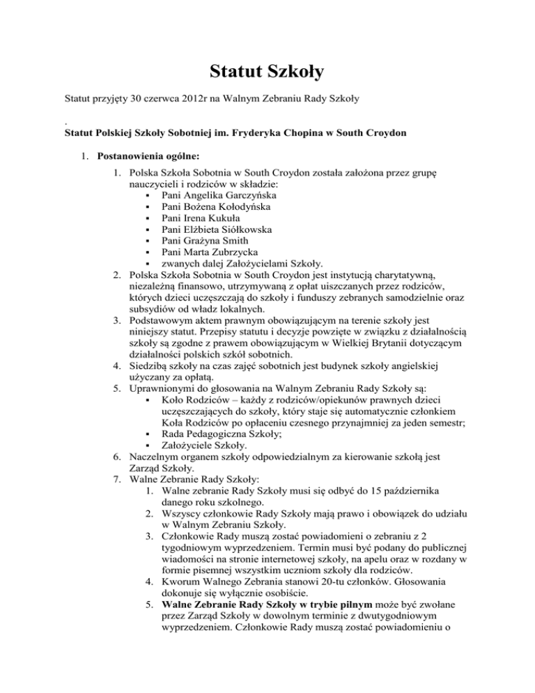 Statut Szkoły Statut przyjęty 30 czerwca 2012r na Walnym Zebraniu Rady Szkoły . Statut Polskiej Szkoły Sobotniej im. Fryderyka Chopina w South Croydon 1. Postanowienia ogólne: 1. Polska Szkoła Sobotnia w South Croydon została założona przez grupę nauczycieli i rodziców w składzie: Pani Angelika Garczyńska Pani Bożena Kołodyńska Pani Irena Kukuła Pani Elżbieta Siółkowska Pani Grażyna Smith Pani Marta Zubrzycka zwanych dalej Założycielami Szkoły. 2. Polska Szkoła Sobotnia w South Croydon jest instytucją charytatywną, niezależną finansowo, utrzymywaną z opłat uiszczanych przez rodziców, których dzieci uczęszczają do szkoły i funduszy zebranych samodzielnie oraz subsydiów od władz lokalnych. 3. Podstawowym aktem prawnym obowiązującym na terenie szkoły jest niniejszy statut. Przepisy statutu i decyzje powzięte w związku z działalnością szkoły są zgodne z prawem obowiązującym w Wielkiej Brytanii dotyczącym działalności polskich szkół sobotnich. 4. Siedzibą szkoły na czas zajęć sobotnich jest budynek szkoły angielskiej użyczany za opłatą. 5. Uprawnionymi do głosowania na Walnym Zebraniu Rady Szkoły są: Koło Rodziców – każdy z rodziców/opiekunów prawnych dzieci uczęszczających do szkoły, który staje się automatycznie członkiem Koła Rodziców po opłaceniu czesnego przynajmniej za jeden semestr; Rada Pedagogiczna Szkoły; Założyciele Szkoły. 6. Naczelnym organem szkoły odpowiedzialnym za kierowanie szkołą jest Zarząd Szkoły. 7. Walne Zebranie Rady Szkoły: 1. Walne zebranie Rady Szkoły musi się odbyć do 15 października danego roku szkolnego. 2. Wszyscy członkowie Rady Szkoły mają prawo i obowiązek do udziału w Walnym Zebraniu Szkoły. 3. Członkowie Rady muszą zostać powiadomieni o zebraniu z 2 tygodniowym wyprzedzeniem. Termin musi być podany do publicznej wiadomości na stronie internetowej szkoły, na apelu oraz w rozdany w formie pisemnej wszystkim uczniom szkoły dla rodziców. 4. Kworum Walnego Zebrania stanowi 20-tu członków. Głosowania dokonuje się wyłącznie osobiście. 5. Walne Zebranie Rady Szkoły w trybie pilnym może być zwołane przez Zarząd Szkoły w dowolnym terminie z dwutygodniowym wyprzedzeniem. Członkowie Rady muszą zostać powiadomieniu o takim zebraniu z dwutygodniowym wyprzedzeniem. Termin musi być podany do publicznej wiadomości na stronie internetowej szkoły, na apelu oraz w rozdanych uczniom pisemnych zawiadomieniach dla rodziców. 8. Na Walnym Zebraniu Rady Szkoły: 0. Zarząd Szkoły odczytuje protokół z ostatniego Walnego Zebrania. 1. Dyrektor odczytuje raport z działalności Rady Pedagogicznej. 2. Skarbnik przedstawia roczne sprawozdanie finansowe. 3. Administrator przedstawia raport ze swojej działalności. 4. Przewodniczący Komitetu Rodzicielskiego przedstawia sprawozdanie z działalności Komitetu Rodzicielskiego. 5. Komisja Rewizyjna odczytuje raport z przeprowadzonej kontroli dokumentów. 6. Rada Szkoły udziela absolutorium ustępującemu Zarządowi Szkoły. 7. Koło Rodziców wybiera spośród siebie członków Komitetu Rodzicielskiego (+2 rezerwowych). Kandydować może tylko jeden z rodziców/opiekunów prawnych każdego ucznia szkoły. Nominacje można zgłosić osobiście lub zostać nominowanym przez innego członka Koła Rodziców, ale w takim wypadku trzeba osobiście potwierdzić chęć kandydowania. Koło Rodziców zatwierdza członków Komitetu poprzez aklamację. W przypadku sprzeciwu któregokolwiek z członków Koła Rodziców odbywa się jawne głosowanie, w wyniku którego kandydat może zostać przyjęty lub odrzucony zwykła większością głosów członków Koła Rodziców obecnych na zebraniu. 8. Koło Rodziców wybiera dwóch członków Komisji Rewizyjnej (+ 2 rezerwowych). Sposób wyboru jest taki sam jak w przypadku Komitetu Rodzicielskiego. 9. Przynajmniej jeden z rodziców każdego ucznia jest zobowiązany do dyżurów w trakcie zajęć szkolnych w ilości określonej przez regulamin szkoły. . Uchylanie się od tego obowiązku skutkuje nałożeniem kary pieniężnej w kwocie określonej w regulaminie szkoły. 2. Zarząd Szkoły 1. Zarząd Szkoły pracuje nieodpłatnie dla dobra wszystkich uczniów. 2. W skład Zarządu Szkoły wchodzą: Trzech przedstawiacieli Komitetu Rodzicielskiego Dyrektor Szkoły Z-ca Dyrektora Szkoły Administrator Skarbnik Trzech przedstawiacieli Rady Pedagogicznej Komisja Rewizyjna 3. Zarząd spotyka się przynajmniej 3 razy w roku szkolnym. 4. Kworum zebrania Zarządu stanowi liczba równa połowie członków zarządu +1. 5. Wszystkie decyzje podejmowane są w wyniku głosowania. Do zatwierdzenia decyzji potrzebna jest ilość głosów odpowiadająca liczbie połowy członków obecnych na zebraniu +1. 6. Każdy członek Zarządu Szkoły jest zobowiązany do podpisania klauzuli poufności zaraz po powołaniu go na stanowisko w Zarządzie Szkoły. W przypadku Dyrektora, Z-cy Dyrektora, Rady Pedagogicznej, Administratora i Skarbnika, osoby te zobowiązane są do podpisania tej klauzuli zaraz po powołaniu go na stanowisko, a następnie na początku każdego roku szkolnego. 7. Zarząd odpowiedzialny jest za zarządzanie funduszami szkoły. 8. Zarząd ustala wysokość opłat za szkołę i pensje nauczycielskie. 9. Zarząd ma prawo do zwolnienia z obowiązku opłacania czesnego przez rodziców w wyjątkowej sytuacji, zwolnienie nie może byc dłuższe niż do końca kadencji Zarządu. 10. Zarząd przygotowuje imprezy szkolne. 11. Zarząd zajmuje się sprawami wymagającymi rozstrzygnięcia w drodze głosowania. 12. Zarząd wyznacza przedstawicieli do podpisania umowy najmu szkoły. 13. Wyznacza osoby odpowiedzialne za bezpieczeństwo przeciwpożarowe i za udzielanie pierwszej pomocy. 14. Zarząd zatwierdza potrzebę zatrudnienia dodatkowych nauczycieli (uprzednio zgłoszona przez Dyrektora Szkoły). 15. Zarząd ustala przepisy wewnętrzne szkoły takie jak: regulamin szkoły, obowiązki i prawa ucz