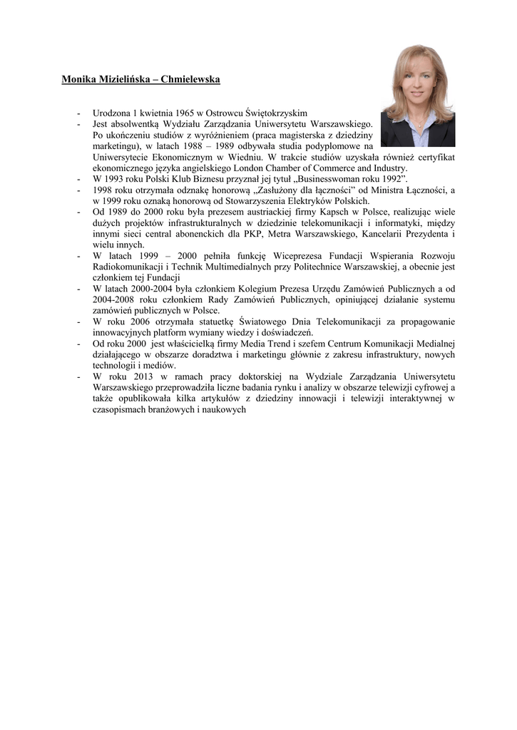 Monika Mizielińska – Chmielewska - - - - - - Urodzona 1 kwietnia 1965 w Ostrowcu Świętokrzyskim Jest absolwentką Wydziału Zarządzania Uniwersytetu Warszawskiego. Po ukończeniu studiów z wyróżnieniem (praca magisterska z dziedziny marketingu), w latach 1988 – 1989 odbywała studia podyplomowe na Uniwersytecie Ekonomicznym w Wiedniu. W trakcie studiów uzyskała również certyfikat ekonomicznego języka angielskiego London Chamber of Commerce and Industry. W 1993 roku Polski Klub Biznesu przyznał jej tytuł „Businesswoman roku 1992”. 1998 roku otrzymała odznakę honorową „Zasłużony dla łączności” od Ministra Łączności, a w 1999 roku oznaką honorową od Stowarzyszenia Elektryków Polskich. Od 1989 do 2000 roku była prezesem austriackiej firmy Kapsch w Polsce, realizując wiele dużych projektów infrastrukturalnych w dziedzinie telekomunikacji i informatyki, między innymi sieci central abonenckich dla PKP, Metra Warszawskiego, Kancelarii Prezydenta i wielu innych. W latach 1999 – 2000 pełniła funkcję Wiceprezesa Fundacji Wspierania Rozwoju Radiokomunikacji i Technik Multimedialnych przy Politechnice Warszawskiej, a obecnie jest członkiem tej Fundacji W latach 2000-2004 była członkiem Kolegium Prezesa Urzędu Zamówień Publicznych a od 2004-2008 roku członkiem Rady Zamówień Publicznych, opiniującej działanie systemu zamówień publicznych w Polsce. W roku 2006 otrzymała statuetkę Światowego Dnia Telekomunikacji za propagowanie innowacyjnych platform wymiany wiedzy i doświadczeń. Od roku 2000 jest właścicielką firmy Media Trend i szefem Centrum Komunikacji Medialnej działającego w obszarze doradztwa i marketingu głównie z zakresu infrastruktury, nowych technologii i mediów. W roku 2013 w ramach pracy doktorskiej na Wydziale Zarządzania Uniwersytetu Warszawskiego przeprowadziła liczne badania rynku i analizy w obszarze telewizji cyfrowej a także opublikowała kilka artykułów z dziedziny innowacji i telewizji interaktywnej w czasopismach branżowych i naukowych