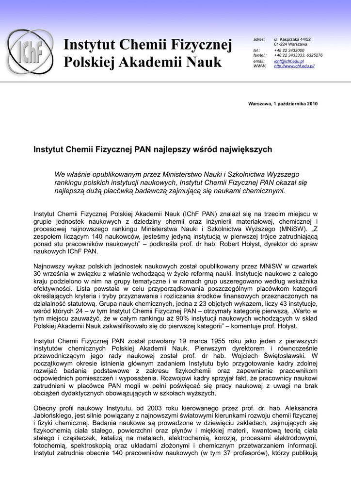 Instytut Chemii Fizycznej Polskiej Akademii Nauk adres: tel.: fax/tel.: email: WWW: ul. Kasprzaka 44/52 01-224 Warszawa +48 22 3432000 +48 22 3433333, 6325276 [email protected] http://www.ichf.edu.pl/ Warszawa, 1 października 2010 Instytut Chemii Fizycznej PAN najlepszy wśród największych We właśnie opublikowanym przez Ministerstwo Nauki i Szkolnictwa Wyższego rankingu polskich instytucji naukowych, Instytut Chemii Fizycznej PAN okazał się najlepszą dużą placówką badawczą zajmującą się naukami chemicznymi. Instytut Chemii Fizycznej Polskiej Akademii Nauk (IChF PAN) znalazł się na trzecim miejscu w grupie jednostek naukowych z dziedziny chemii oraz inżynierii materiałowej, chemicznej i procesowej najnowszego rankingu Ministerstwa Nauki i Szkolnictwa Wyższego (MNiSW). „Z zespołem liczącym 140 naukowców, jesteśmy jedyną instytucją w pierwszej trójce zatrudniającą ponad stu pracowników naukowych” – podkreśla prof. dr hab. Robert Hołyst, dyrektor do spraw naukowych IChF PAN. Najnowszy wykaz polskich jednostek naukowych został opublikowany przez MNiSW w czwartek 30 września w związku z właśnie wchodzącą w życie reformą nauki. Instytucje naukowe z całego kraju podzielono w nim na grupy tematyczne i w ramach grup uszeregowano według wskaźnika efektywności. Lista powstała w celu przyporządkowania poszczególnym placówkom kategorii określających kryteria i tryby przyznawania i rozliczania środków finansowych przeznaczonych na działalność statutową. Grupa nauk chemicznych, jedna z 23 objętych wykazem, liczy 43 instytucje, wśród których 24 – w tym Instytut Chemii Fizycznej PAN – otrzymały kategorię pierwszą. „Warto w tym miejscu zauważyć, że w całym rankingu aż 90% instytucji naukowych wchodzących w skład Polskiej Akademii Nauk zakwalifikowało się do pierwszej kategorii” – komentuje prof. Hołyst. Instytut Chemii Fizycznej PAN został powołany 19 marca 1955 roku jako jeden z pierwszych instytutów chemicznych Polskiej Akademii Nauk. Pierwszym dyrektorem i równocześnie przewodniczącym jego rady naukowej został prof. dr hab. Wojciech Świętosławski. W początkowym okresie istnienia głównym zadaniem Instytutu było przygotowanie kadry zdolnej rozwijać badania podstawowe z zakresu fizykochemii oraz zapewnienie pracownikom odpowiednich pomieszczeń i wyposażenia. Rozwojowi kadry sprzyjał fakt, że pracownicy naukowi zatrudnieni w placówce PAN mogli w pełni poświęcać się pracy naukowej z uwagi na brak obciążeń dydaktycznych obowiązujących w szkołach wyższych. Obecny profil naukowy Instytutu, od 2003 roku kierowanego przez prof. dr. hab. Aleksandra Jabłońskiego, jest silnie powiązany z najnowszymi światowymi kierunkami rozwoju chemii fizycznej i fizyki chemicznej. Badania naukowe są prowadzone w dziewięciu zakładach, zajmujących się fizykochemią ciała stałego, powierzchni oraz płynów i miękkiej materii, kwantową teorią ciała stałego i cząsteczek, katalizą na metalach, elektrochemią, korozją, procesami elektrodowymi, fotochemią, spektroskopią oraz układami złożonymi i chemicznym przetwarzaniem informacji. Instytut zatrudnia obecnie 140 pracowników naukowych (w tym 37 profesorów), którzy publikują około 300 oryginalnych prac badawczych rocznie. Działający w ramach Instytutu Zakład Doświadczalny CHEMIPAN wdraża, produkuje i komercjalizuje specjalistyczne związki chemiczne, stosowane m.in. w rolnictwie i farmacji. Instytut Chemii Fizycznej PAN uczestniczy w wielu projektach badawczych realizowanych we współpracy z czołowymi instytucjami naukowymi kraju i świata. Jednym z takich przedsięwzięć jest grant „Kwantowe nanostruktury półprzewodnikowe do zastosowań w biologii i medycynie” wartości ponad 73 mln zł, którego celem jest zbudowanie mikroukładu półprzewodnikowego zdolnego wykrywać przeciwciała we krwi. Głównymi uczestnikami grantu oprócz IChF są: pełniący rolę koordynatora projektu Instytut Fizyki PAN oraz Instytut Wysokich Ciśnień PAN – instytucje, które w rankingu Ministerstwa Nauki i Szkolnictwa Wyższego zajęły odpowiednio piątą i pierwszą pozycję w grupie nauk fizycznych. W przyszłości działalność Instytutu będzie się koncentrowała wokół chemii inspirowanej biologią, nanotechnologii inspirowanych chemią oraz wdrożeń z wykorzystaniem spółek wysokich technologii. O najnowszych osiągnięciach naukowych Instytutu informuje serwis prasowy dostępny pod adresem http://www.ichf.edu.pl/press/ Instytut Chemii Fizycznej Polskiej Akademii Nauk (http://www.ichf.edu.pl/) został powołany w 1955 roku jako jeden z pierwszych instytutów chemicznych PAN. Profil naukowy Instytutu jest silnie powiązany z najnowszymi światowymi kierunkami rozwoju chemii fizycznej i fizyki chemicznej. Badania naukowe są prowadzone w 9 zakładach naukowych. Działający w ramach Instytutu Zakład Doświadczalny CHEMIPAN wdraża, produkuje i komercjalizuje specjalistyczne związki chemiczne do zastosowań m.in. w rolnictwie i farmacji. Instytut publikuje około 300 oryginalnych prac badawczych rocznie. KONTAKTY DO NAUKOWCÓW: prof. dr hab. Robert Hołyst Instytut Chemii Fizycznej Polskiej Akademii Nauk tel. +48 22 3433123 email: [email protected] POWIĄZANE STRONY WWW: http://www.ichf.edu.pl/ Strona Instytutu Chemii Fizycznej Polskiej Akademii Nauk. http://www.ichf.edu.pl/press/ Serwis prasowy Instytutu Chemii Fizycznej PAN.