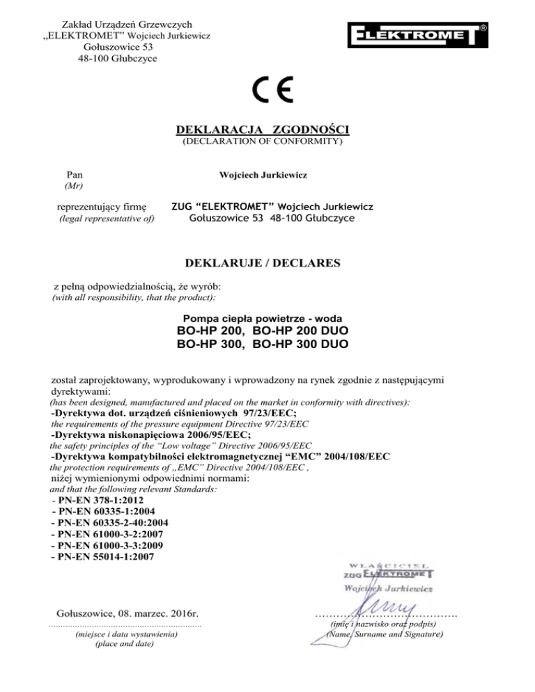 Zakład Urządzeń Grzewczych „ELEKTROMET” Wojciech Jurkiewicz Gołuszowice 53 48-100 Głubczyce DEKLARACJA ZGODNOŚCI (DECLARATION OF CONFORMITY) Pan Wojciech Jurkiewicz (Mr) reprezentujący firmę (legal representative of) ZUG “ELEKTROMET” Wojciech Jurkiewicz Gołuszowice 53 48-100 Głubczyce DEKLARUJE / DECLARES z pełną odpowiedzialnością, że wyrób: (with all responsibility, that the product): Pompa ciepła powietrze - woda BO-HP 200, BO-HP 200 DUO BO-HP 300, BO-HP 300 DUO został zaprojektowany, wyprodukowany i wprowadzony na rynek zgodnie z następującymi dyrektywami: (has been designed, manufactured and placed on the market in conformity with directives): -Dyrektywa dot. urządzeń ciśnieniowych 97/23/EEC; the requirements of the pressure equipment Directive 97/23/EEC -Dyrektywa niskonapięciowa 2006/95/EEC; the safety principles of the “Low voltage” Directive 2006/95/EEC -Dyrektywa kompatybilności elektromagnetycznej “EMC” 2004/108/EEC the protection requirements of „EMC” Directive 2004/108/EEC , niżej wymienionymi odpowiednimi normami: and that the following relevant Standards: - PN-EN 378-1:2012 - PN-EN 60335-1:2004 - PN-EN 60335-2-40:2004 - PN-EN 61000-3-2:2007 - PN-EN 61000-3-3:2009 - PN-EN 55014-1:2007 Gołuszowice, 08. marzec. 2016r. ………………………………………………………. (miejsce i data wystawienia) (place and date) …………………………………. (imię i nazwisko oraz podpis) (Name, Surname and Signature)