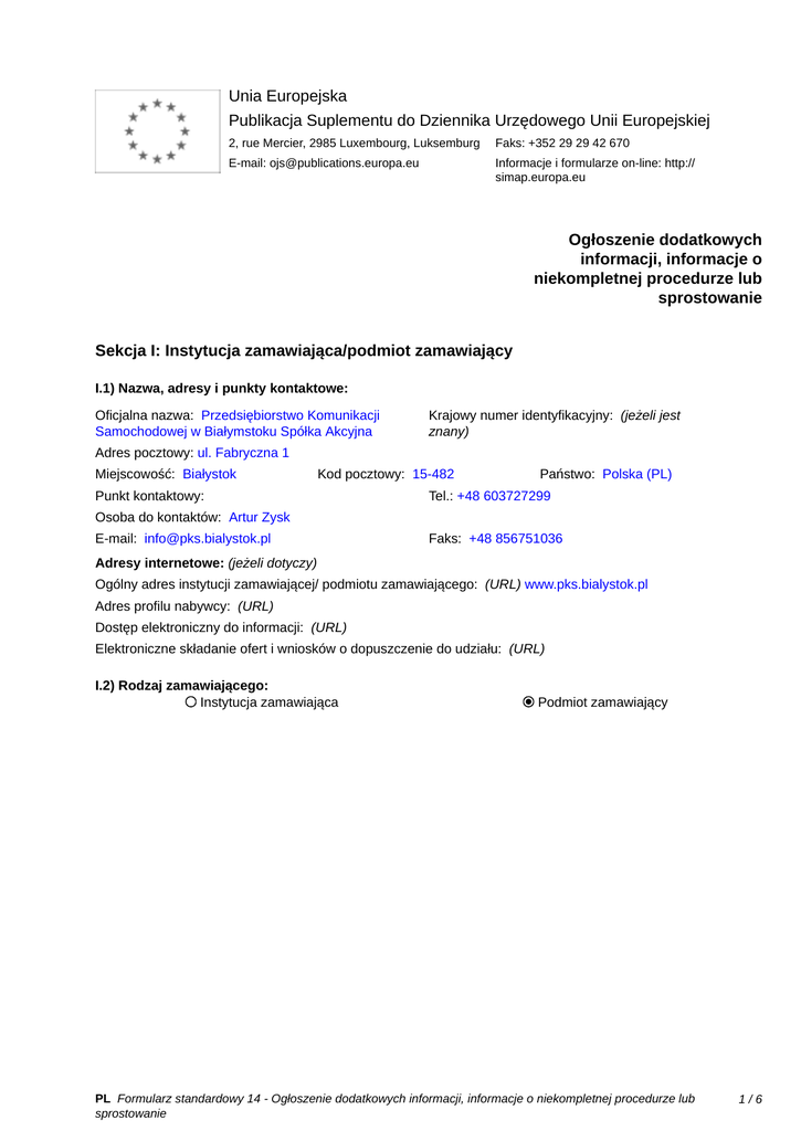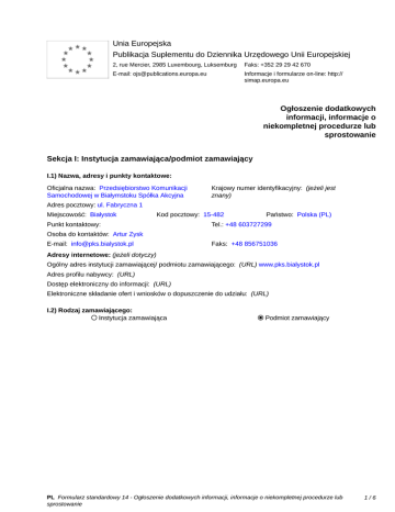 Unia Europejska Publikacja Suplementu do Dziennika Urzędowego Unii Europejskiej 2, rue Mercier, 2985 Luxembourg, Luksemburg Faks: +352 29 29 42 670 E-mail: [email protected] Informacje i formularze on-line: http:// simap.europa.eu Ogłoszenie dodatkowych informacji, informacje o niekompletnej procedurze lub sprostowanie Sekcja I: Instytucja zamawiająca/podmiot zamawiający I.1) Nazwa, adresy i punkty kontaktowe: Oficjalna nazwa: Przedsiębiorstwo Komunikacji Samochodowej w Białymstoku Spółka Akcyjna Krajowy numer identyfikacyjny: (jeżeli jest znany) _____ Adres pocztowy: ul. Fabryczna 1 Miejscowość: Białystok Kod pocztowy: 15-482 Punkt kontaktowy: _____ Państwo: Polska (PL) Tel.: +48 603727299 Osoba do kontaktów: Artur Zysk E-mail: [email protected] Faks: +48 856751036 Adresy internetowe: (jeżeli dotyczy) Ogólny adres instytucji zamawiającej/ podmiotu zamawiającego: (URL) www.pks.bialystok.pl Adres profilu nabywcy: (URL) _____ Dostęp elektroniczny do informacji: (URL) _____ Elektroniczne składanie ofert i wniosków o dopuszczenie do udziału: (URL) _____ I.2) Rodzaj zamawiającego: Instytucja zamawiająca Podmiot zamawiający PL Formularz standardowy 14 - Ogłoszenie dodatkowych informacji, informacje o niekompletnej procedurze lub sprostowanie 1/6 Sekcja II: Przedmiot zamówienia II.1.1) Nazwa nadana zamówieniu: LEASING OPERACYJNY 8 AUTOBUSÓW II.1.2) Krótki opis zamówienia lub zakupu: (podano w pierwotnym ogłoszeniu) Przedmiotem zamówienia jest dostawa w rozumieniu ustawy Prawo zamówień publicznych, tj. leasing operacyjny przez okres 5 lat licząc od dnia wydania pojazdu zamawiającemu, 8 nowych (zgodnie z art. 2 pkt 10 lit. a) ustawy z dnia 11 marca 2004 r. o podatku od towarów i usług - Dz.U.2011.177.1054 j.t., ze zm) autobusów tej samej marki posiadających, co najmniej 40 miejsc siedzących dla podróżnych (z wyłączeniem kierowcy). II.1.3) Wspólny Słownik Zamówień (CPV) Główny przedmiot Dodatkowe przedmioty Słownik główny 66114000 34121100 Słownik uzupełniający (jeżeli dotyczy) PL Formularz standardowy 14 - Ogłoszenie dodatkowych informacji, informacje o niekompletnej procedurze lub sprostowanie 2/6 Sekcja IV: Procedura IV.1)Rodzaj procedury (podano w pierwotnym ogłoszeniu) Otwarta Ograniczona Ograniczona przyspieszona Negocjacyjna Negocjacyjna przyspieszona Dialog konkurencyjny Negocjacyjna z uprzednim ogłoszeniem Negocjacyjna bez uprzedniego ogłoszenia Negocjacyjna z publikacją ogłoszenia o zamówieniu Negocjacyjna bez publikacji ogłoszenia o zamówieniu Udzielenie zamówienia bez uprzedniej publikacji ogłoszenia o zamówieniu w Dzienniku Urzędowym Unii Europejskiej IV.2)Informacje administracyjne IV.2.1)Numer referencyjny: (podano w pierwotnym ogłoszeniu) PKS.SA-DA/ZP/14/03/2016/1 IV.2.2)Dane referencyjne ogłoszenia w przypadku ogłoszeń przesłanych drogą elektroniczną: Pierwotne ogłoszenie przesłane przez eNotices TED eSender Login: ENOTICES_specpzp Dane referencyjne ogłoszenia: 2016-035267 rok i numer dokumentu IV.2.3)Ogłoszenie, którego dotyczy niniejsza publikacja: Numer ogłoszenia w Dz.U.: 2016/S 057-096794 z dnia: 22/03/2016 (dd/mm/rrrr) IV.2.4)Data wysłania pierwotnego ogłoszenia: 18/03/2016 (dd/mm/rrrr) PL Formularz standardowy 14 - Ogłoszenie dodatkowych informacji, informacje o niekompletnej procedurze lub sprostowanie 3/6 Sekcja VI: Informacje uzupełniające VI.1) Ogłoszenie dotyczy: Procedury niepełnej Sprostowania Informacji dodatkowych VI.2) Informacje na temat niepełnej procedury udzielenia zamówienia: Postępowanie o udzielenie zamówienia zostało przerwane Postępowanie o udzielenie zamówienia uznano za nieskuteczne Zamówienia nie udzielono Zamówienie może być przedmiotem ponownej publikacji VI.3) Informacje do poprawienia lub dodania : VI.3.1) Zmiana oryginalnej informacji podanej przez instytucję zamawiającą Publikacja w witrynie TED niezgodna z oryginalną informacją, przekazaną przez instytucję zamawiającą Oba przypadki VI.3.2) W ogłoszeniu pierwotnym W odpowiedniej dokumentacji przetargowej (więcej informacji w odpowiedniej dokumentacji przetargowej) W obu przypadkach (więcej informacji w odpowiedniej dokumentacji przetargowej) VI.3.3) Tekst, który należy poprawić w pierwotnym ogłoszeniu Miejsce, w którym znajduje się Zamiast: zmieniany tekst: d) zamawiający będzie mógł pkt 16 lit. d) OWU w rozdziale XVI dochodzić roszczeń z tytułu SIWZ gwarancji za wady także po upływie terminu, o którym mowa w lit. b), jeżeli reklamował wadę przed upływem tego terminu. Miejsce, w którym znajduje się zmieniany tekst: załącznik nr 2 do SIWZ Zamiast: dostawca autobusu musi posiadać na terenie Polski minimum 5 stacji serwisowych, w tym 1 stację w odległości do 30 km od zamawiającego Miejsce, w którym znajduje się zmieniany tekst: załącznik nr 2 do SIWZ Zamiast: zbiornik paliwa o pojemności 120 – 250 dm3 Miejsce, w którym znajduje się zmieniany tekst: załącznik nr 7 do SIWZ Zamiast: d) zamawiający będzie mógł dochodzić roszczeń z tytułu gwarancji za wady także po upływie terminu, o którym mowa w lit. b), jeżeli reklamował wadę przed upływem tego terminu. Powinno być: d) zamawiający będzie mógł dochodzić roszczeń z tytułu gwarancji za wady także po upływie terminu, o którym mowa w lit. b), jeżeli reklamował wadę przed upływem tego terminu i wady nie usunięto. Powinno być: autobusy zaoferowanej marki (typu, modelu) muszą posiadać na terenie Polski minimum 5 stacji serwisowych wykonujących czynności obsługi gwarancyjnej i pogwarancyjnej, w tym 1 stację w odległości do 30 km od zamawiającego Powinno być: zbiornik paliwa o pojemności min. 120 dm3 Powinno być: d) zamawiający będzie mógł dochodzić roszczeń z tytułu gwarancji za wady także po upływie terminu, o którym mowa w lit. b), jeżeli reklamował wadę przed upływem tego terminu i wady nie usunięto. PL Formularz standardowy 14 - Ogłoszenie dodatk