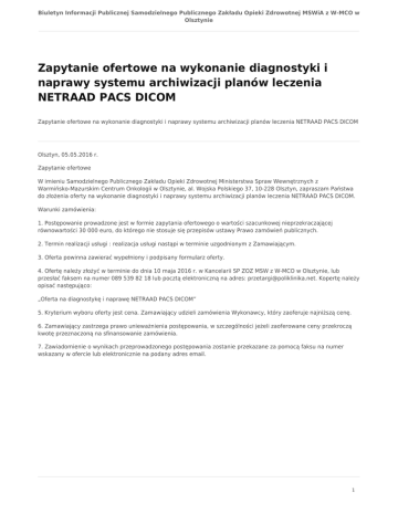 Biuletyn Informacji Publicznej Samodzielnego Publicznego Zakładu Opieki Zdrowotnej MSWiA z W-MCO w Olsztynie Zapytanie ofertowe na wykonanie diagnostyki i naprawy systemu archiwizacji planów leczenia NETRAAD PACS DICOM Zapytanie ofertowe na wykonanie diagnostyki i naprawy systemu archiwizacji planów leczenia NETRAAD PACS DICOM Olsztyn, 05.05.2016 r. Zapytanie ofertowe W imieniu Samodzielnego Publicznego Zakładu Opieki Zdrowotnej Ministerstwa Spraw Wewnętrznych z Warmińsko-Mazurskim Centrum Onkologii w Olsztynie, al. Wojska Polskiego 37, 10-228 Olsztyn, zapraszam Państwa do złożenia oferty na wykonanie diagnostyki i naprawy systemu archiwizacji planów leczenia NETRAAD PACS DICOM. Warunki zamówienia: 1. Postępowanie prowadzone jest w formie zapytania ofertowego o wartości szacunkowej nieprzekraczającej równowartości 30 000 euro, do którego nie stosuje się przepisów ustawy Prawo zamówień publicznych. 2. Termin realizacji usługi : realizacja usługi nastąpi w terminie uzgodnionym z Zamawiającym. 3. Oferta powinna zawierać wypełniony i podpisany formularz oferty. 4. Ofertę należy złożyć w terminie do dnia 10 maja 2016 r. w Kancelarii SP ZOZ MSW z W-MCO w Olsztynie, lub przesłać faksem na numer 089 539 82 18 lub pocztą elektroniczną na adres: [email protected]. Kopertę należy opisać następująco: „Oferta na diagnostykę i naprawę NETRAAD PACS DICOM” 5. Kryterium wyboru oferty jest cena. Zamawiający udzieli zamówienia Wykonawcy, który zaoferuje najniższą cenę. 6. Zamawiający zastrzega prawo unieważnienia postępowania, w szczególności jeżeli zaoferowane ceny przekroczą kwotę przeznaczoną na sfinansowanie zamówienia. 7. Zawiadomienie o wynikach przeprowadzonego postępowania zostanie przekazane za pomocą faksu na numer wskazany w ofercie lub elektronicznie na podany adres email. 1