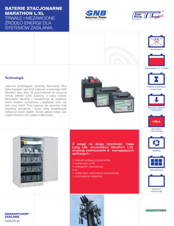 Baterie stacjonarne Marathon L/XL Trwałe i niezawodne źródło energii dla systemów zasilania. Bezobsługowe Zakres pojemn. 14 - 575 [Ah] Technologia Całkowicie bezobsługowe, zamknięte Akumulatory VRLA (Valve Regulated Lead Acid) wykonane w technologii AGM (Absorbed Glass Mat). W przeciwieństwie do klasycznej metody, elektrolit został uwięziony w macie szklanej. Akumulatory Marathon L charakteryzują się wyjątkowo niskimi kosztami uruchomienia i eksploatacji przez cały okres pracy baterii. Ścisła separacja płyt powoduje niską rezystancję wewnętrzną i bardzo dobrą charakterystykę rozładowań dużym prądem. Wysoka gęstość energii czyni z baterii Marathon L/XL wydajne źródło energii. Trwałość projektowana ponad 12 lat+ Bezpieczne głębokie rozładowanie VRLA Akumulatory z rekombinacją Z uwagi na długą żywotność: klasa Long Life, akumulatory Marathon L/XL znajdują zastosowanie w wymagających aplikacjach : • telekomunikacji stacjonarnej, • systemach UPS, • energetyki zawodowej, oraz: • systemach automatyki budynkowej, • automatyce kolejowej. Recykling Płyta pastowana Ogniwa 2V i bloki 6,12 [V] Baterie stacjonarne Marathon L/XL Trwałe i niezawodne źródło energii dla systemów zasilania. Marathon L/XL - przekrój akumulatora Marathon L / XL - Specyfikacja: • Akumulatory Marathon L są dedykowane systemom o średnich i krótkich czasach rozładowania i wysokim oczekiwaniom co do niezawodności. • Technologia wykonania : AGM • Całkowicie bezobsługowe (brak dolewania wody) przez cały okres eksploatacji. • Zakres pojemności od 14 do 575 Ah • Żywotność projektowana: ponad 12 lat do 80% Cn przy 20˚C • Akumulator zbudowany z płyt ujemnych pastowanych • Opcjonalnie materiał obudowy UL 94 V-0 (niepalny). • Pastowana płyta ze stopem wapniowym • Ekstremalnie niskie gazowanie (99%) dzięki wewnętrznej rekombinacji gazów. • Bezpieczne głębokie rozładowanie zgodnie z normą DIN 43539 T5. • Bezproblemowy transport gotowych do pracy bloków. Akumulatory Marathon L/XL mogą być bezpiecznie transportowane powietrzem, koleją lub drogą. (wg.IATA, DGR clause A 67) • Recykling: Akumulatory ołowiowe są wartościowym surowcem. Przetwarzanie powtórnie akumulatorów Marathon L/XL przekracza 90%. • Zgodność z normą europejską IEC 60896-21/22 oraz BS 6290-4. • Produkowane w Europie Marathon L / XL Zakres pojemności C10 do 1,80V 14 - 575 [Ah] Trwałość projektowana do 80%Cn przy 20˚C ponad 12 lat+ Samorozładowanie na dzień dla 20˚C < 0,12 [%] Napięcie ładowania buforowego przy 20˚C 2,27 [V/ogniwo] Napięcie ładowania dla pracy cyklicznej przy 20˚C 2,30 [V/ogniwo] GNB® Industrial Power jest częścią Exide Technologies® odpowidzialną za rozwój, produkcję i logistykę akumulatorów przemysłowych. Szczegóły znajdą Państwo na stronie korporacyjnej www.exide.com Baterie stacjonarne Marathon L/XL Trwałe i niezawodne źródło energii dla systemów zasilania. Typ Napięcie Poj. znaznamion. mion. *) [V] C10 [Ah] Pojemność Wewnętrzna Waga znamion. **) rezystancja [kg] C1[Ah] [mΩ] - IEC Długość [mm] Szer. [mm] Max. wys. [mm] Rodzaj wyprowadzenia L12V15 12 14 9,90 14,00 6,5 181 76 167 M-M6 L12V24 12 23,5 15,8 10,00 9,5 168 127 174 M-M6 L12V32 12 32 21,4 8,00 13,5 198 168 175 M-M6 L6V110 6 110 75,5 1,60 23,0 272 166 190 M-M8 L2V220 2 220 150 0,35 16,0 208 135 282 M-M12 L2V270 2 270 183 0,28 18,3 208 135 282 M-M12 L2V320 2 320 225 0,22 24,2 208 201 282 M-2xM12 L2V375 2 375 262 0,18 26,5 208 201 282 M-2xM12 L2V425 2 425 291 0,15 28,8 208 201 282 M-2xM12 L2V470 2 470 324 0,14 32,6 208 270 282 M-2xM12 L2V520 2 520 357 0,13 35,0 208 270 282 M-2xM12 L2V575 2 575 394 0,11 37,3 208 270 282 M-2xM12 XL6V180 6 179 120 1,6 30,0 309 172 241 F-M6 XL12V50 12 50,4 32,7 9,2 19,5 220 172 235 F-M6 XL12V70 12 66,6 45,6 9,0 24,6 262 172 239 F-M6 XL12V85 12 85,7 57,5 5,7 29,3 309 172 239 F-M6 Wymagania dotyczące składowania, transportu oraz eksploatacji akumulatorów znajdują się w instrukcji eksploatacji akumulatorów Marathon L/XL *) C10 do napięcia 1,80V/ogniwo w temp. 20˚C, **) C1 do napięcia 1,60V/ogniwo w temp. 20˚C Szczegółowe dane techniczne są dostępne pod adresem : www.etc.pl, www.exide.com Wyprowadzenia i momenty dokręcenia śrub: Projektowanie Instalacje Remonty i modernizacja Przeglądy utylizacja serwis ETC plus sp. z o.o. ul. Drukarska 14 27-400 Ostrowiec Świętokrzyski tel. +48 41 26 36 811 fax:+48 41 26 54 443 kom.+48 604 49 79 92 e-mail:[email protected]