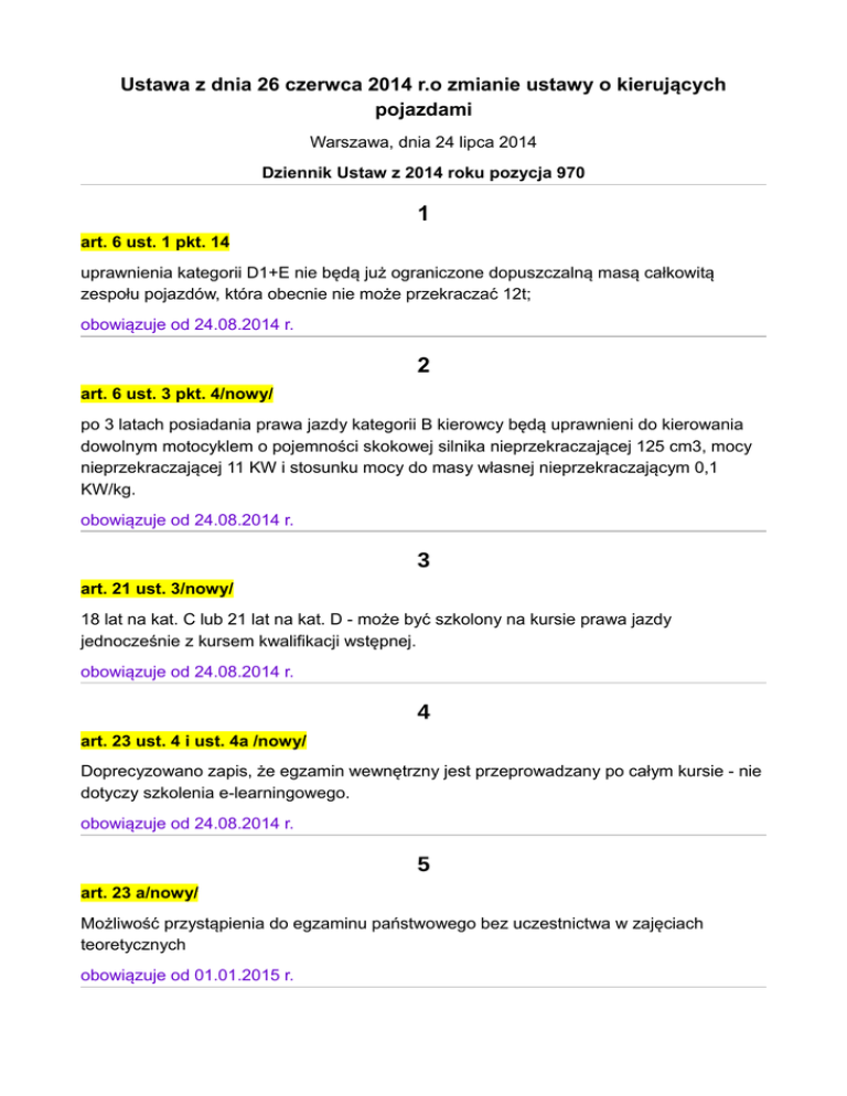 Ustawa z dnia 26 czerwca 2014 r.o zmianie ustawy o kierujących pojazdami Warszawa, dnia 24 lipca 2014 Dziennik Ustaw z 2014 roku pozycja 970 1 art. 6 ust. 1 pkt. 14 uprawnienia kategorii D1+E nie będą już ograniczone dopuszczalną masą całkowitą zespołu pojazdów, która obecnie nie może przekraczać 12t; obowiązuje od 24.08.2014 r. 2 art. 6 ust. 3 pkt. 4/nowy/ po 3 latach posiadania prawa jazdy kategorii B kierowcy będą uprawnieni do kierowania dowolnym motocyklem o pojemności skokowej silnika nieprzekraczającej 125 cm3, mocy nieprzekraczającej 11 KW i stosunku mocy do masy własnej nieprzekraczającym 0,1 KW/kg. obowiązuje od 24.08.2014 r. 3 art. 21 ust. 3/nowy/ 18 lat na kat. C lub 21 lat na kat. D - może być szkolony na kursie prawa jazdy jednocześnie z kursem kwalifikacji wstępnej. obowiązuje od 24.08.2014 r. 4 art. 23 ust. 4 i ust. 4a /nowy/ Doprecyzowano zapis, że egzamin wewnętrzny jest przeprowadzany po całym kursie - nie dotyczy szkolenia e-learningowego. obowiązuje od 24.08.2014 r. 5 art. 23 a/nowy/ Możliwość przystąpienia do egzaminu państwowego bez uczestnictwa w zajęciach teoretycznych obowiązuje od 01.01.2015 r. 6 art. 24 pkt. 1 lit.d posiadającym adnotację w dokumencie stwierdzającym dopuszczenie do ruchu /było w dowodzie rejestracyjnym/ o spelnieniu wymagań, o których mowa w lit. a - c, dokonywaną przez odpowiedni organ, na podstawie pozytywnego wyniku badania technicznego przeprowadzonego przez stację kontroli pojazdów, o której mowa w art. 83 ustawy z dnia 20 czerwca 1997 r. obowiązuje od 24.08.2014 r. 7 art. 25 ust. 2 pkt. 14 Instruktor, niezależnie od dokumentów wymaganych od kierującego pojazdem, jest obowiązany posiadaći okazywać na żądanie organów kontroli ruchu drogowego, właściwego starosty sprawującego nadzór nad szkoleniem,a także osoby ubiegającej się ouzyskanie uprawnienia do kierowania pojazdem legitymację instruktora. obowiązuje od 24.08.2014 r. 8 art. 26 ust. 5 pkt. 1 /nie ma „zatrudniony”/ instruktor lub będący instruktorem przedsiębiorca prowadząca ośrodek szkolenia kierowców - w zakresie,o którym mowa w art. 23 ust. 2 pkt 1 i 2 – odpowiednio do posiadanych uprawnień; obowiązuje od 24.08.2014 r. 9 art. 26 ust. 7 Zajęcia, o których mowa w art. 23 ust. 3, są prowadzone pod nadzorem instruktora lubwykładowcy zatrudnionegow ośrodku szkolenia kierowcow lub związanego z ośrodkiem szkolenia kierowców umową zlecenia,umową o dzieło lub innym stosunkiem prawnym o podobnym charakterze; obowiązuje od 24.08.2014 r. 10 art. 27 ust. 1 pkt. 1 Kierownik OSK będzie musiał przedstawić staroście właściwemu ze względu na miejsce prowadzenia ośrodka szkolenia kierowców, najpóźniej w następnym dniu roboczym od dnia rozpoczęcia kursu, listę uczestników kursu oraz informację o terminie, czasie i miejscu rozpoczęcia pierwszych zajęć teoretycznych w ramach danego kursu a także prowadzić harmonogram zajęć teoretycznych dla każdego kursu, który zawiera terminy, miejsce prowadzenia zajęć teoretycznych oraz godziny rozpoczęcia i zakończenia poszczególnych zajęć; zniżka to obowiązki zgłaszania egzaminów teoretycznych /ust.1 pkt. 3/ i danych osób, które ukończyły kurs /ust.1 pkt. 4/; obowiązuje od 24.08.2014 r. 11 art. 27 ust. 6 Starosta, o którym mowa w ust. 1 pkt 1, może umożliwić przekazywanie informacji orazdanych, o których mowa w ust. 1 pkt 1 oraz ust. 2 pkt 1, w formie elektronicznej z wykorzystaniem bezpiecznego podpisu elektronicznego lub podpisu stanowiącego podanie w postaci elektronicznej danych: imienia i nazwiska kierownika ośrodka, potwierdzonego profilem zaufanym e PUAP, zgodnie z ustawą z dnia 17 lutego 2005 r. o informatyzacji dzialalności podmiotów realizujących zadania publiczne. obowiązuje od 24.08.2014 r. 12 art. 31 Wprowadzenie moźliwości uzyskania zezwolenia na super OSK w zakresie danej kategorii. Ośrodek taki będzie mógł prowadzić kursy, dla kandydatów na instruktorów z zakresu kat.na którą ma zezwolenie obowiązuje od 24.08.2014 r. 13 Art. 32ust. 3 pkt. 2 lit. c Likwiduje się zapis „trzydniowe" warsztaty będzie można zrealizować warsztaty np. w dwóch dniach. obowiązuje od 24.08.2014 r. 14 art. 33 ust. 3 a /nowy/ Uporządkowanazostanie kwestia uprawnień instruktorskich, starosta – zgodnie z nowymi przepisami, wpisując osobę do ewidencji instruktorów w zakresie prawa jazdy kategorii: 1) A - wpisuje z urzędu uprawnienia do szkolenia odpowiednio w zakresie prawa jazdy kategorii AM, A1 i A2; 2) B, C lub D - wpisuje z urzędu uprawnienia do szkolenia odpowiednio w zakresie prawa jazdy kategorii B1, C1 lub D1; 3) C+E lub D+E - wpisuje z urzędu uprawnienia do szkolenia w zakresie prawa jazdy kategorii B+E oraz odpowiednio w zakresie prawa jazdy kategorii C1+E lub D1+E; 4) B+E, C+E lub D+E - wpisuje z urzędu uprawnienia do szkolenia w zakresie prawajazdy kategorii T; 5) C+E posiadającą uprawnienia do szkolenia w zakresie prawa jazdy kategorii D oraz prawo jazdy kategorii D+E - wpisuje z urzędu uprawnienia do szkolenia w zakresie prawa jazdy kategorii D+E; W przypadku wykładowców będzie to wyglądało analogicznie; obowiązuje od 24.08.2014 r. 15 art. 35 ust. 6 Warsztaty mogą prowadzić super OSK, które mają wpis na kat. ABCD. Warsztaty mogą prowadzić WORD-y. WORD-y mogą organizować kursy dla kandydatów na instruktorów. Wynik egzaminu z teorii będzie ważny bezterminowo dla tych którzy go zaliczyli po 24 sierpnia 2014 r. obowiązuje od 24.08.2014 r. 16 art. 37 ust.1 a Obowiązek, o którym mowa w ust.1 pkt 2 i 3, i /chodzi o odbycie warsztatów dla instruktorów/ niedotyczy osoby, która uzyskała po raz pierwszyuprawnienia instruktora w tym samym roku, w którym byłaby obowiązana uczestniczyć w warsztatach doskonalenia zawodowego. obowiązuje od 24.08.2014 r. 17 art. 38 a /nowy/ W przypadku instruktora lub wykładowcy, posiadającego uprawnienia egzaminatora, obowiązek odbycia wars