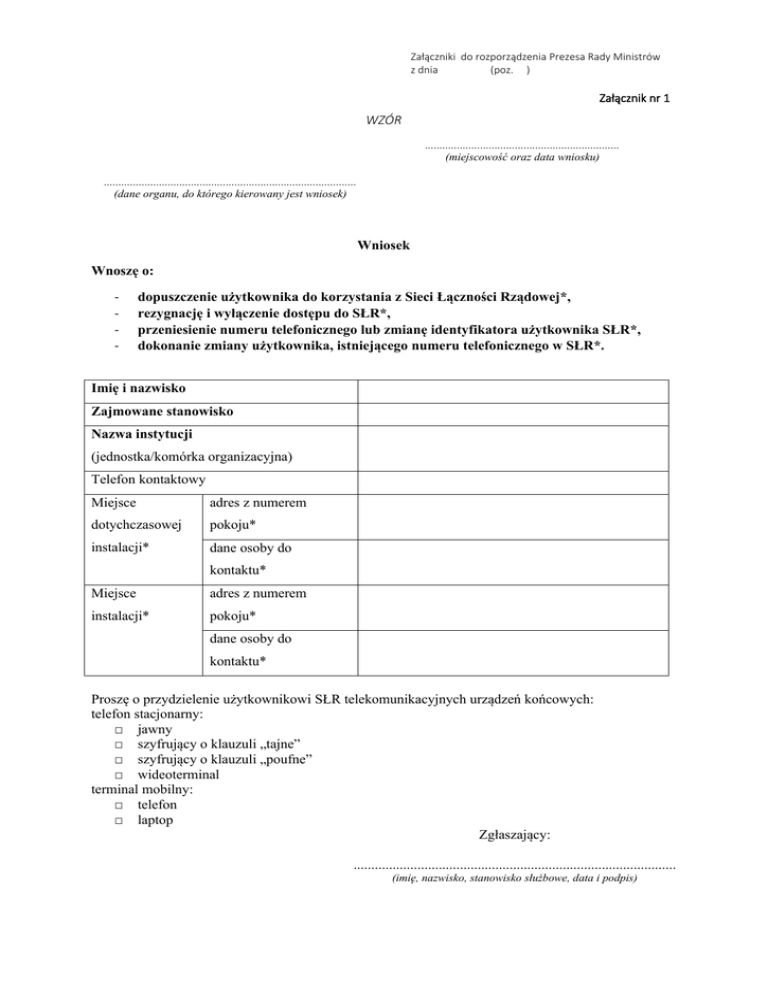Załączniki do rozporządzenia Prezesa Rady Ministrów z dnia (poz. ) Załącznik nr 1 WZÓR ................................................................... (miejscowość oraz data wniosku) ....................................................................................... (dane organu, do którego kierowany jest wniosek) Wniosek Wnoszę o: - dopuszczenie użytkownika do korzystania z Sieci Łączności Rządowej*, rezygnację i wyłączenie dostępu do SŁR*, przeniesienie numeru telefonicznego lub zmianę identyfikatora użytkownika SŁR*, dokonanie zmiany użytkownika, istniejącego numeru telefonicznego w SŁR*. Imię i nazwisko Zajmowane stanowisko Nazwa instytucji (jednostka/komórka organizacyjna) Telefon kontaktowy Miejsce adres z numerem dotychczasowej pokoju* instalacji* dane osoby do kontaktu* Miejsce adres z numerem instalacji* pokoju* dane osoby do kontaktu* Proszę o przydzielenie użytkownikowi SŁR telekomunikacyjnych urządzeń końcowych: telefon stacjonarny: □ jawny □ szyfrujący o klauzuli „tajne” □ szyfrujący o klauzuli „poufne” □ wideoterminal terminal mobilny: □ telefon □ laptop Zgłaszający: ........................................................................................... (imię, nazwisko, stanowisko służbowe, data i podpis) Wypełnia administrator SŁR: Przydzielone, deinstalowane, przenoszone* numery telefonów Przydzielone, deinstalowane, przenoszone* identyfikatory Data wpłynięcia wniosku Data instalacji, deinstalacji, przeniesienia, zmiany użytkownika* Imię i nazwisko technika instalującego, deinstalującego, przenoszącego telefon/identyfikator* Data i czytelny podpis administratora SŁR …………………….............................................. (zatwierdził) * Niepotrzebne skreślić. Załącznik nr 2 WZÓR Zgłoszenie realizacji wideokonferencji Zamawiający1): ............................................................................................................................ Data i godzina wideokonferencji: ................................................................................................ Czas trwania: ................................................................................................................................ Uczestnicy2): ....................................................................................................................................................... ....................................................................................................................................................... ....................................................................................................................................................... ....................................................................................................................................................... Archiwizacja wideokonferencji3): tak □ nie □ Sposób zestawiania połączeń3): poprzez administratora SŁR □ poprzez numer telefoniczny wideokonferencji □ Osoba do kontaktów: imię, nazwisko, stanowisko, nr tel., nr faksu: ....................................................................................................................................................... ....................................................................................................................................................... Uwagi o sposobie realizacji: ....................................................................................................................................................... ....................................................................................................................................................... .................................. (data i podpis) Potwierdzenie przyjęcia zgłoszenia przez operatora SŁR: .................................. (data i podpis) ______ 1) 2) 3) Należy wpisać nazwę instytucji. Należy wpisać użytkownika SŁR oraz jego stanowisko służbowe i nazwę instytucji. Należy zaznaczyć właściwy kwadrat.
