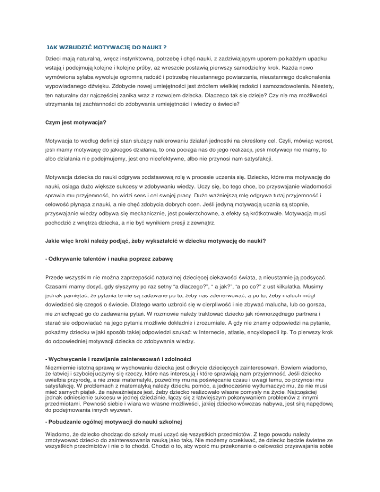 JAK WZBUDZIĆ MOTYWACJĘ DO NAUKI ? Dzieci mają naturalną, wręcz instynktowną, potrzebę i chęć nauki, z zadziwiającym uporem po każdym upadku wstają i podejmują kolejne i kolejne próby, aż wreszcie postawią pierwszy samodzielny krok. Każda nowo wymówiona sylaba wywołuje ogromną radość i potrzebę nieustannego powtarzania, nieustannego doskonalenia wypowiadanego dźwięku. Zdobycie nowej umiejętności jest źródłem wielkiej radości i samozadowolenia. Niestety, ten naturalny dar najczęściej zanika wraz z rozwojem dziecka. Dlaczego tak się dzieje? Czy nie ma możliwości utrzymania tej zachłanności do zdobywania umiejętności i wiedzy o świecie? Czym jest motywacja? Motywacja to według definicji stan służący nakierowaniu działań jednostki na określony cel. Czyli, mówiąc wprost, jeśli mamy motywację do jakiegoś działania, to ona pociąga nas do jego realizacji, jeśli motywacji nie mamy, to albo działania nie podejmujemy, jest ono nieefektywne, albo nie przynosi nam satysfakcji. Motywacja dziecka do nauki odgrywa podstawową rolę w procesie uczenia się. Dziecko, które ma motywację do nauki, osiąga dużo większe sukcesy w zdobywaniu wiedzy. Uczy się, bo tego chce, bo przyswajanie wiadomości sprawia mu przyjemność, bo widzi sens i cel swojej pracy. Dużo ważniejszą rolę odgrywa tutaj przyjemność i celowość płynąca z nauki, a nie chęć zdobycia dobrych ocen. Jeśli jedyną motywacją ucznia są stopnie, przyswajanie wiedzy odbywa się mechanicznie, jest powierzchowne, a efekty są krótkotrwałe. Motywacja musi pochodzić z wnętrza dziecka, a nie być wynikiem presji z zewnątrz. Jakie więc kroki należy podjąć, żeby wykształcić w dziecku motywację do nauki? - Odkrywanie talentów i nauka poprzez zabawę Przede wszystkim nie można zaprzepaścić naturalnej dziecięcej ciekawości świata, a nieustannie ją podsycać. Czasami mamy dosyć, gdy słyszymy po raz setny “a dlaczego?”, “ a jak?”, “a po co?” z ust kilkulatka. Musimy jednak pamiętać, że pytania te nie są zadawane po to, żeby nas zdenerwować, a po to, żeby maluch mógł dowiedzieć się czegoś o świecie. Dlatego warto uzbroić się w cierpliwość i nie zbywać malucha, lub co gorsza, nie zniechęcać go do zadawania pytań. W rozmowie należy traktować dziecko jak równorzędnego partnera i starać sie odpowiadać na jego pytania możliwie dokładnie i zrozumiale. A gdy nie znamy odpowiedzi na pytanie, pokażmy dziecku w jaki sposób takiej odpowiedzi szukać: w Internecie, atlasie, encyklopedii itp. To pierwszy krok do odpowiedniej motywacji dziecka do zdobywania wiedzy. - Wychwycenie i rozwijanie zainteresowań i zdolności Niezmiernie istotną sprawą w wychowaniu dziecka jest odkrycie dziecięcych zainteresowań. Bowiem wiadomo, że łatwiej i szybciej uczymy się rzeczy, które nas interesują i które sprawiają nam przyjemność. Jeśli dziecko uwielbia przyrodę, a nie znosi matematyki, pozwólmy mu na poświęcanie czasu i uwagi temu, co przynosi mu satysfakcję. W problemach z matematyką należy dziecku pomóc, a jednocześnie wytłumaczyć mu, że nie musi mieć samych piątek, że najważniejsze jest, żeby dziecko realizowało własne pomysły na życie. Najczęściej jednak odniesienie sukcesu w jednej dziedzinie, łączy się z łatwiejszym pokonywaniem problemów z innymi przedmiotami. Pewność siebie i wiara we własne możliwości, jakiej dziecko wówczas nabywa, jest siłą napędową do podejmowania innych wyzwań. - Pobudzanie ogólnej motywacji do nauki szkolnej Wiadomo, że dziecko chodząc do szkoły musi uczyć się wszystkich przedmiotów. Z tego powodu należy zmotywować dziecko do zainteresowania nauką jako taką. Nie możemy oczekiwać, że dziecko będzie świetne ze wszystkich przedmiotów i nie o to chodzi. Chodzi o to, aby wpoić mu przekonanie o celowości przyswajania sobie wiedzy. Najłatwiej to zrobić poprzez wskazywanie związków uczenia się konkretnych rzeczy z wykorzystaniem ich w życiu np. połączenia wiedzy z biologii i fizyki ze zjawiskami zachodzącymi w przyrodzie, wykorzystanie zadań z matematyki w życiu, wskazywanie problemów bohaterów literackich, które dotykają każdego z nas. W sytuacji gdy sami widzimy bezsens wymagań szkolnego programu lub nie odpowiada nam sposób nauczania jakiegoś nauczyciela, nigdy nie wolno mówić o tym przy dziecku. Jeśli obalimy autorytet szkoły i nauczyciela, zwłaszcza w początkowych klasach szkolnych, dziecko straci motywację do podporządkowywania się systemowi, który negują rodzice. Może stać sie to także łatwą wymówką od konieczności odrabiania zadań domowych czy uczenia się w ogóle: “nie będę tego robił bo pani jest głupia, a zadanie bez sensu”. - Urealnienie wymagań W motywowaniu dziecka do nauki ważną rolę odgrywa poczucie kompetencji. Lubimy robić to, co nam wychodzi. Jeśli dziecko dojdzie do przekonania, że zadanie jest zbyt trudne, ponad jego możliwości, zniechęci się do jego wykonywania. W takiej sytuacji należy przede wszystkim pomóc zrozumieć dziecku, gdzie tkwi trudność zadania. Może po prostu dziecko nie rozumie, co należy zrobić? Czasem pomaga podzielenie zadania na mniejsze części – nie musimy dziś przeczytać całej książki, przeczytajmy tylko część. Jeśli zadania z matematyki są trudne, zacznijmy od najłatwiejszych. Czasem dziecko jest wręcz sparaliżowane dużą ilością pracy do wykonania. Należy wówczas pomóc dziecku w podjęciu decyzji od czego zacząć i zawsze w takiej sytuacji najlepiej zacząć od najłatwiejszego zadania lub ulubionego przedmiotu. Jeśli pierwsze wyzwania pójdą gładko, uczeń zdobywa motywację i chęć działania w stosunku do następnych. Z kolei zbyt łatwe zadania nie motywują dziecka ani nie powodują zdobywania nowych umiejętności. - Stosowanie systemu kar i nagród W wychowaniu dziecka nie obędzie się bez stosowania systemu nag
